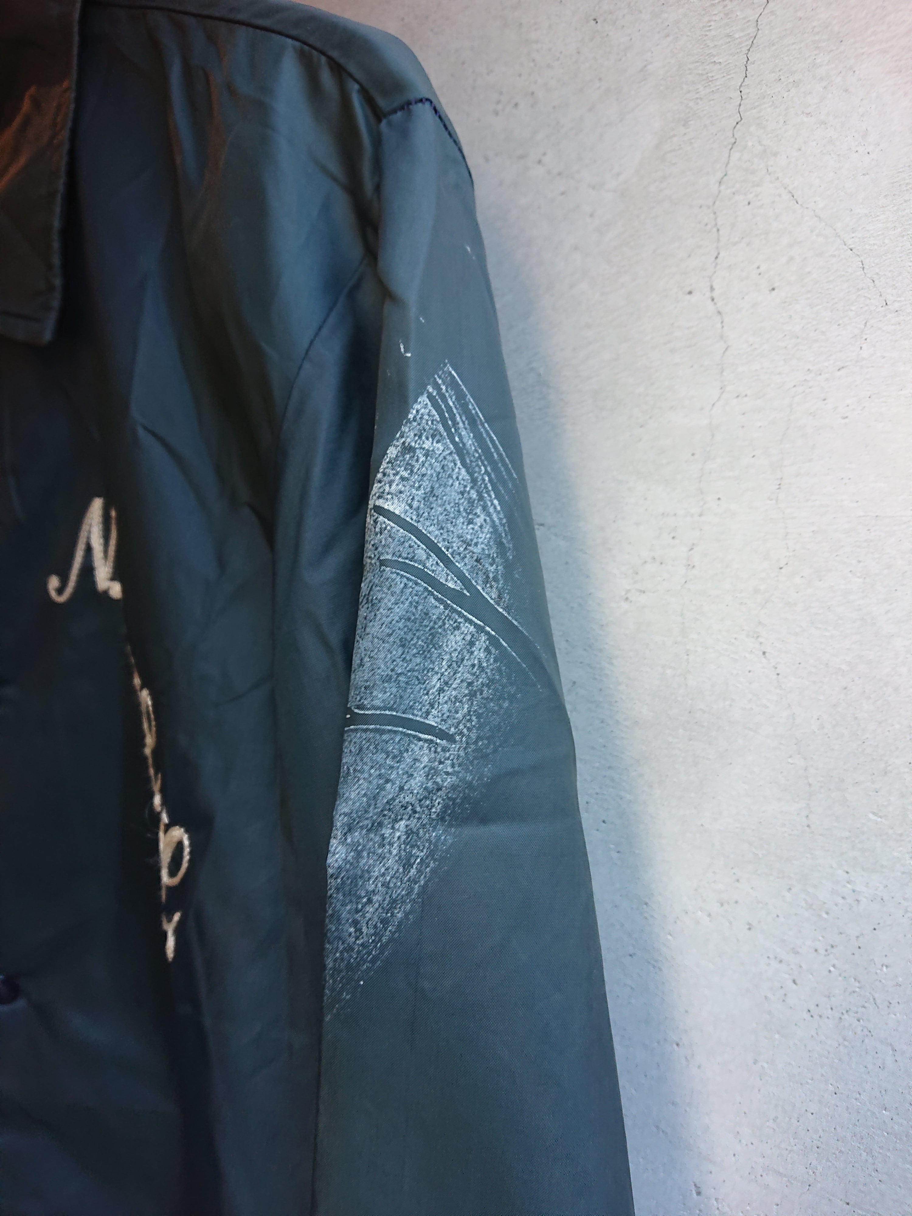 雰囲気抜群!男前なヴィンテージ コーチジャケットになります。ポケット無しのタイプで左胸と右裾に刺繍が入ります。左腕にペンキ汚れ、両袖口のゴムは取れてます。本来裾に紐が入ってたのは欠損。多少の汚れも全然ありの一着。裏地無しでカラーはネイビーになります。