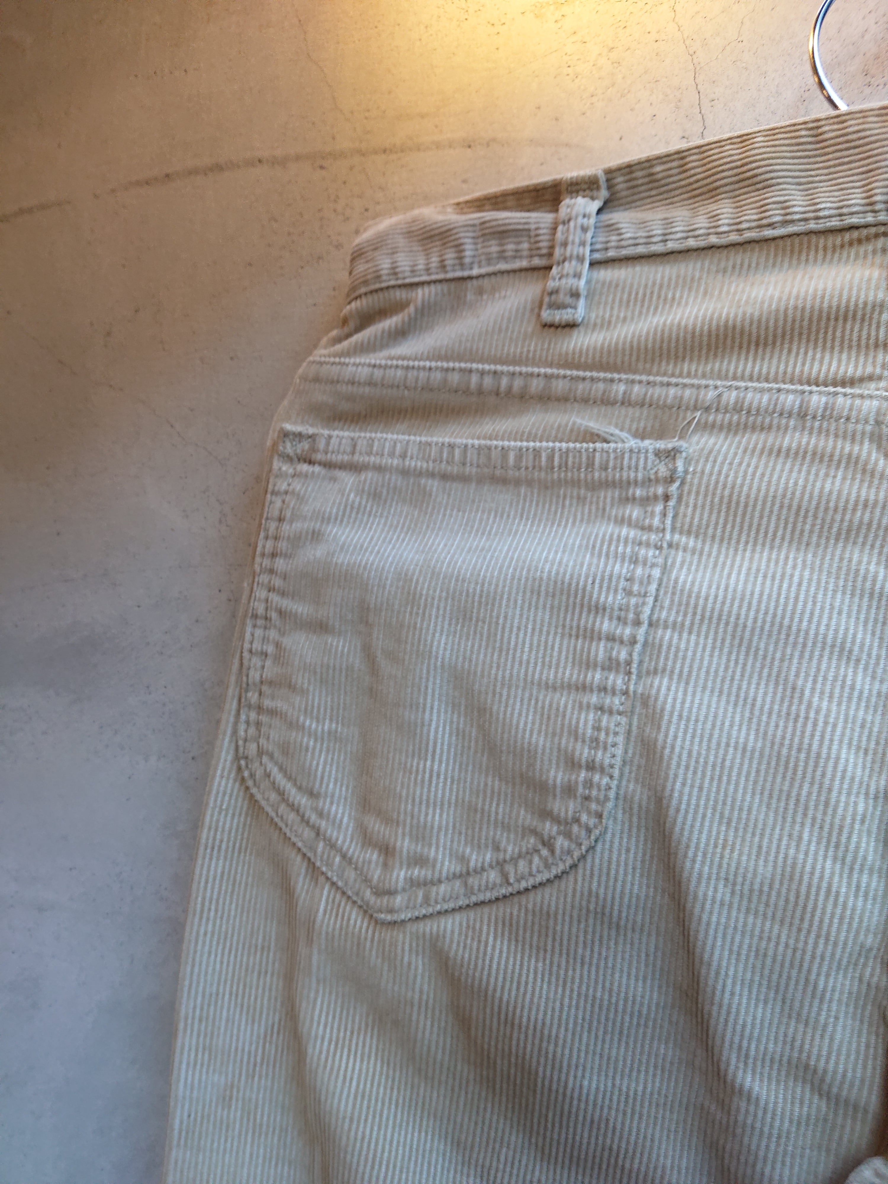 1970年代 Leens コーデュロイパンツになります。Leens(リーンズ)はLeeが1965年に登場させたスリムテーパードシルエットのパンツシリーズで、主に1960年代から70年代にかけて人気を博し、アイビーリーガーにも愛されました。Leeの"Lean(痩せた)" と "Jeans"を組み合わせた名前で スリムな着こなしが特徴。Leensは Levi's 606のLee版とも呼ばれたりもしてます。ベージュカラーのコーデュロイで多少汚れもありますが雰囲気ある一本となっております。