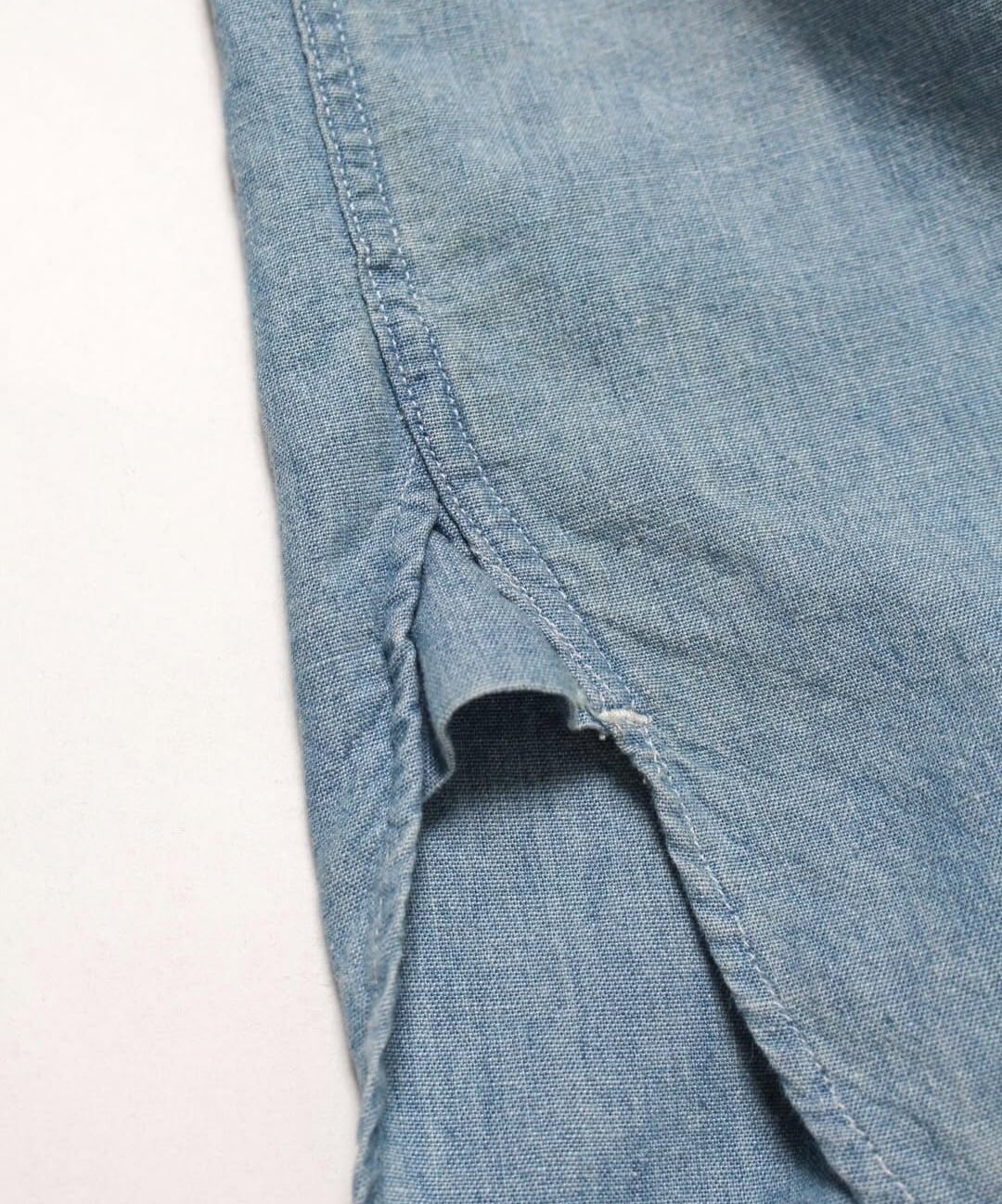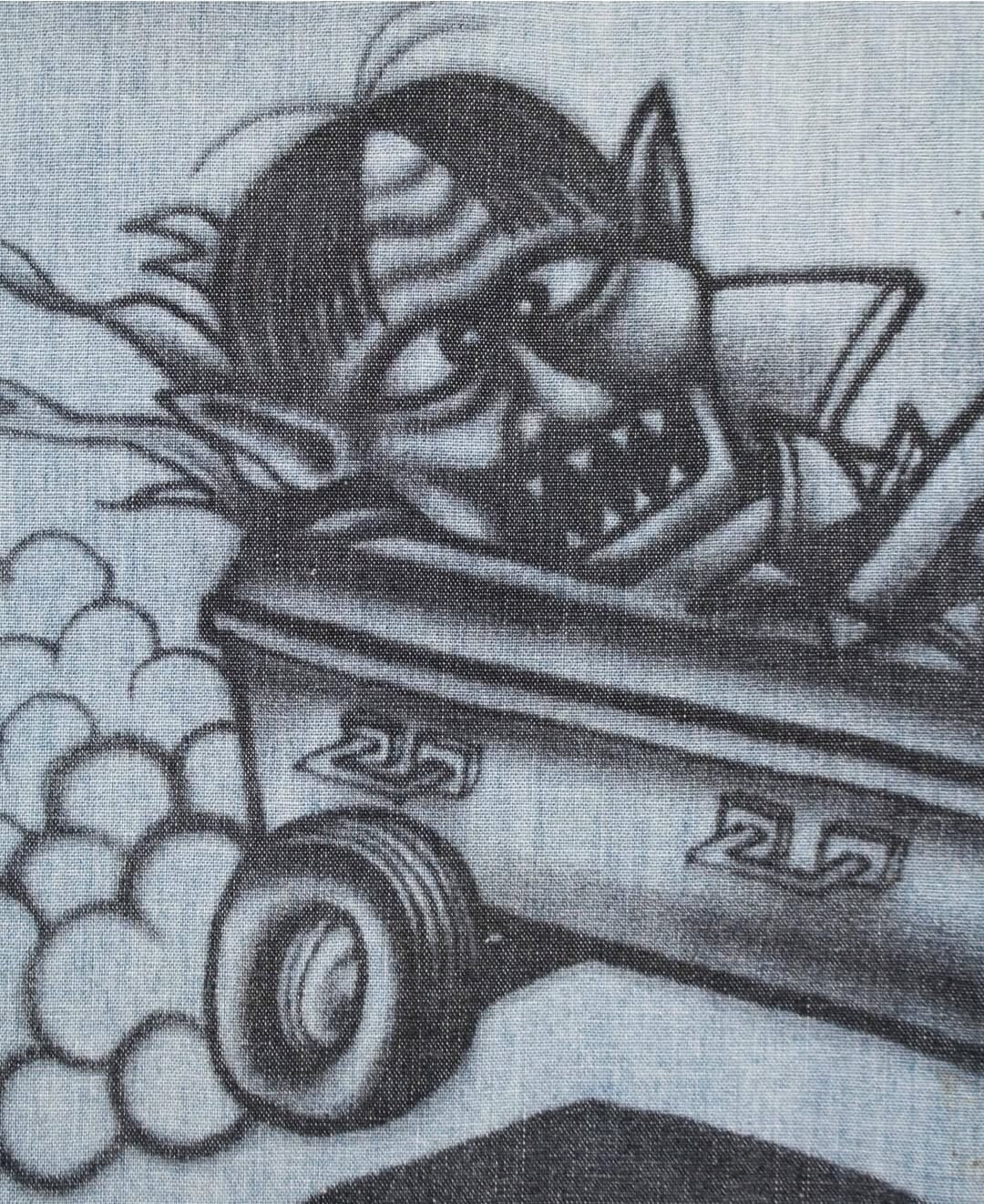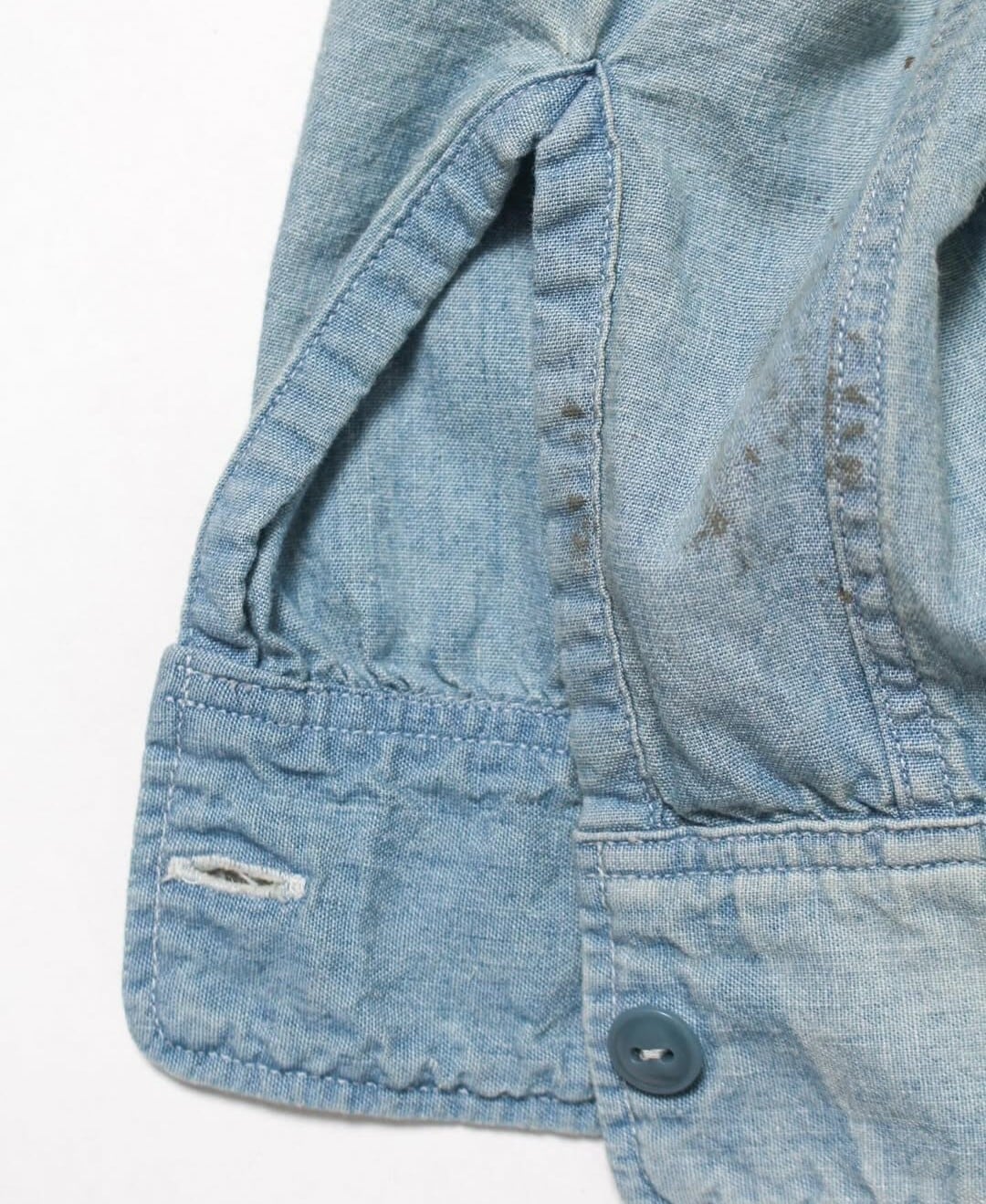 1940年代のUS NAVY兵士が日常作業や甲板作業、整備作業などで着用していたシャンブレーシャツ初期タイプ。ビンテージシャンブレーシャツは、ワークシャツでも多く見受けられるが、US NAVYものは別格であり、甲板作業で日焼けし、汚れたその様子は、ワークシャツとは異なる独特の雰囲気を放っている。軍での使用を終えた後、家に持ち帰った兵士が愛するロウブローアーティストにエアブラシを吹き付けてもらったというエピソードに基づいて製作された。この物語をイメージし、ロウブローアーティスト 「SKETCH」に依頼して仕上げた本作は、ゾンビモンスターデザインが施されたスペシャル仕様。