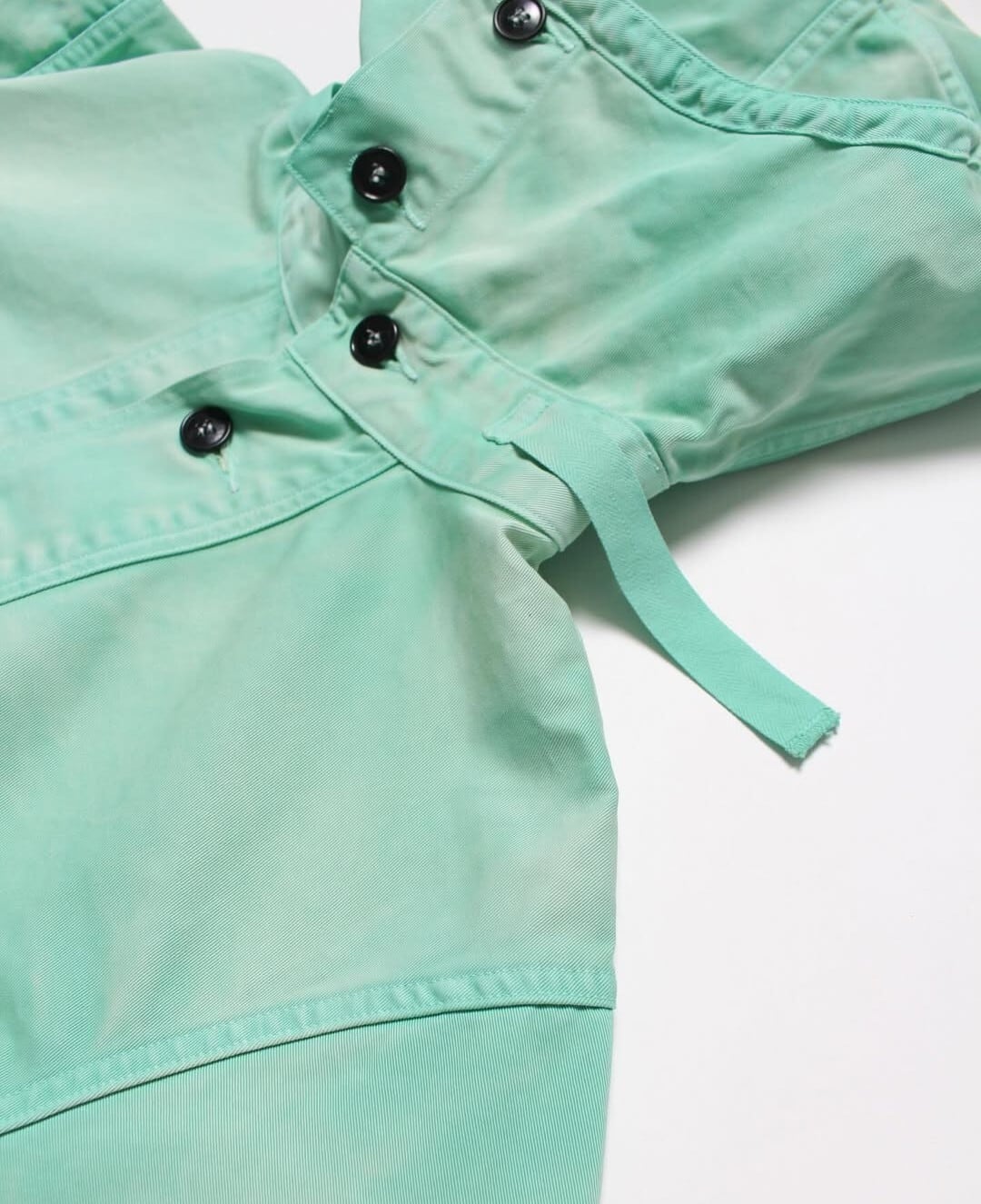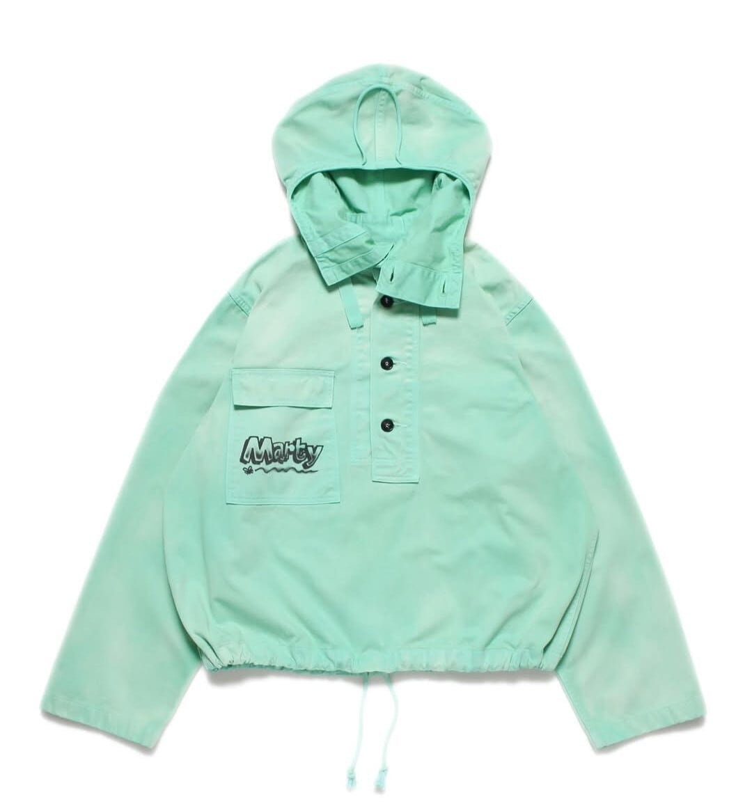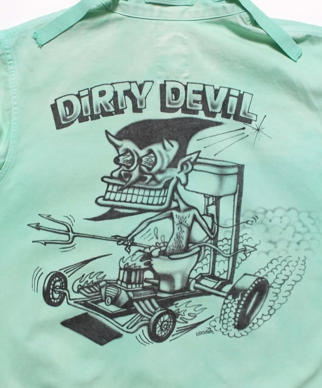 1940年代のUS NAVYが甲板で使用していたサルベージ防寒具をモチーフにしたパーカーのスタンドヘンリーネック仕様初期型タイプ。当時、部隊ごとに染め分けられたパーカーは、独特の退色感と雰囲気を持ち、 ヴィンテージラバーに愛される異様なオーラを放っている。軍での使用を終えた後、払下げられたパーカーはロウブローアーティストのキャンバスや、チームウェアとして使用されることもあり、時おりスーパービンテージとして発見されることがある。このアイテムは、そのような歴史的背景をイメージし、ロウブローアーティスト 「SKETCH」に依頼。SKETCHがイメージする色で染められ、デビルモンスターエアブラシデザインが施されたスペシャル仕様。