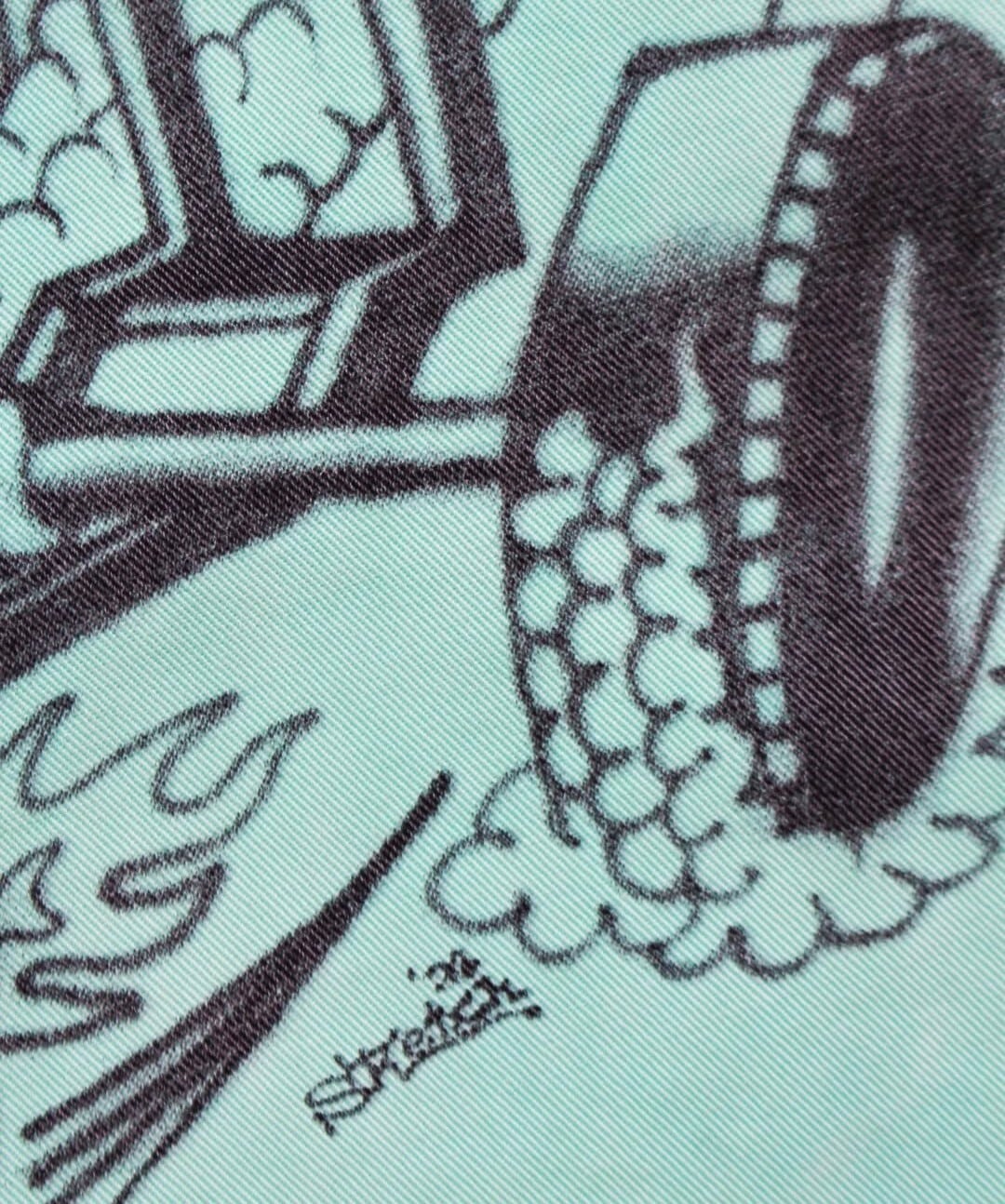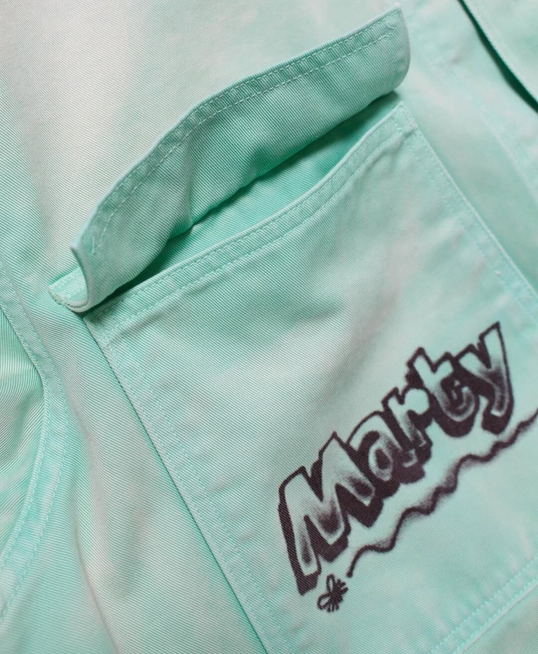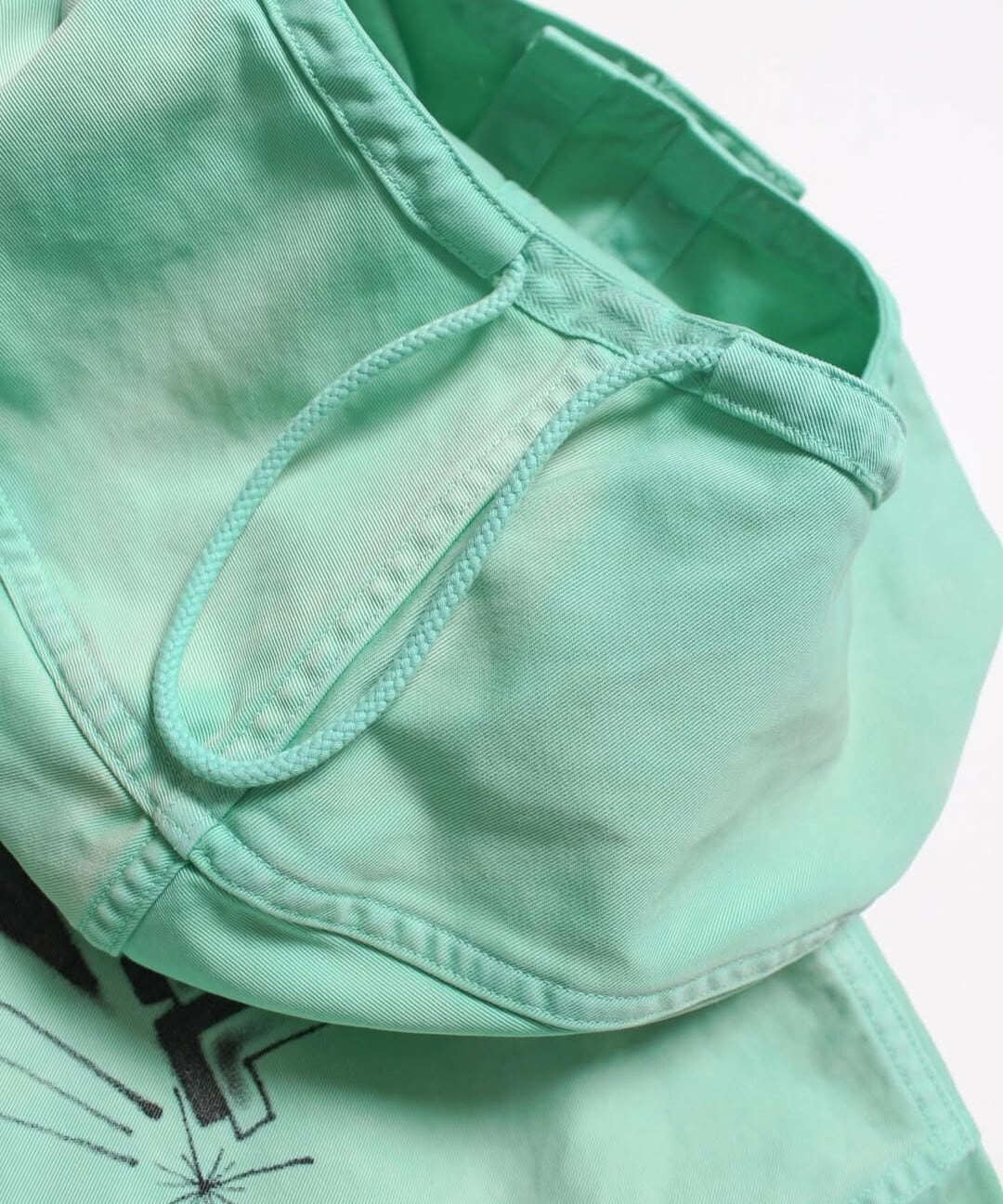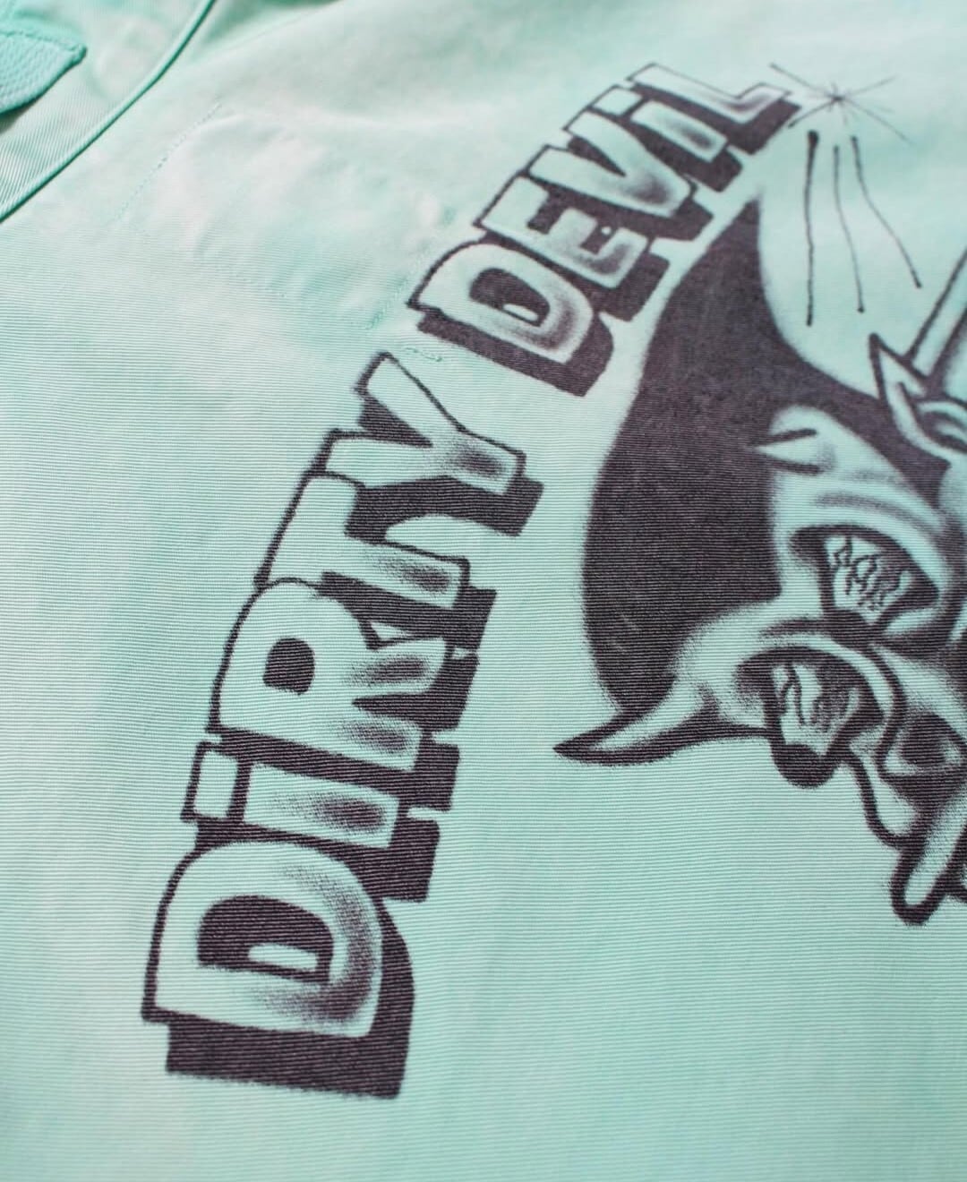 1940年代のUS NAVYが甲板で使用していたサルベージ防寒具をモチーフにしたパーカーのスタンドヘンリーネック仕様初期型タイプ。当時、部隊ごとに染め分けられたパーカーは、独特の退色感と雰囲気を持ち、 ヴィンテージラバーに愛される異様なオーラを放っている。軍での使用を終えた後、払下げられたパーカーはロウブローアーティストのキャンバスや、チームウェアとして使用されることもあり、時おりスーパービンテージとして発見されることがある。このアイテムは、そのような歴史的背景をイメージし、ロウブローアーティスト 「SKETCH」に依頼。SKETCHがイメージする色で染められ、デビルモンスターエアブラシデザインが施されたスペシャル仕様。