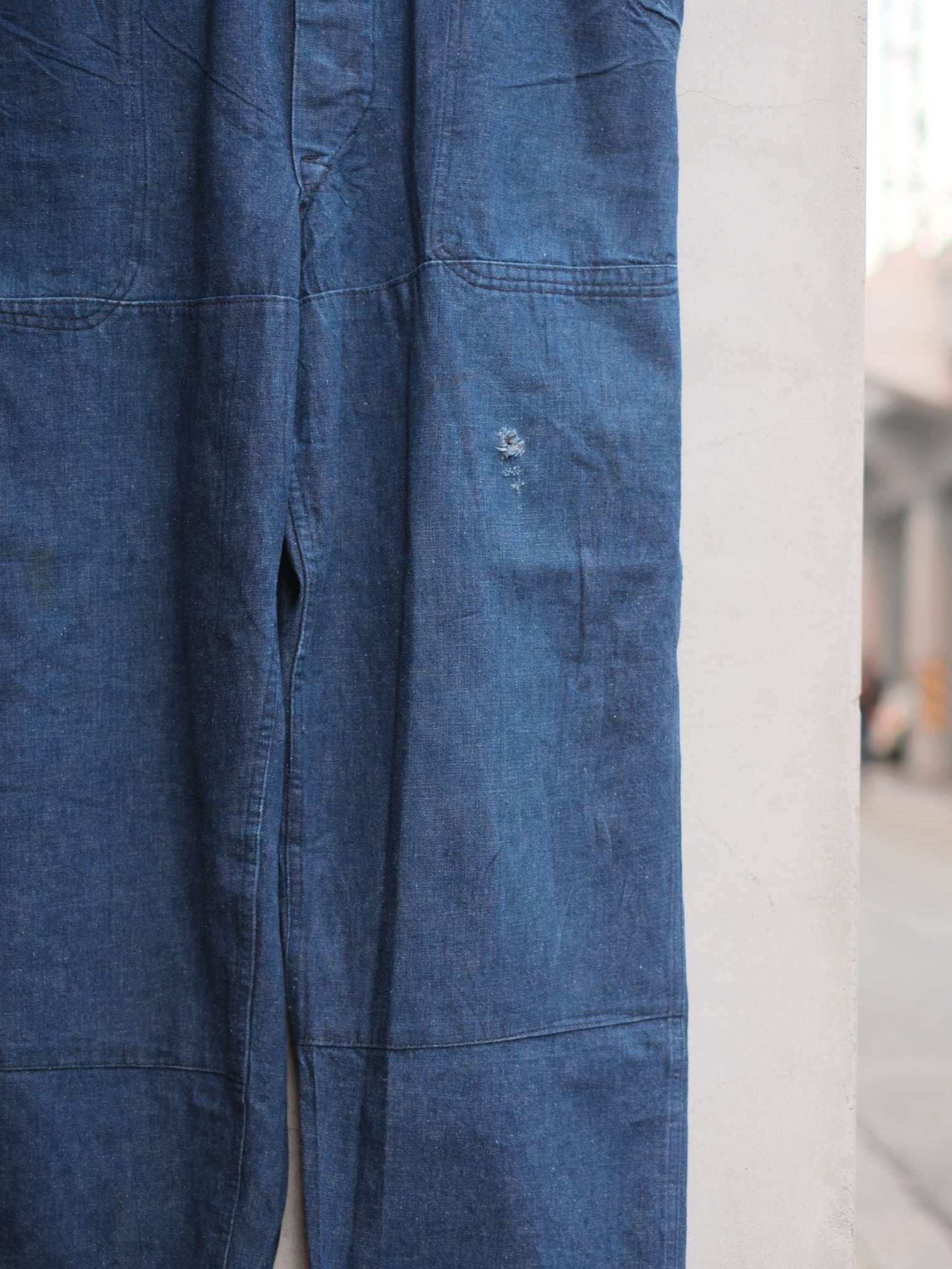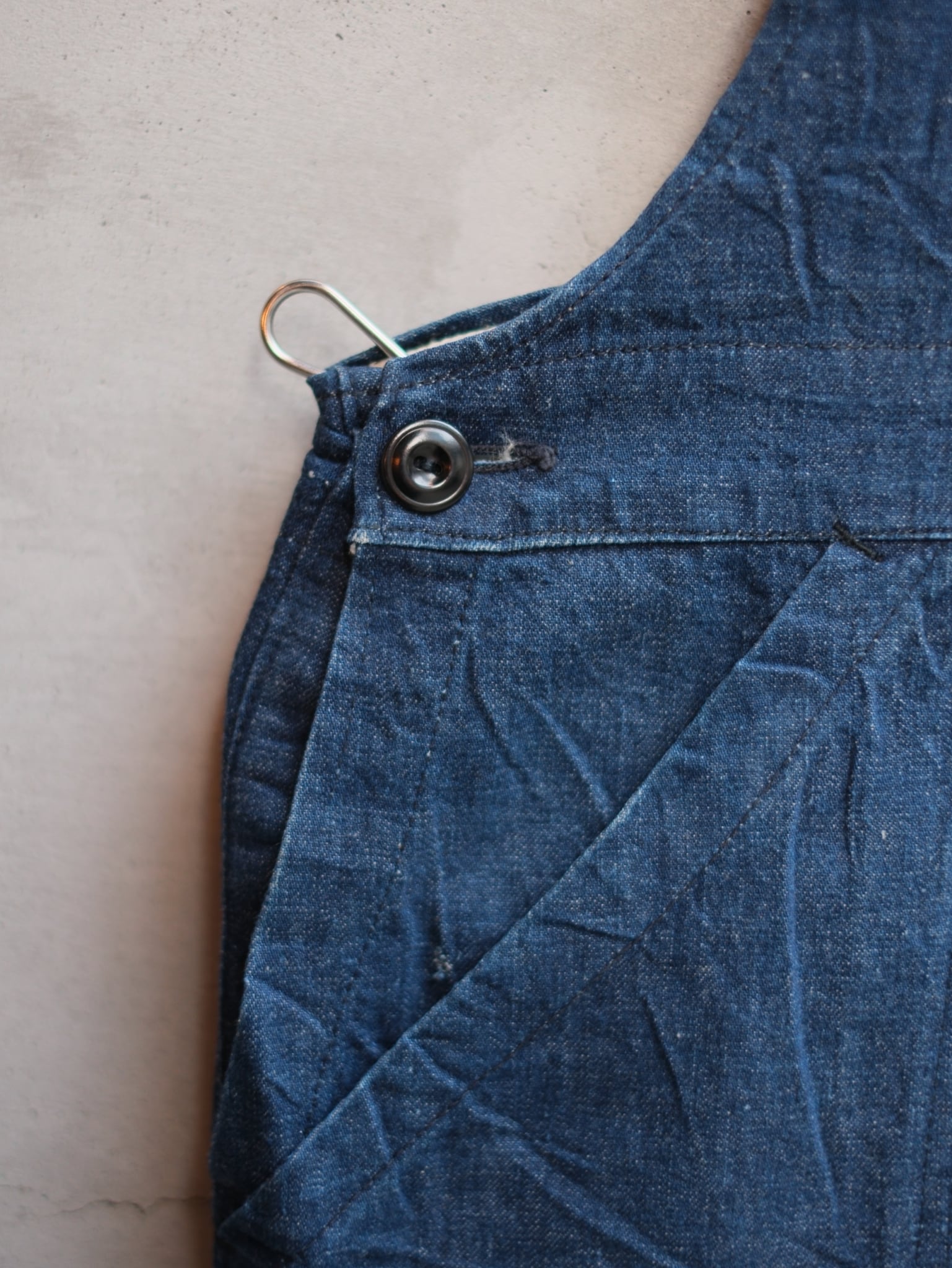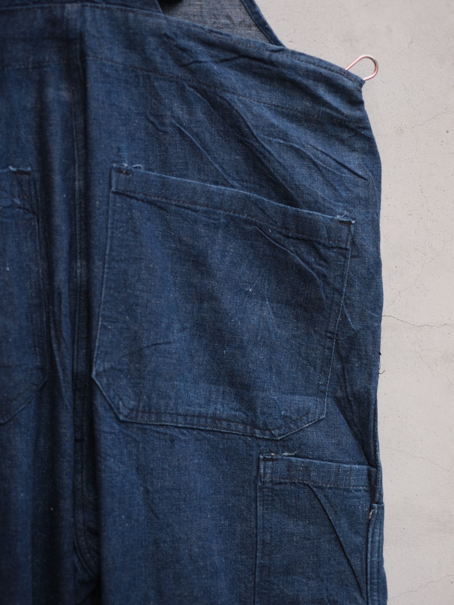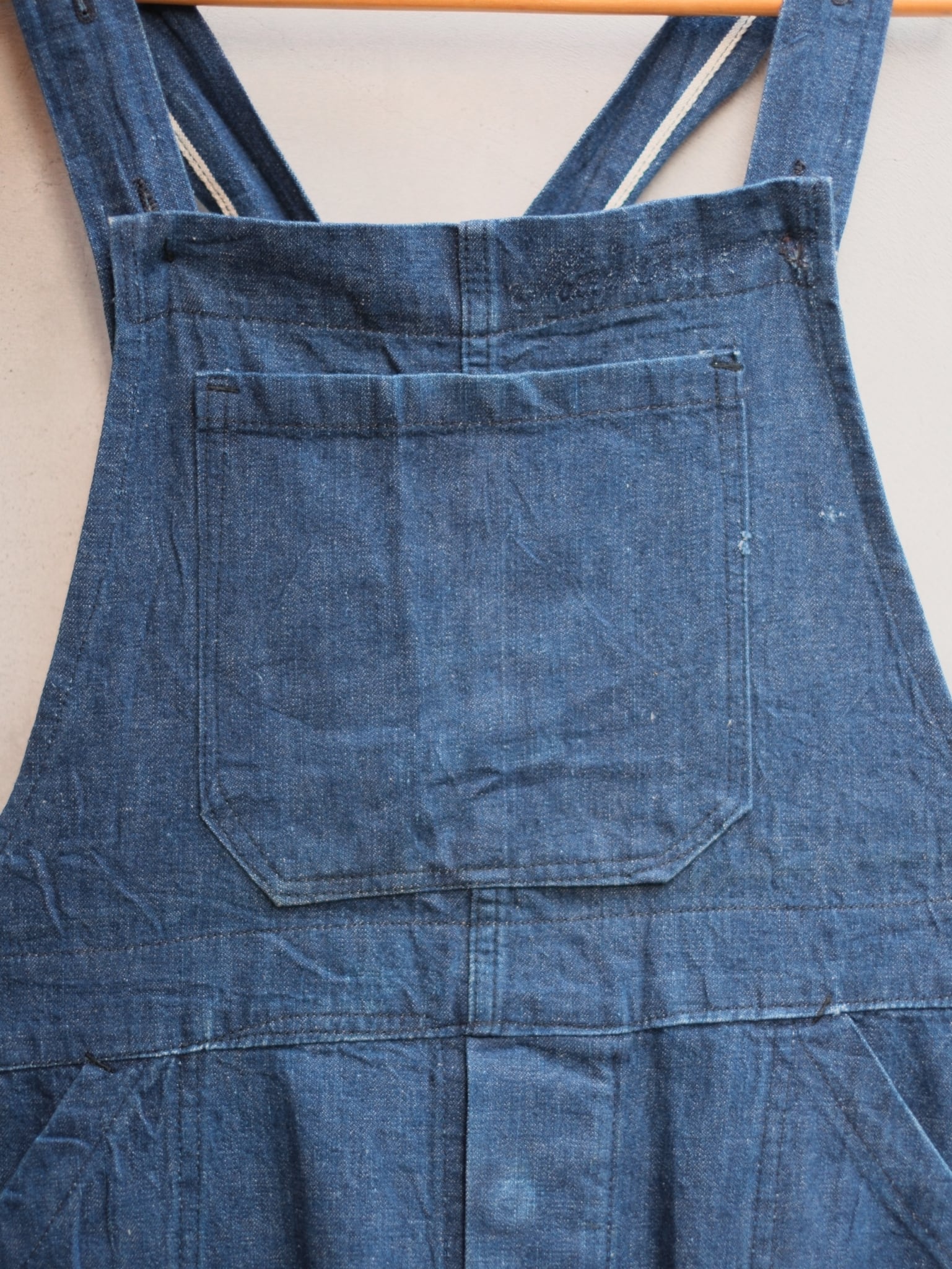 1940年代頃のデニムオーバーオールになります。ビブに1ポケットのスタイル。肩ストラップはボタン仕様。ダブルニーでポケットと重なってるのはポイント高いですね。ブランドタグは欠損してありませんが、このデザインは魅力的。左膝辺りに傷がありますが着用に問題はありません。色も濃くこれからの色落ちに期待できる一本です。裾はロールアップした状態で直されてます。