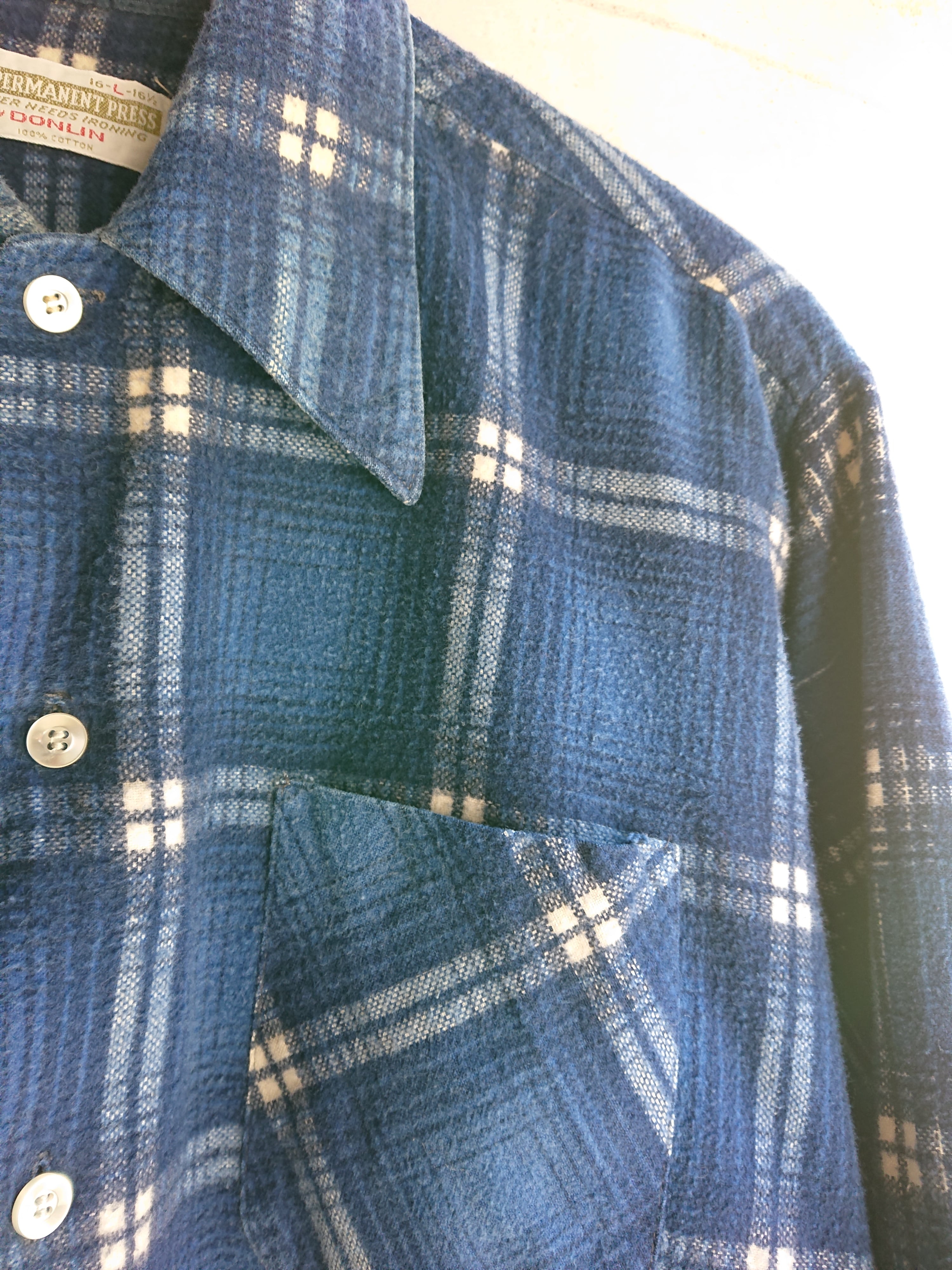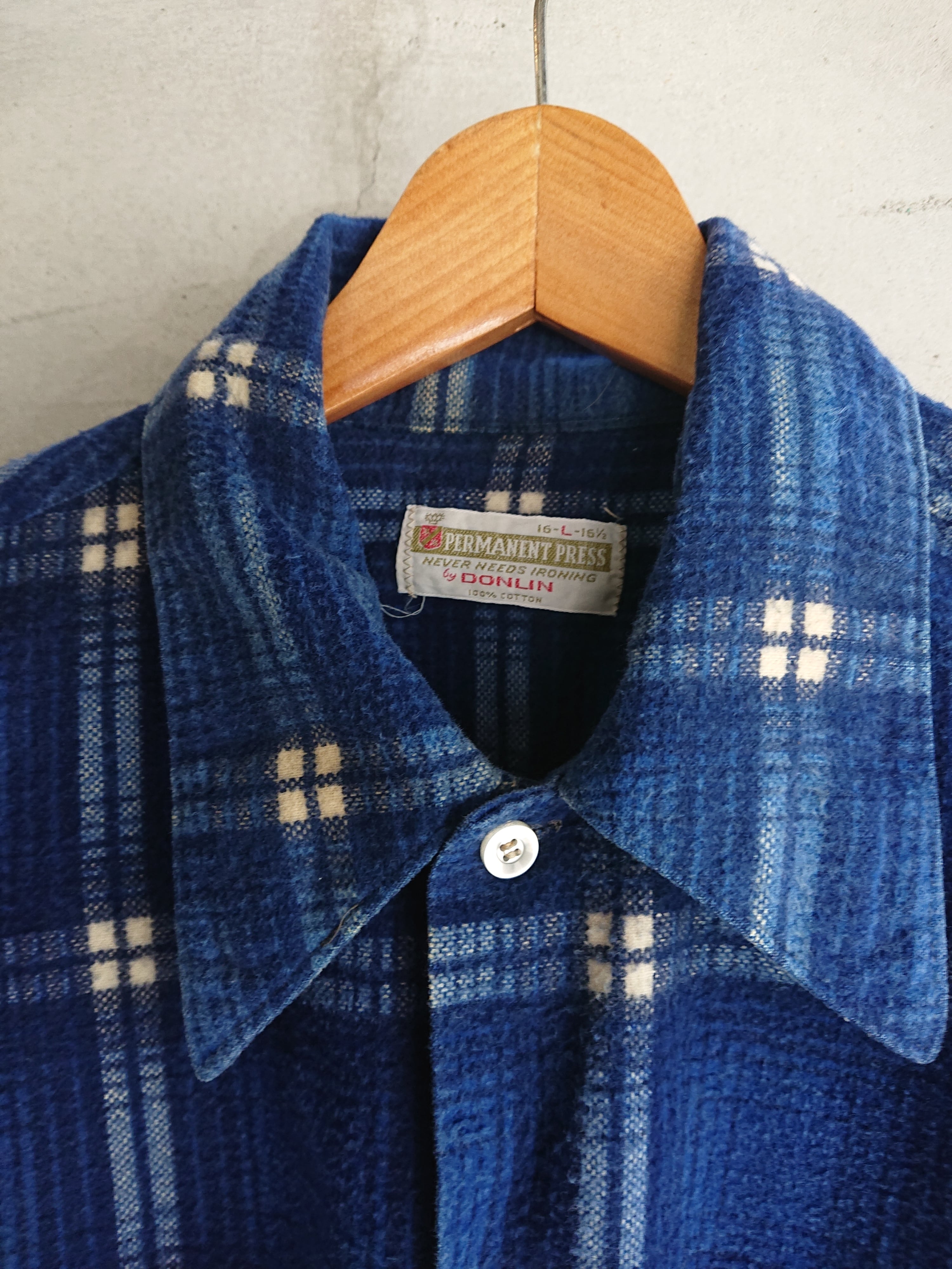 1970年代 DONLINのプリントネルになります。ブルーベースのチェック柄。シンプルに格好良いです。コンディション、サイズ共に良く、これから春に向けても一軍で活躍してくれるアイテムです。