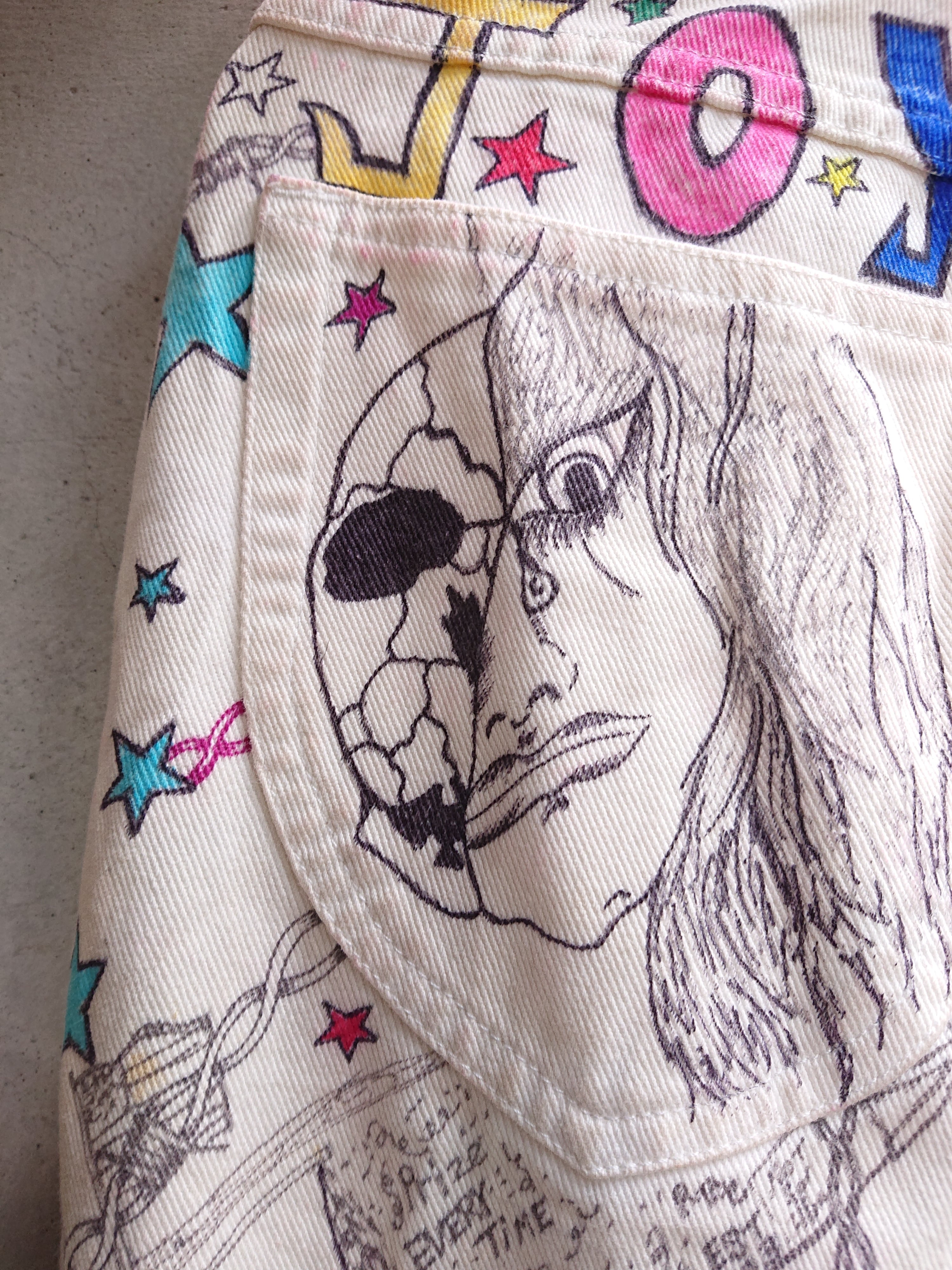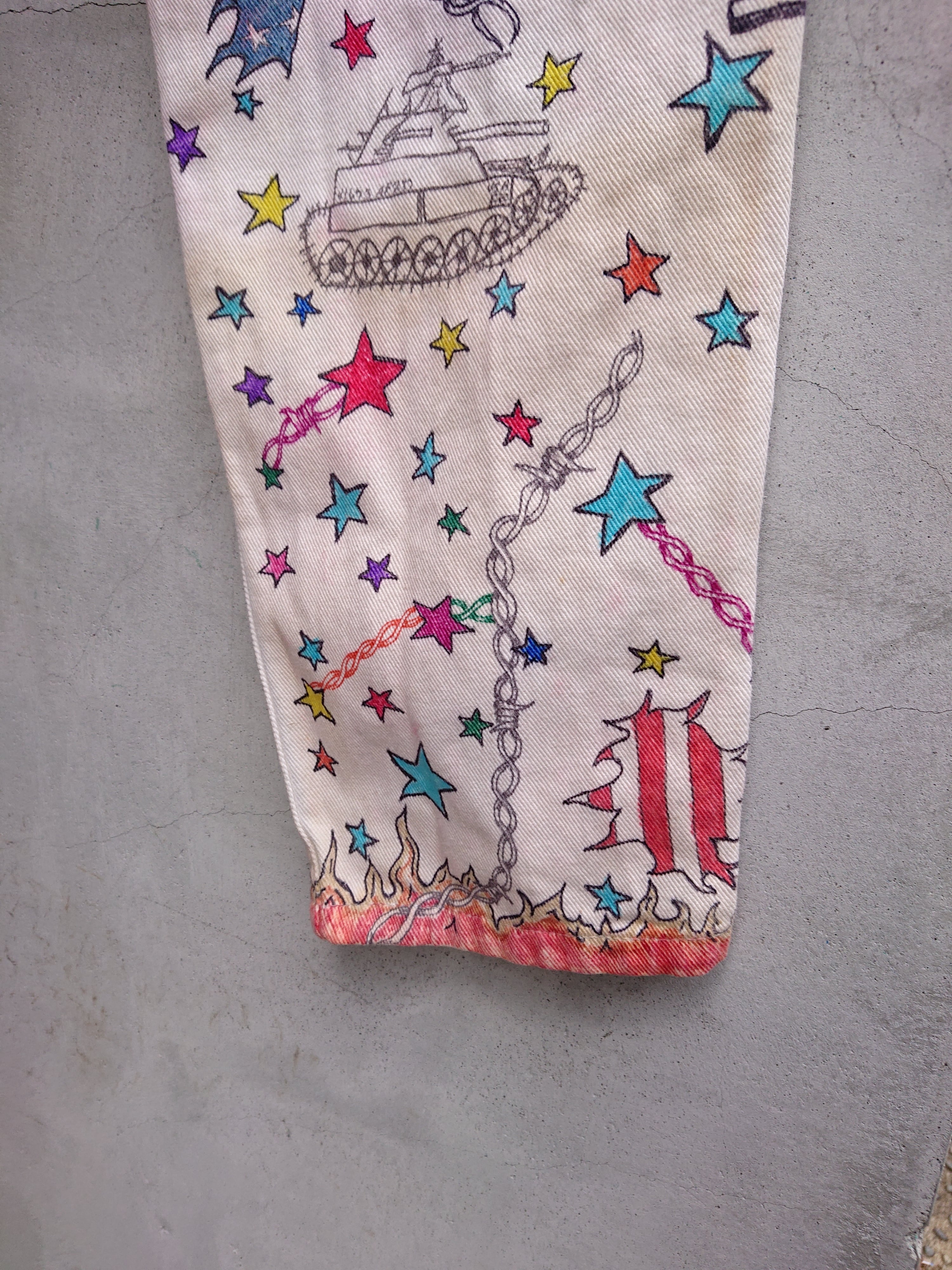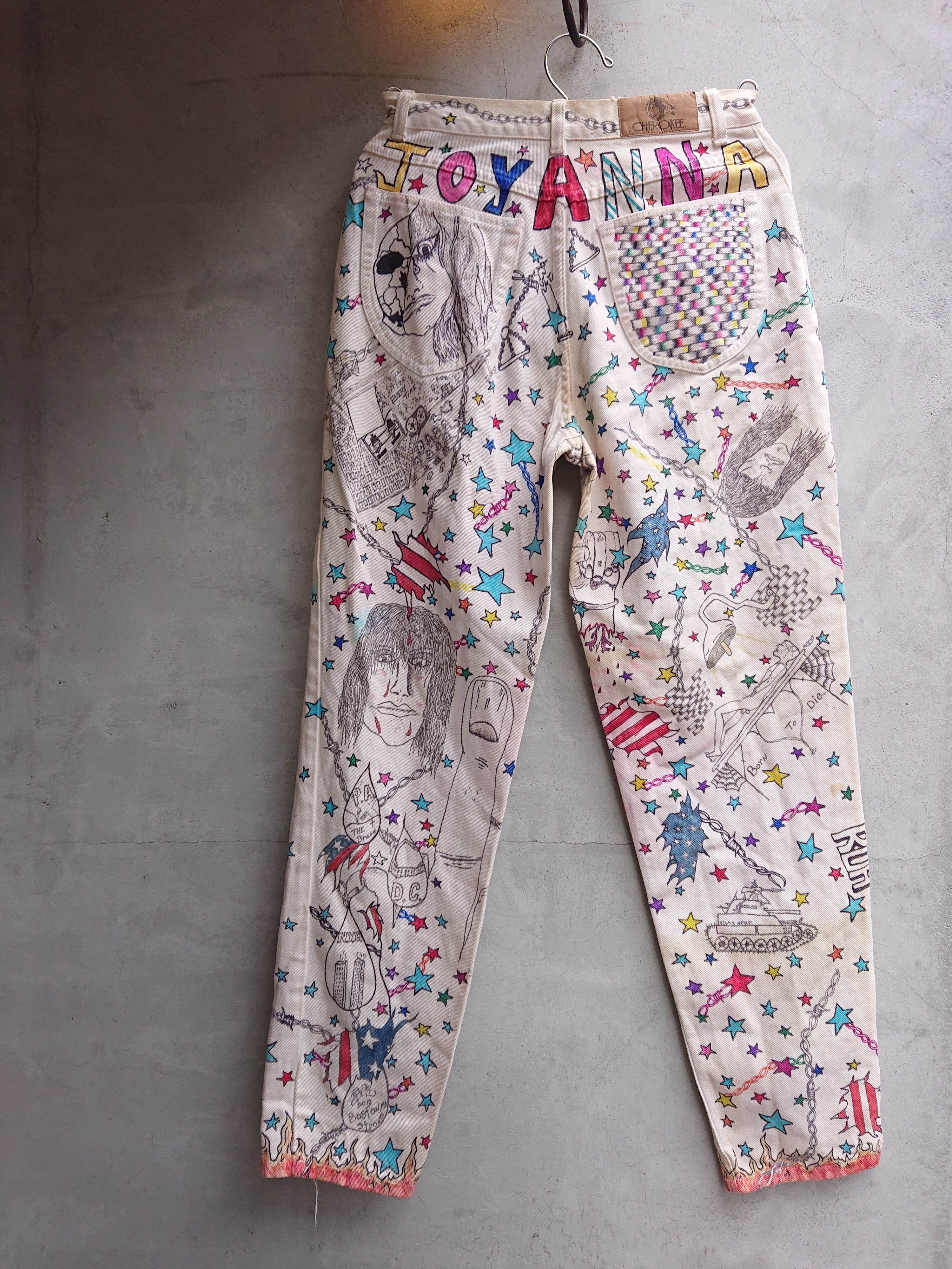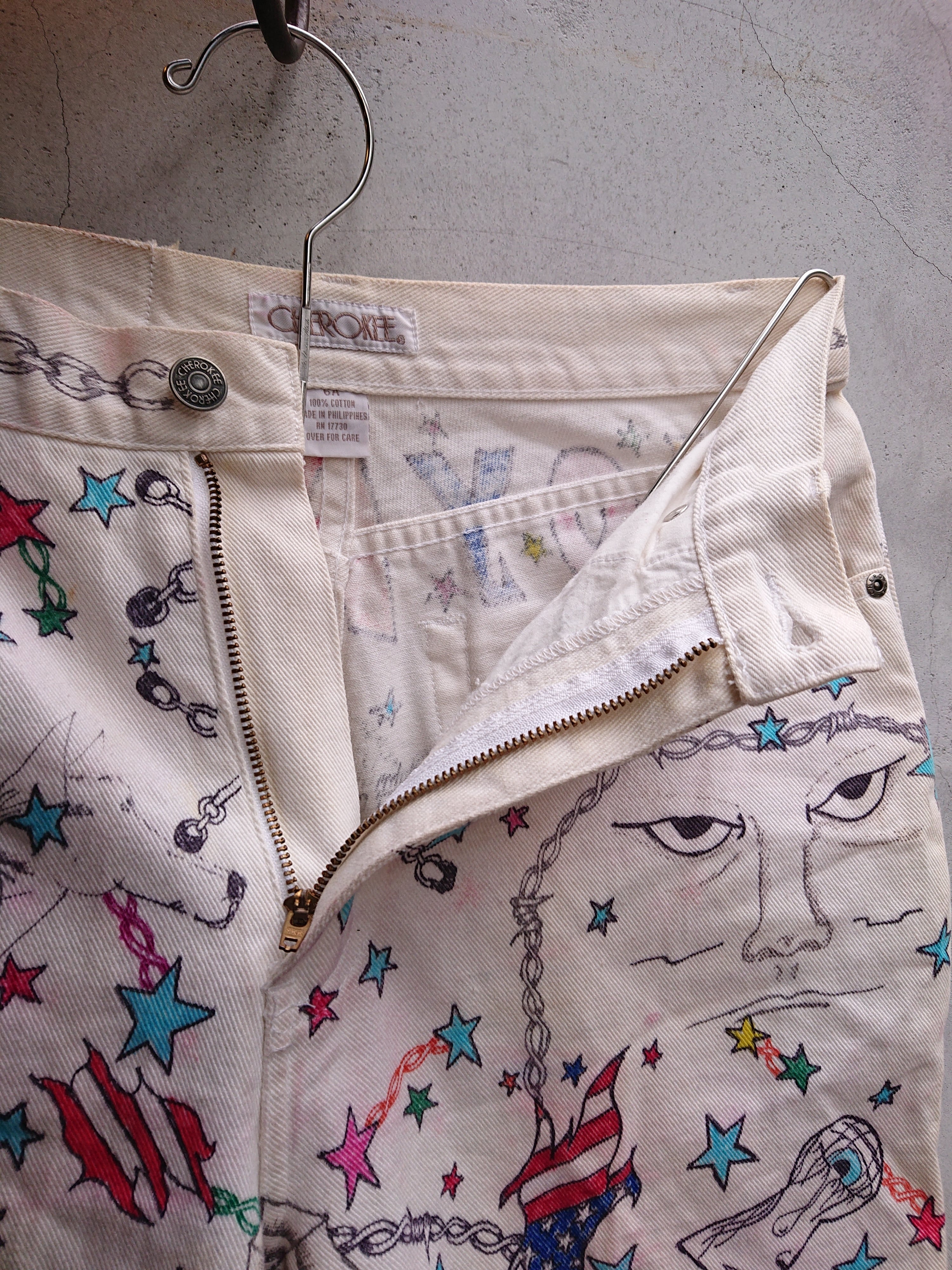 1980s CHEROKEE HAND PAINTED PANTS PRICE : 24800+tax (27280 tax included) SIZE : W70cm L75cm OUTSEAM 103cm 1980年代 ハンドペイントパンツになります。全体を埋め尽くすハンドペイントは圧巻!パンツはパッチにインディアンフェイスがプリントされた80年代のCHEROKEEホワイトデニム。パンクな雰囲気も感じるパンツはアートであり、まさに一点物のスペシャルピースかと思います。