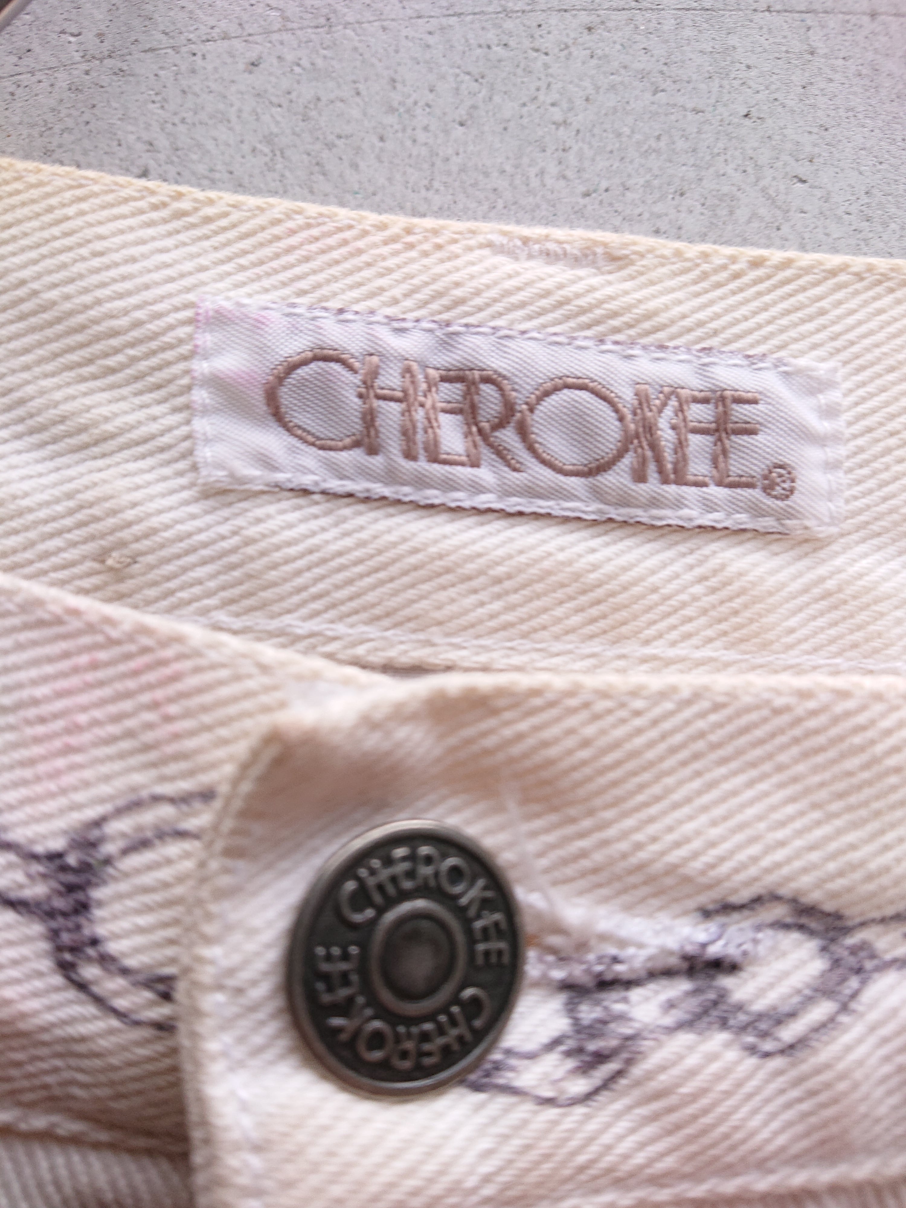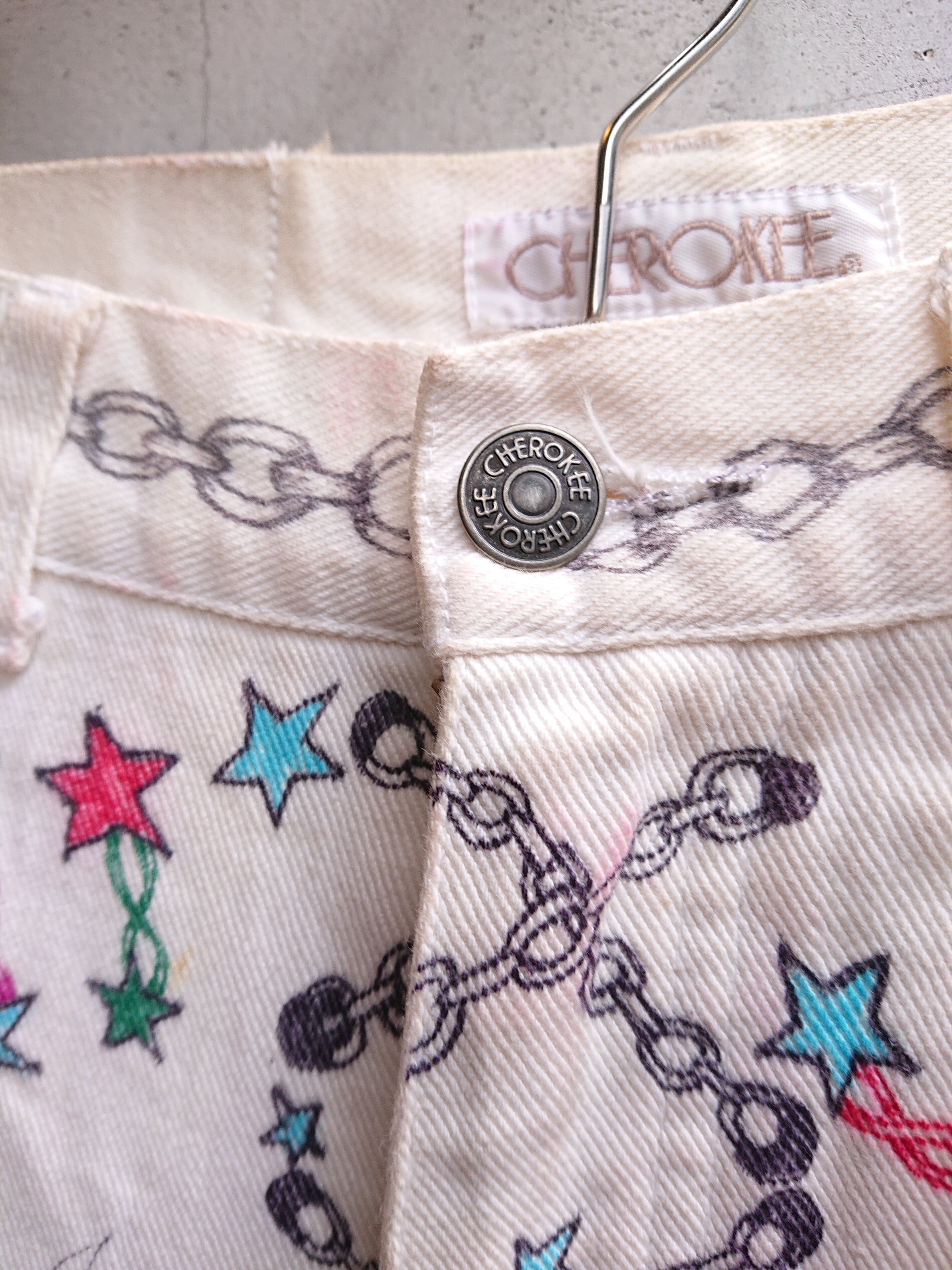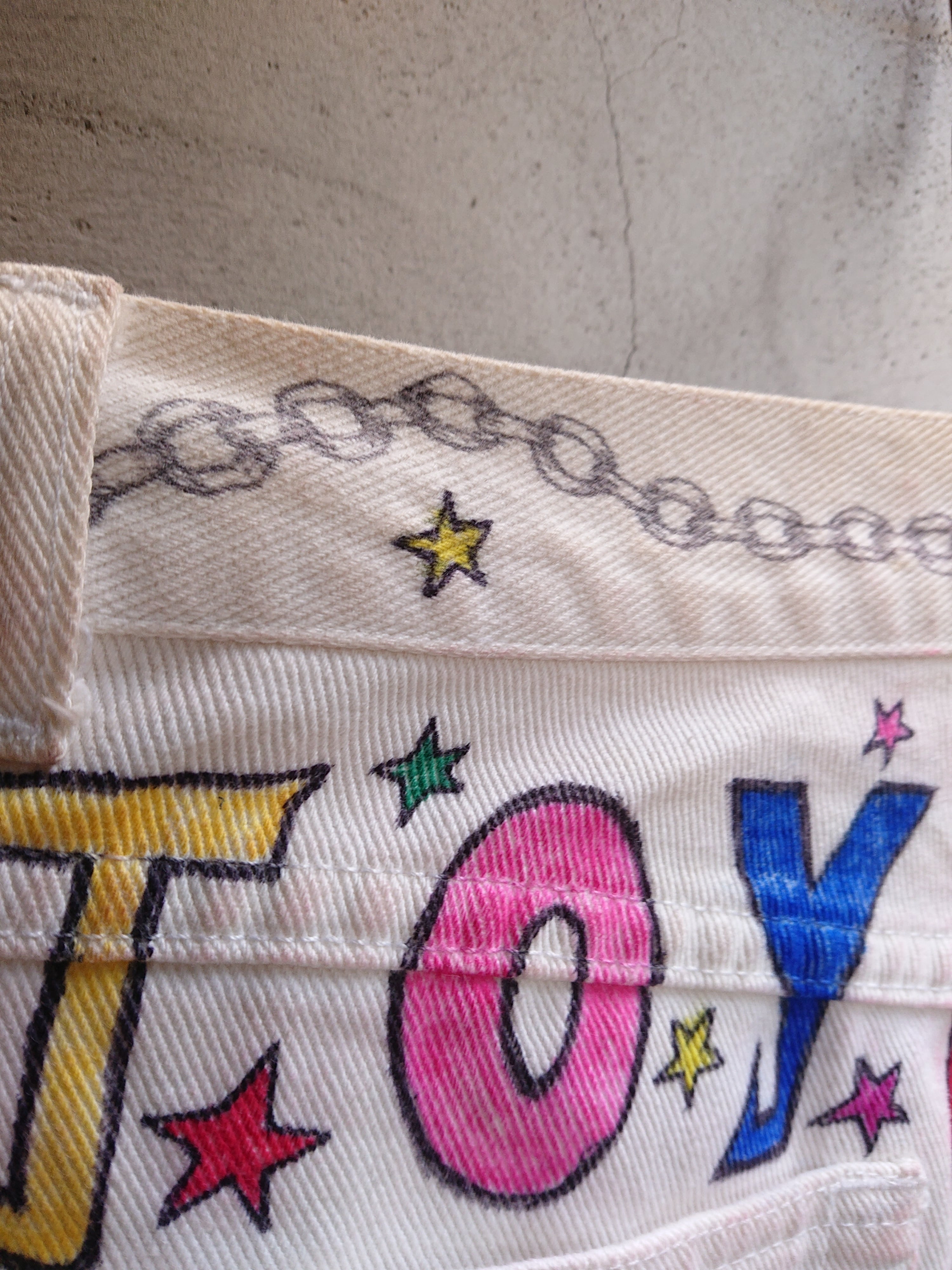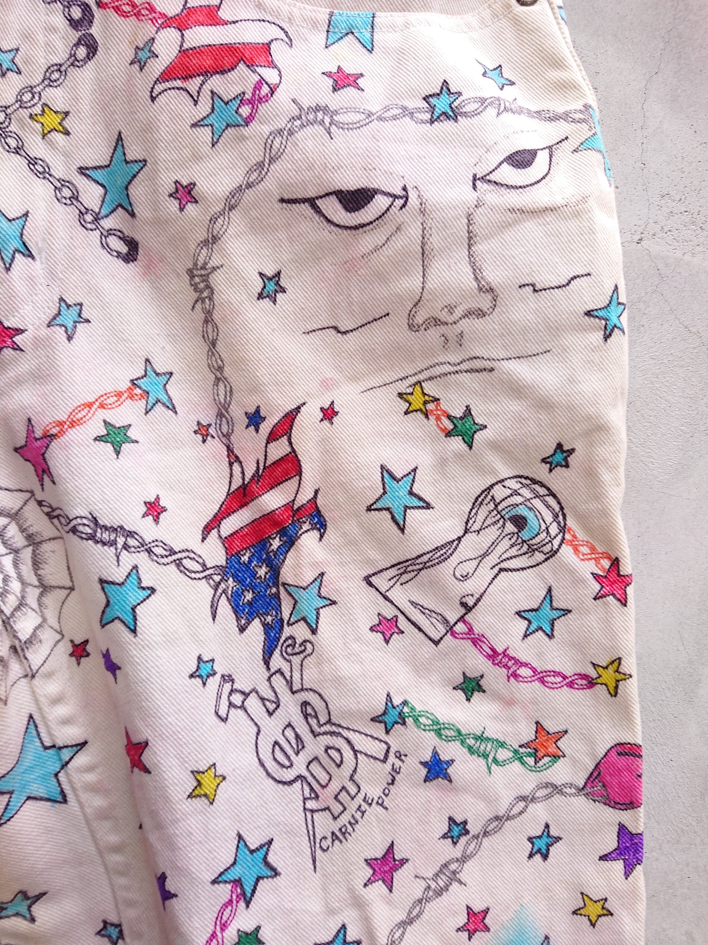 1980s CHEROKEE HAND PAINTED PANTS PRICE : 24800+tax (27280 tax included) SIZE : W70cm L75cm OUTSEAM 103cm 1980年代 ハンドペイントパンツになります。全体を埋め尽くすハンドペイントは圧巻!パンツはパッチにインディアンフェイスがプリントされた80年代のCHEROKEEホワイトデニム。パンクな雰囲気も感じるパンツはアートであり、まさに一点物のスペシャルピースかと思います。