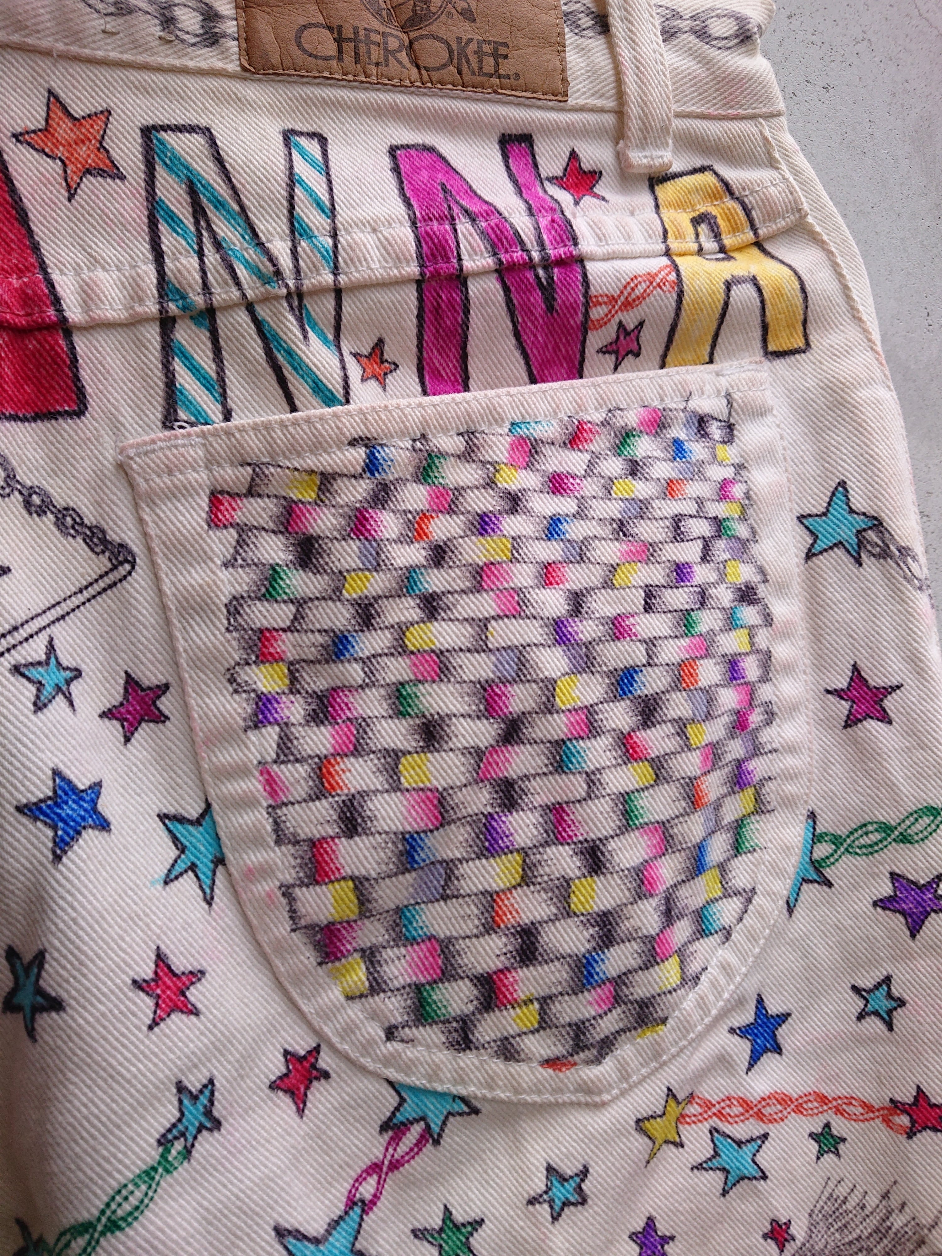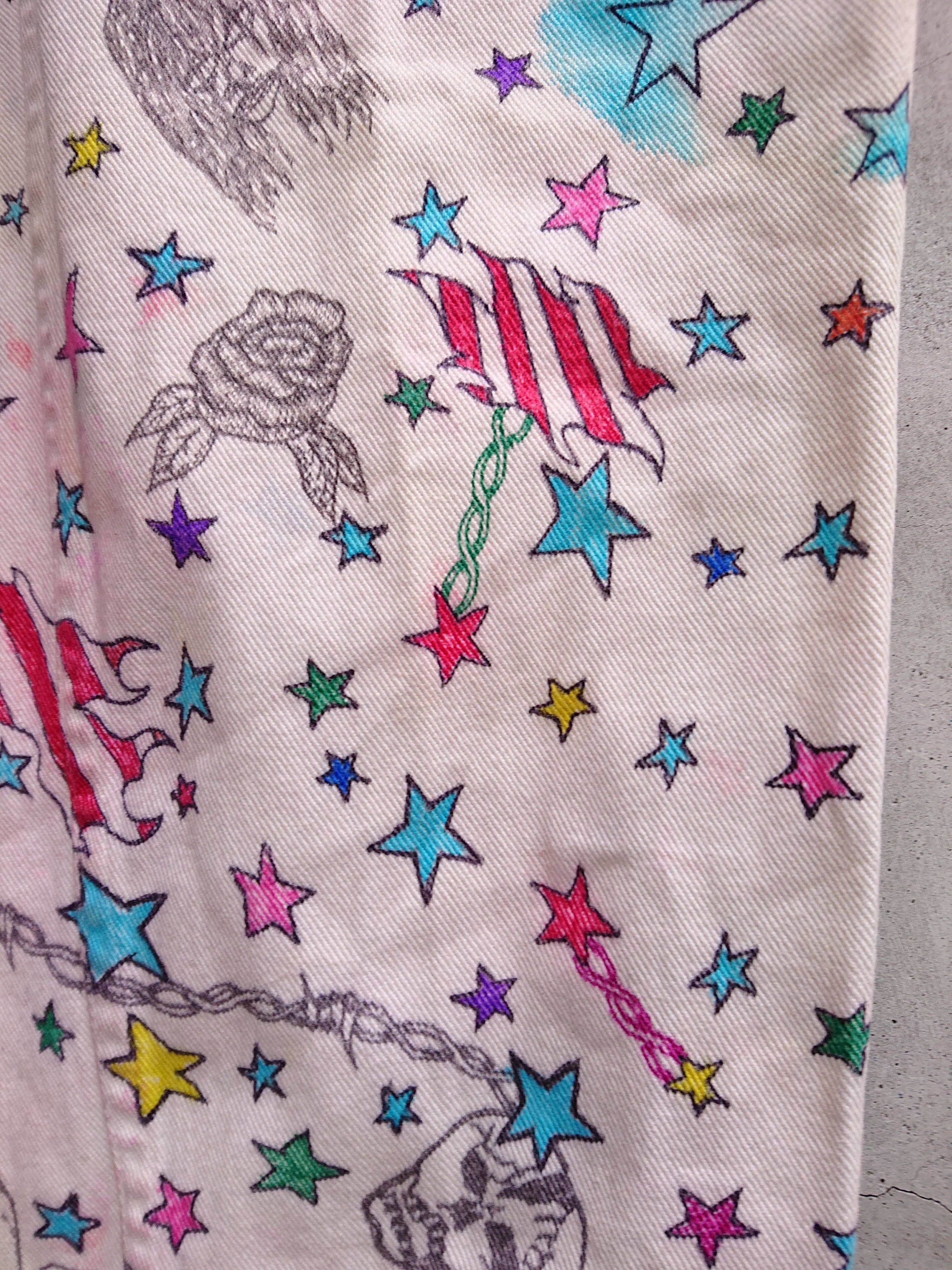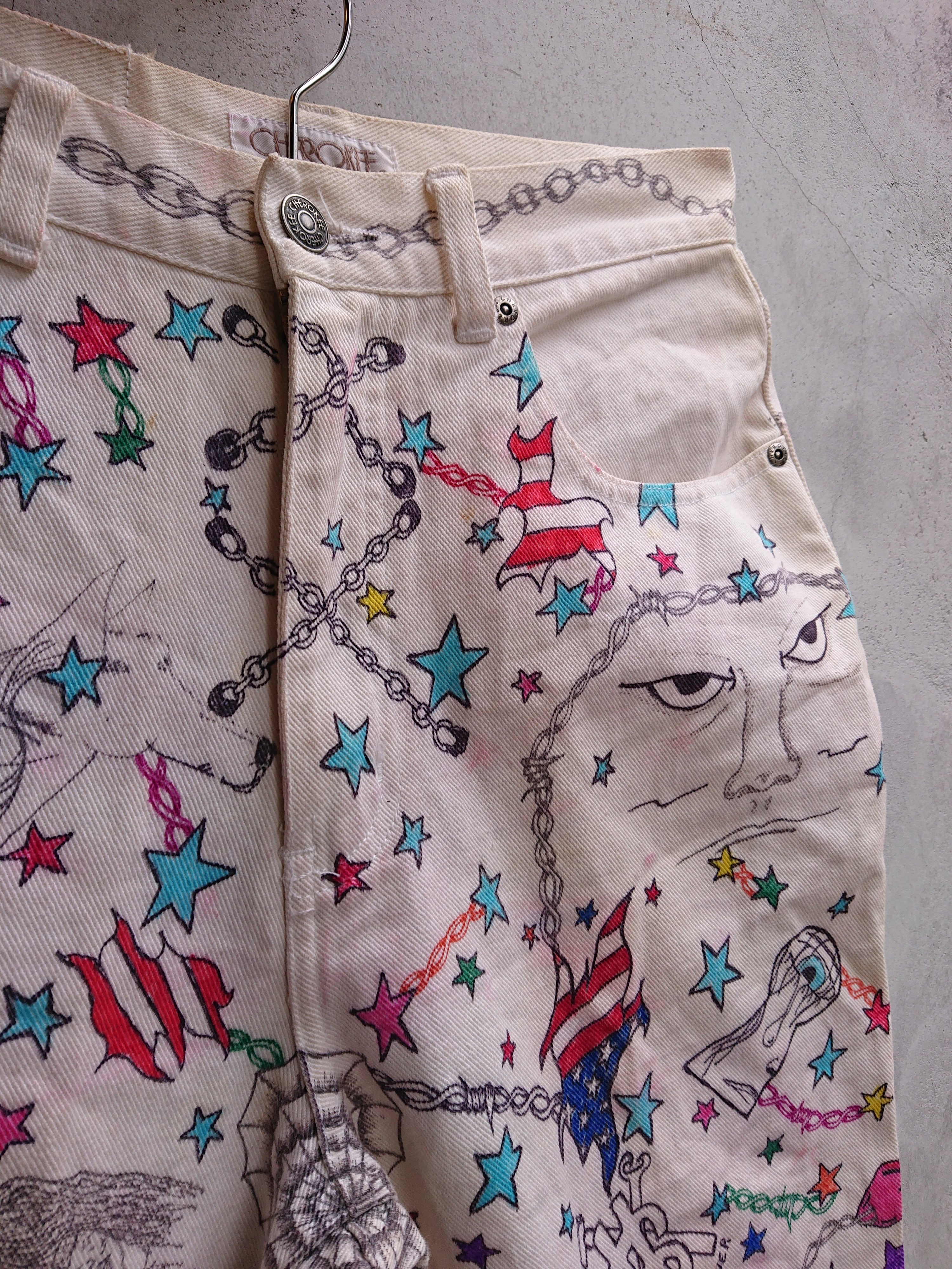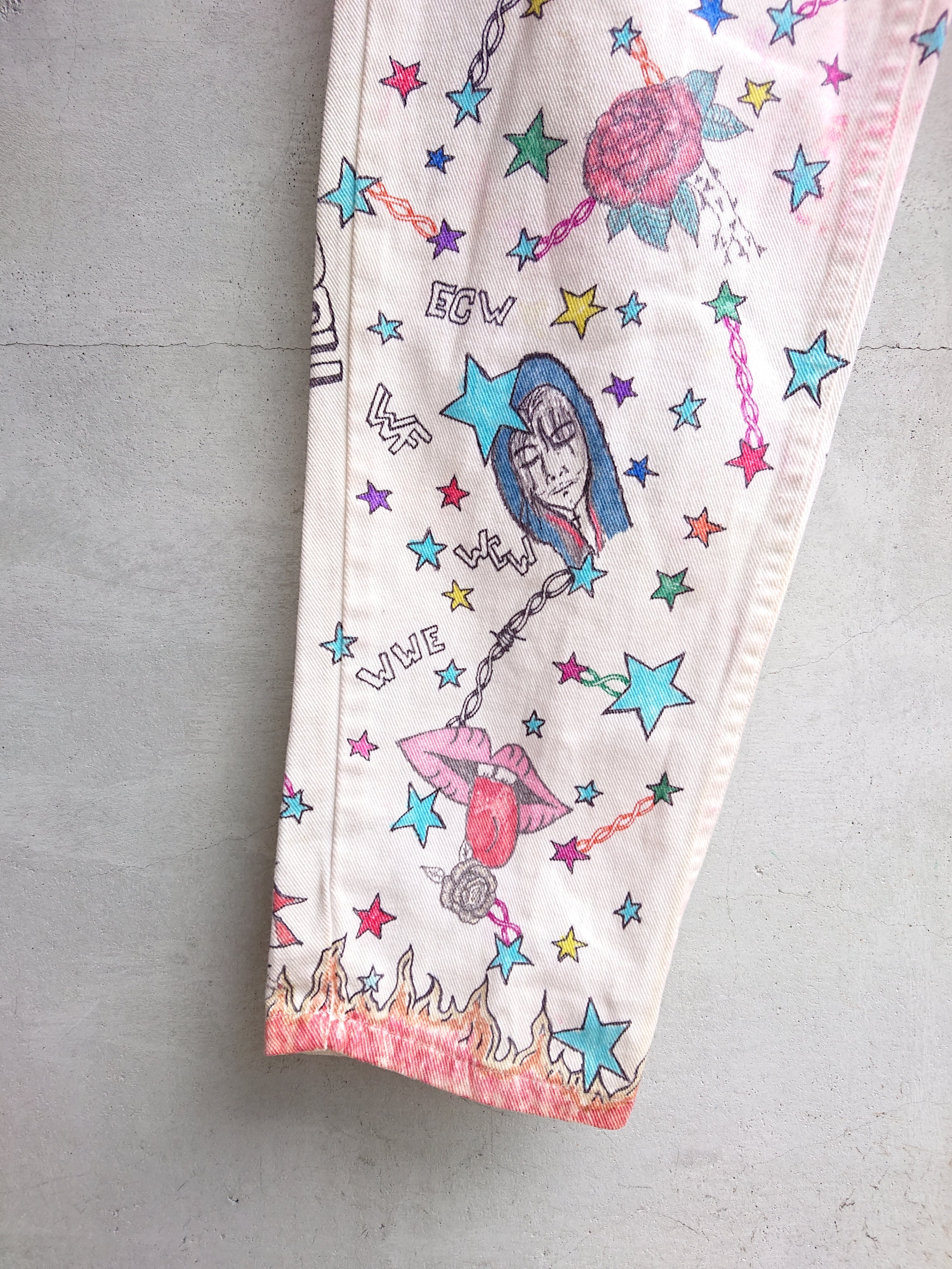 1980s CHEROKEE HAND PAINTED PANTS PRICE : 24800+tax (27280 tax included) SIZE : W70cm L75cm OUTSEAM 103cm 1980年代 ハンドペイントパンツになります。全体を埋め尽くすハンドペイントは圧巻!パンツはパッチにインディアンフェイスがプリントされた80年代のCHEROKEEホワイトデニム。パンクな雰囲気も感じるパンツはアートであり、まさに一点物のスペシャルピースかと思います。