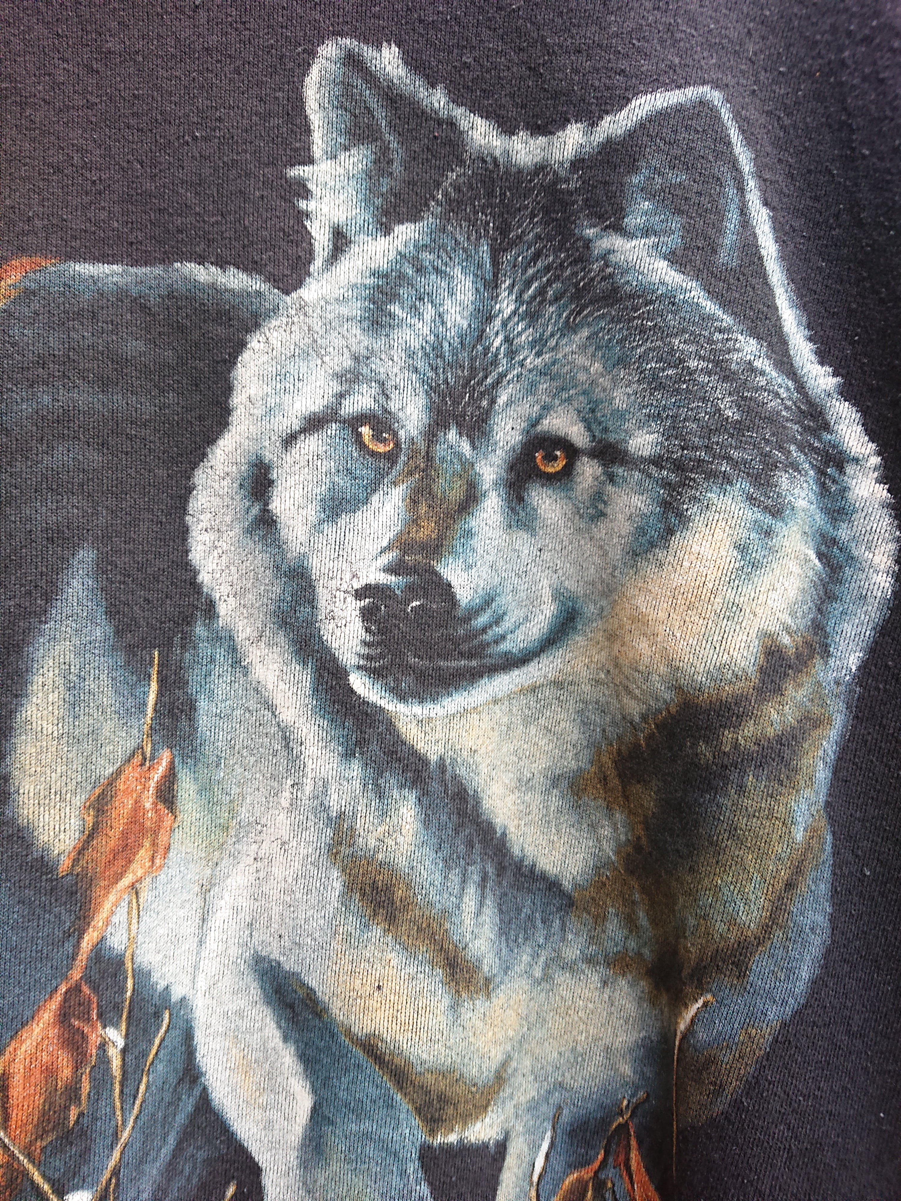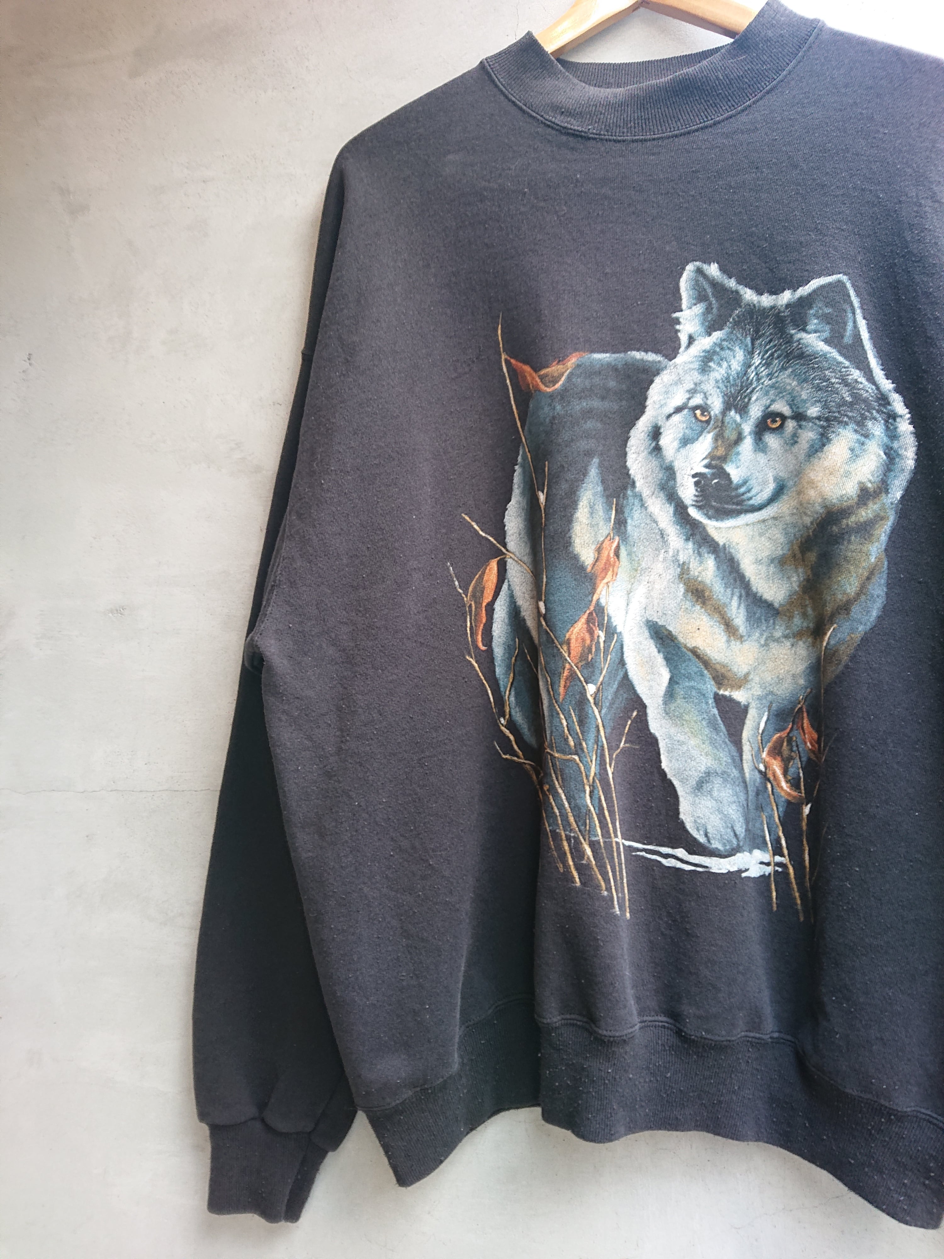 1990s WOLF PRINT SWEAT SHIRTS PRICE : 9800+tax (10780 tax included) SIZE : XXL(肩幅65cm身幅64cm着丈69cm袖丈61cm) 1990年代 アニマルプリントのスウェットになります。ブラックボディにウルフのプリント。サイズ感もXXLと大きく、コンディションも良いと思います。ブラックカラーなのでモードなスタイルのポイントに使うのも格好良いかと。
