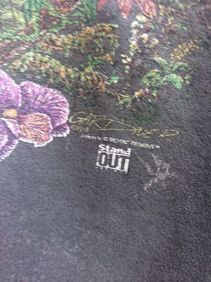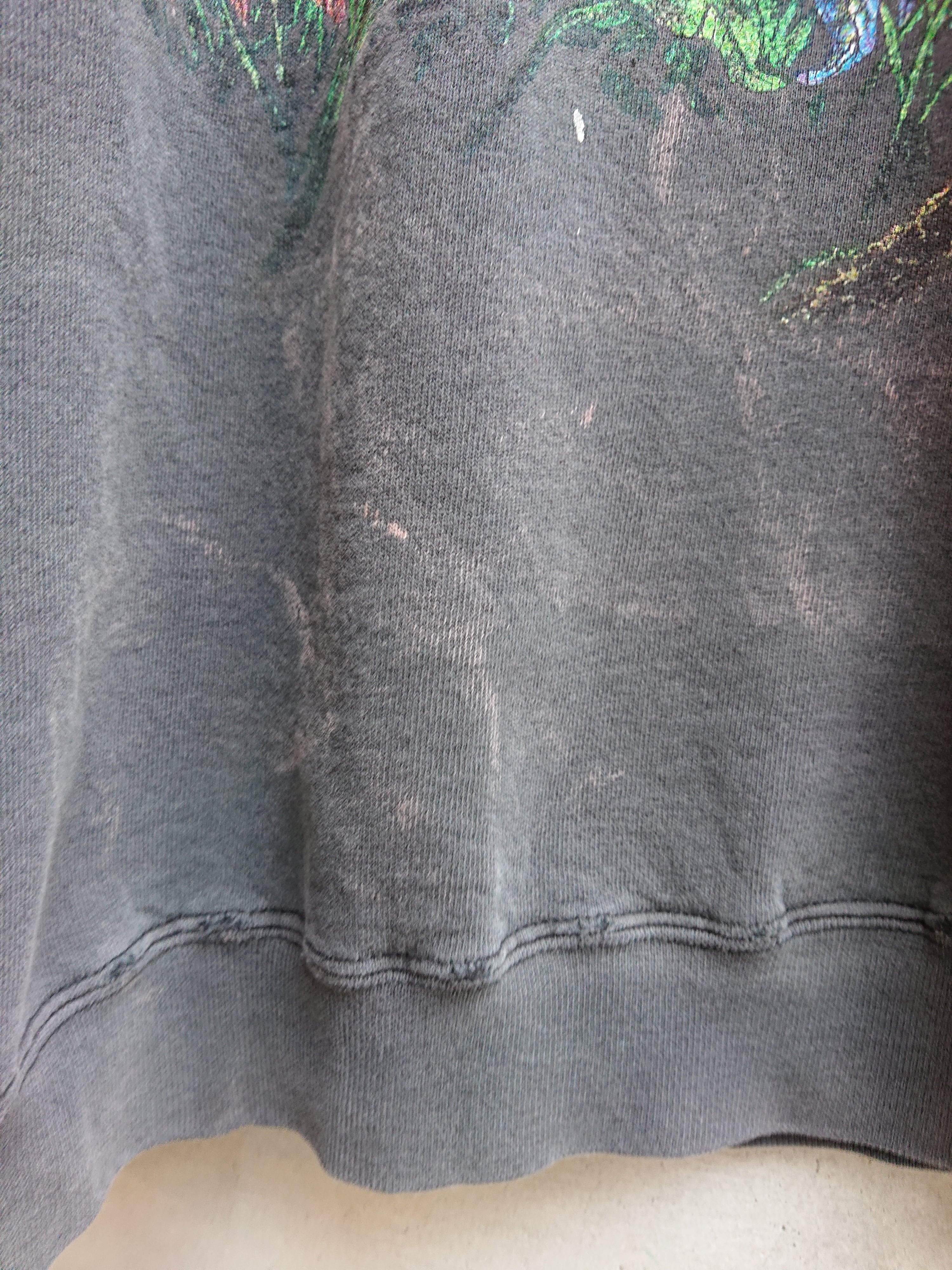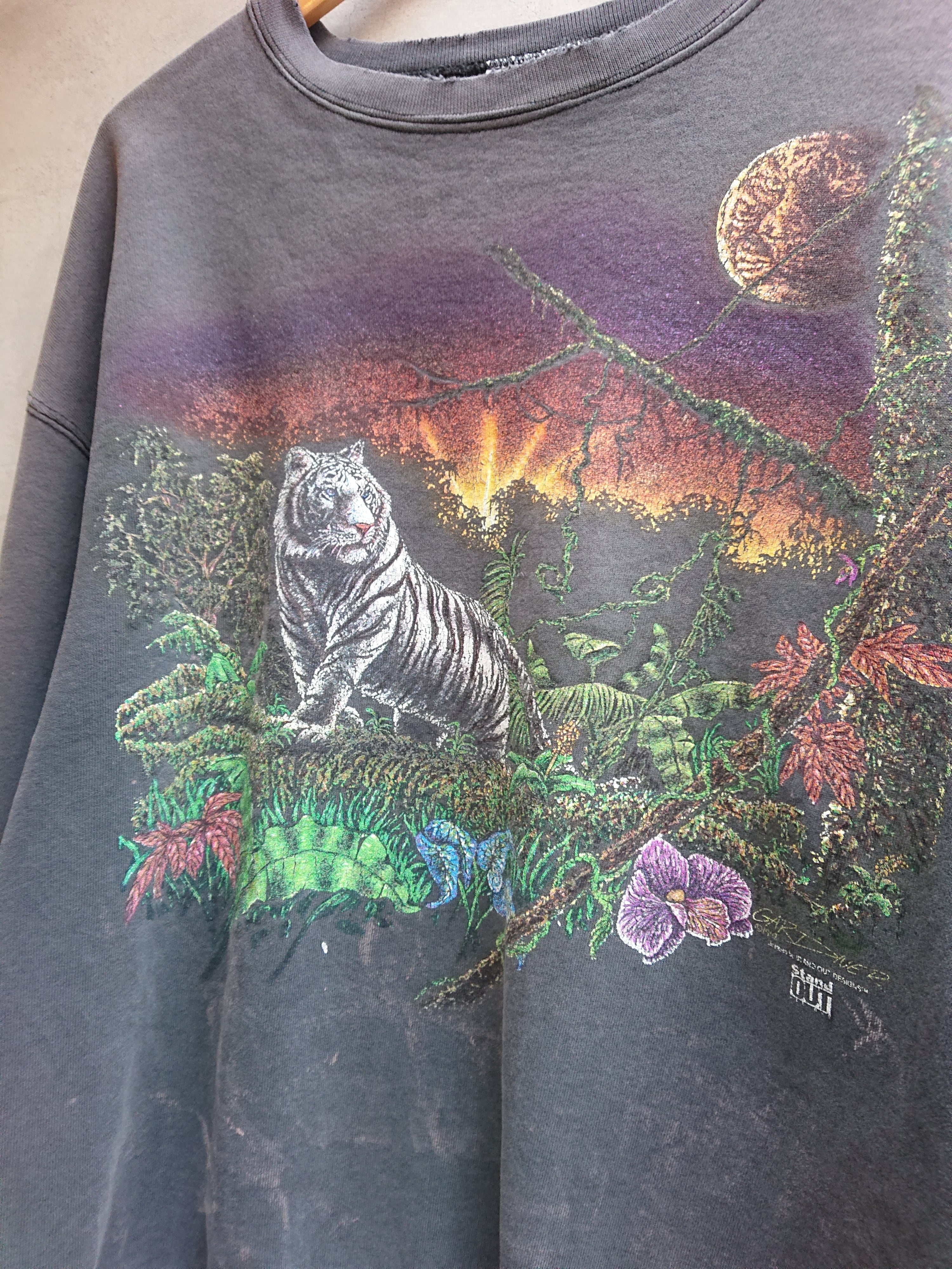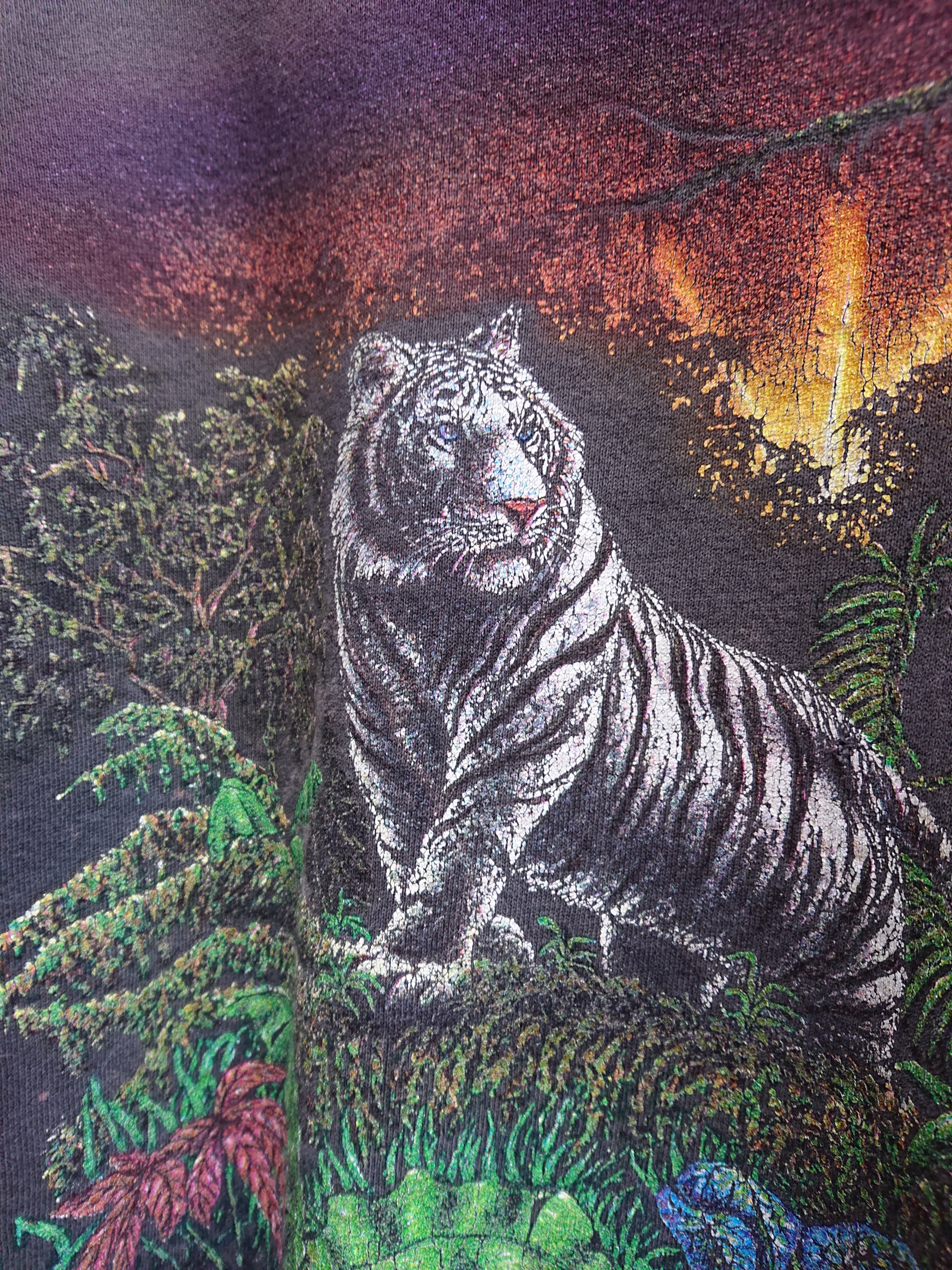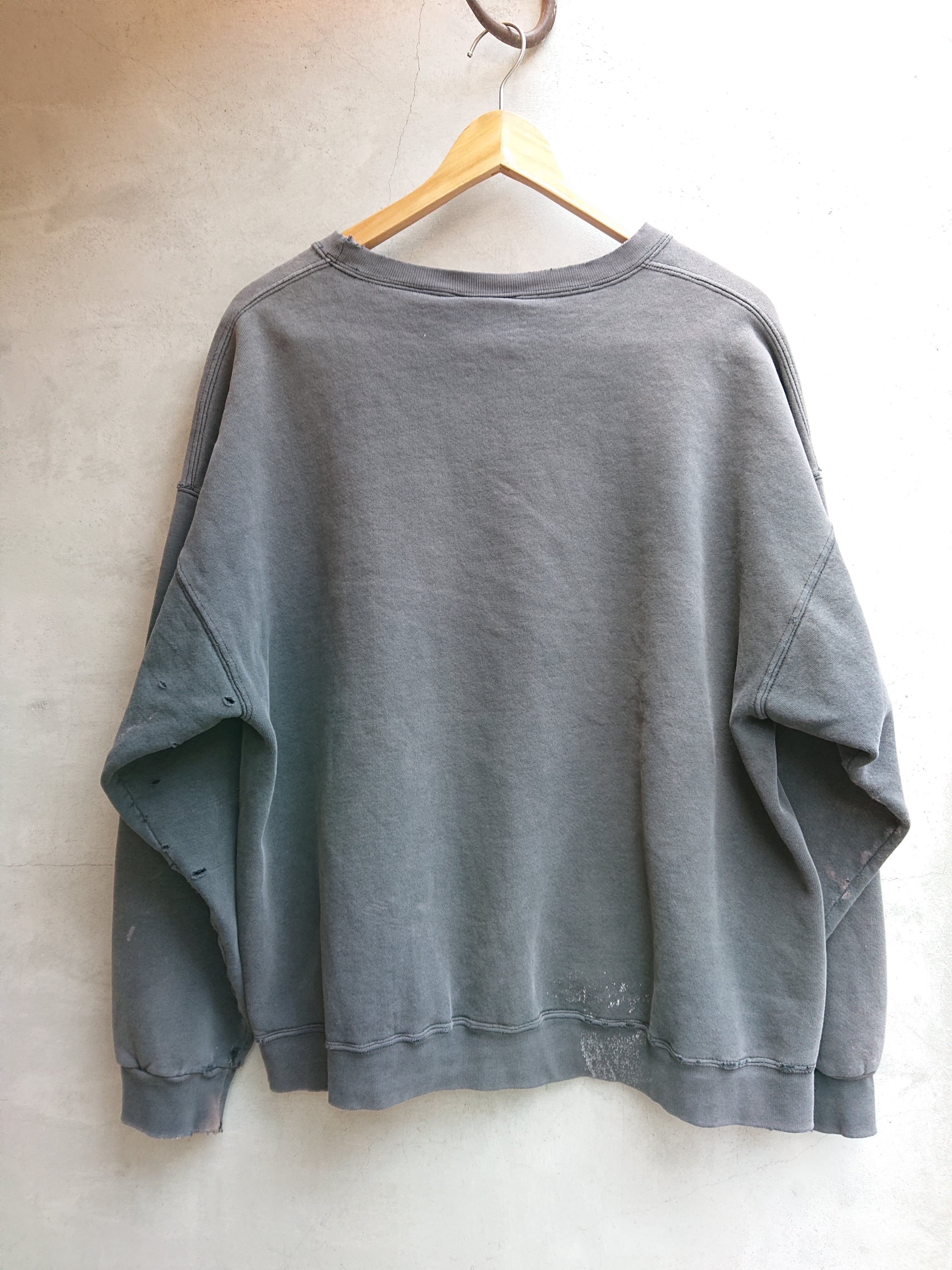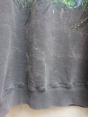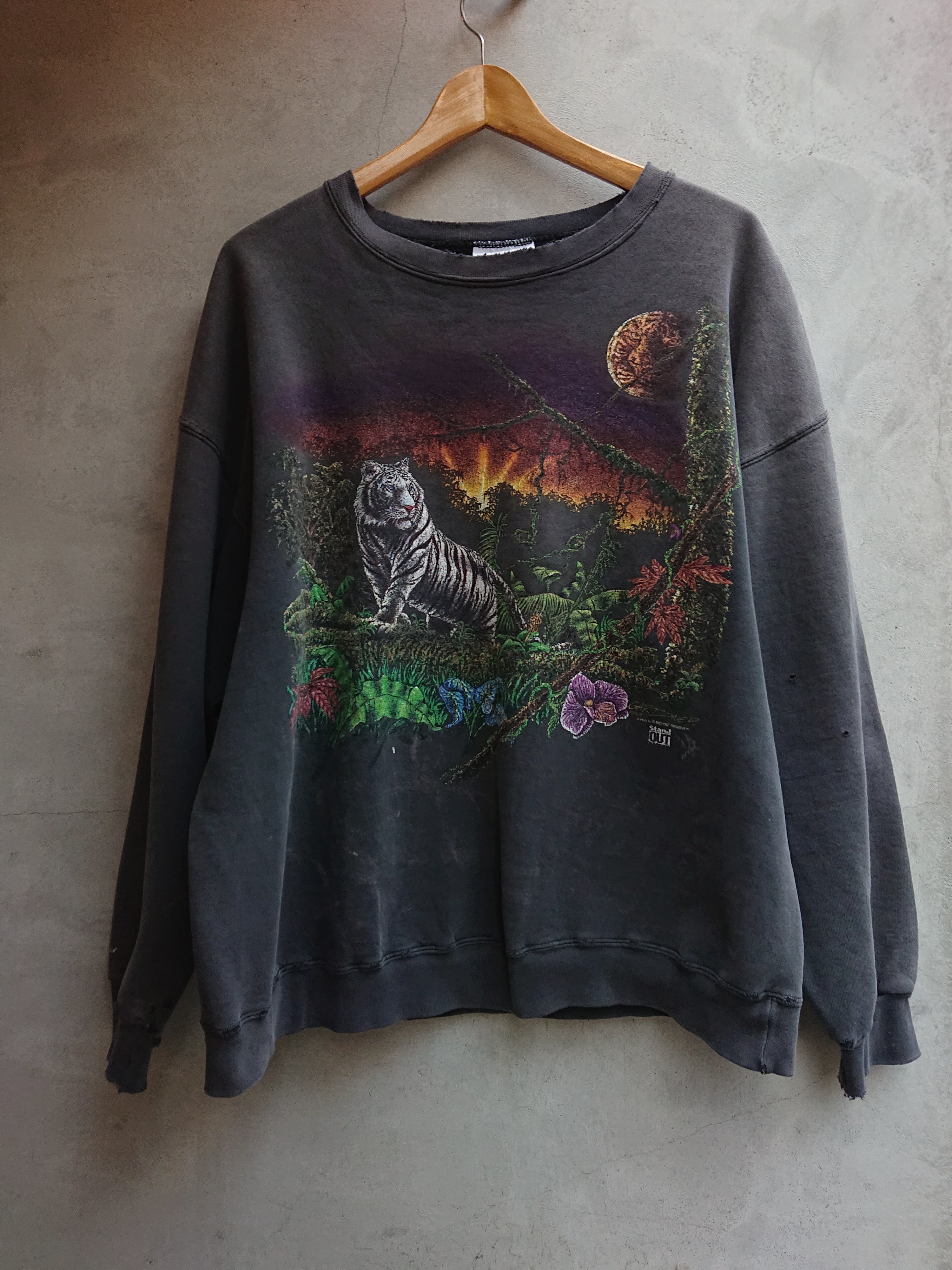 1990s TIGER PRINT SWEAT SHIRTS PRICE : 9800+tax (10780 tax included) SIZE : XL(肩幅67cm身幅63cm着丈63cm袖丈52cm) 1990年代 アニマルプリントのスウェットになります。タイガープリントでブラックボディの色褪せにダメージ、ペンキ汚れと雰囲気もある一着。アニマルプリントのボロ系もまた古いヴィンテージスウェットと違う格好良さがあります。