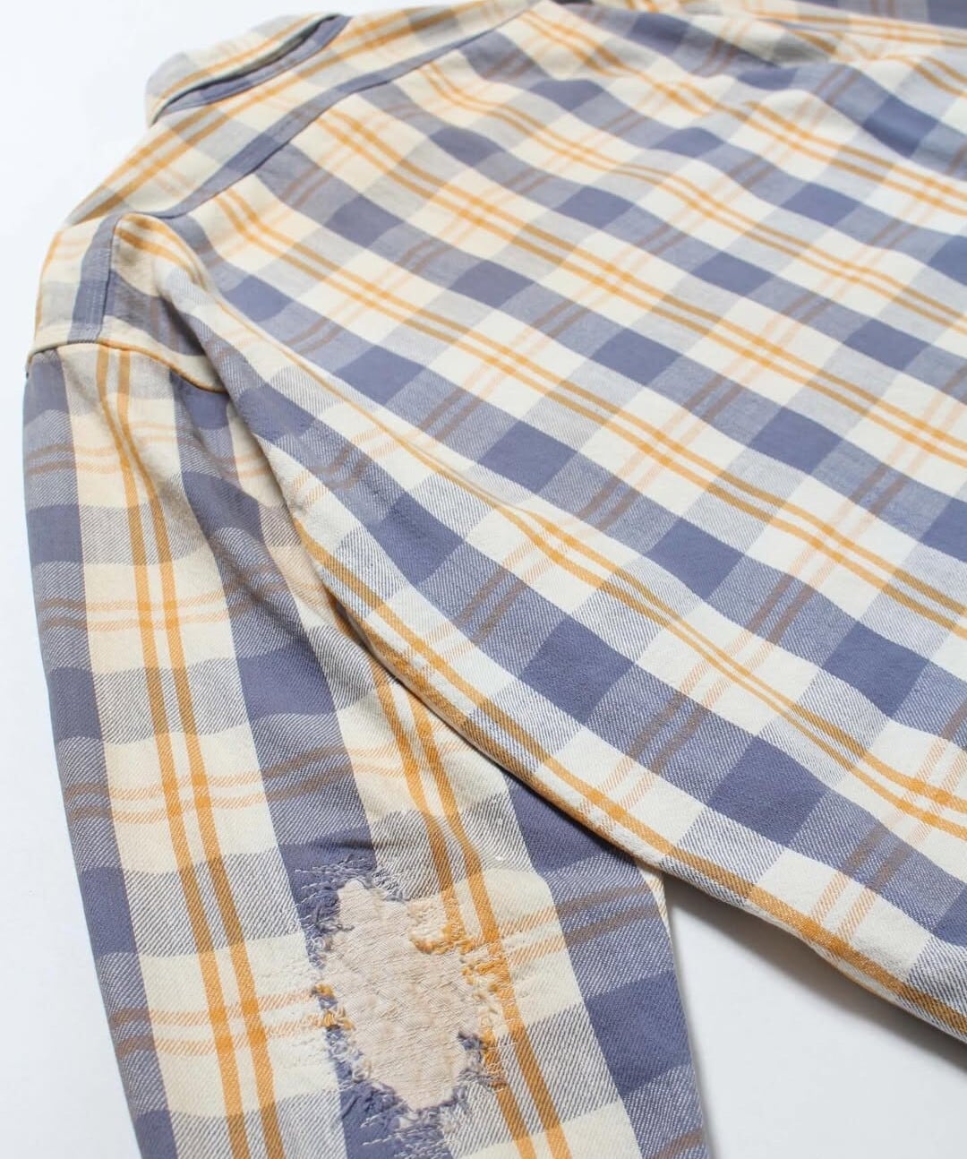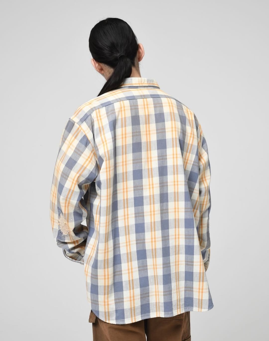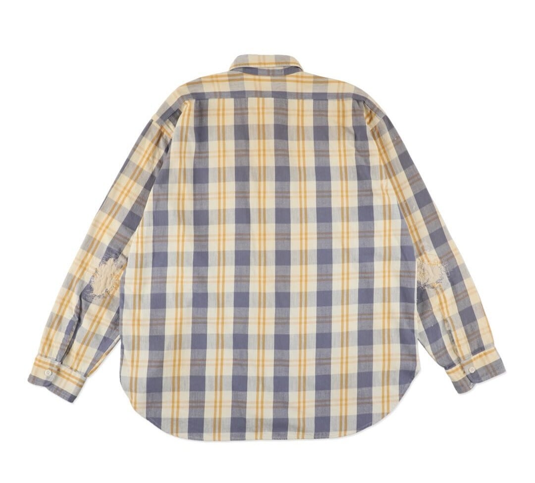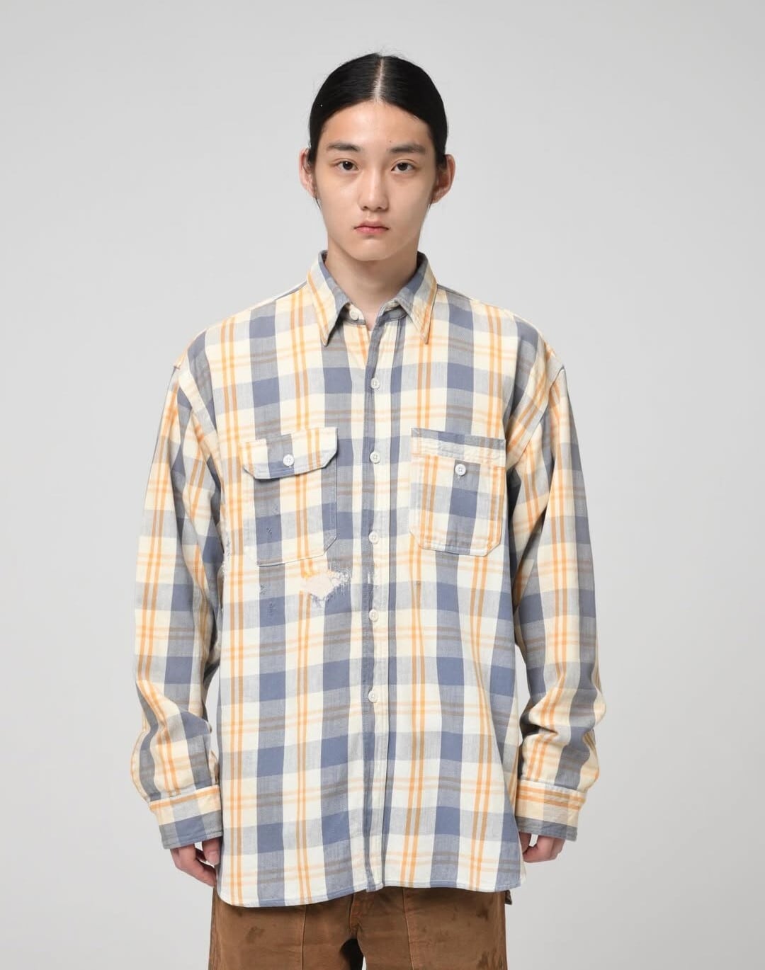 ヴィンテージを彷彿とさせるチェックネル生地を使用し、 古い時代のワークシャツの空気感をそのまま落とし込んだ一着。起毛感や色の出方まで含め、当時の表情を意識して仕上げている。最大の特徴は、40年代のワークシャツに見られるユニークな紙たばこ用ポケット。実用性から生まれたこのディティールか、時代背景とリアルな労働の匂いを強く感じさせるポイントになっている。