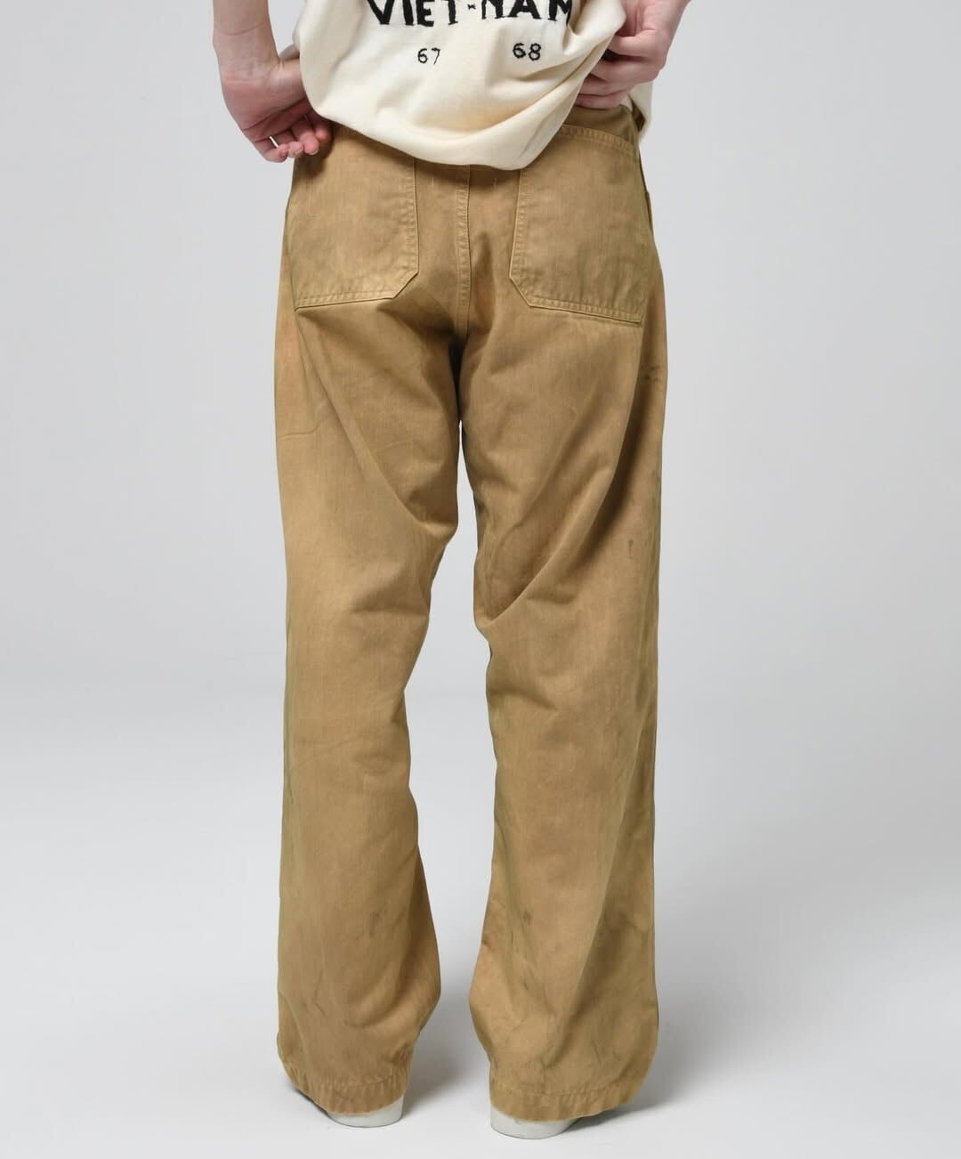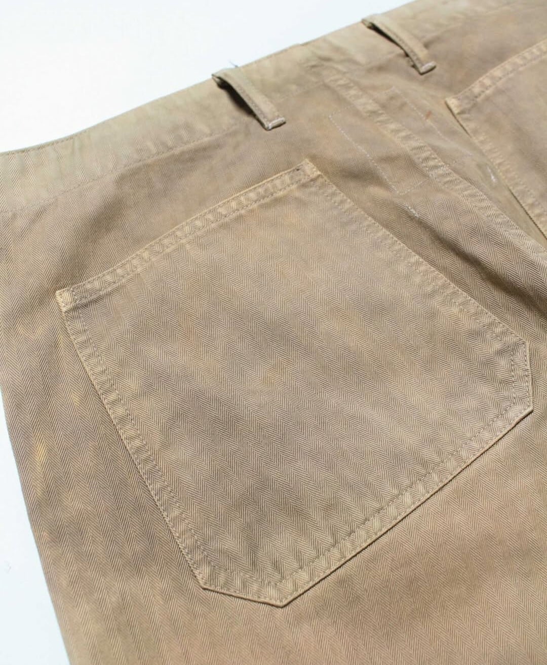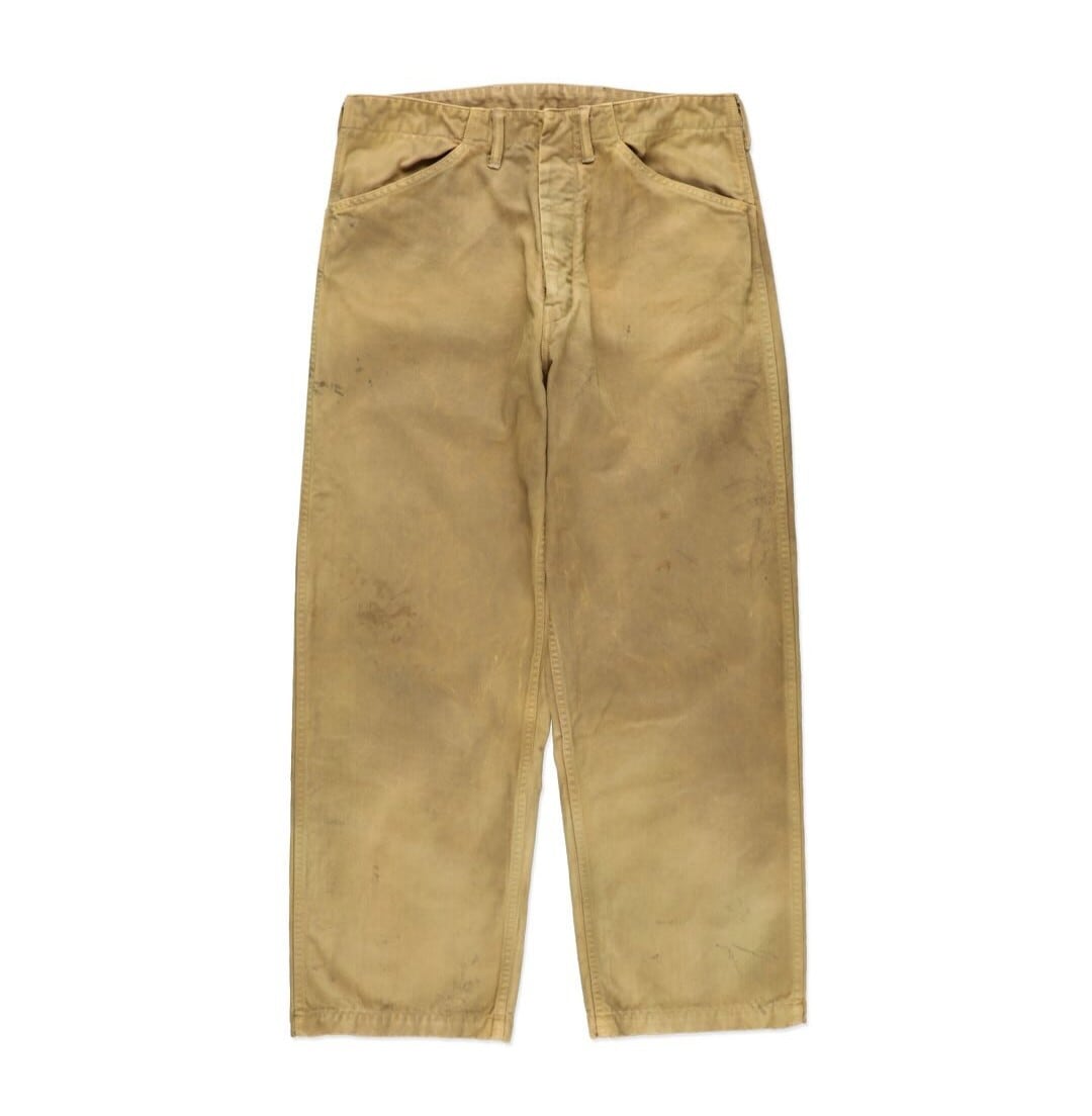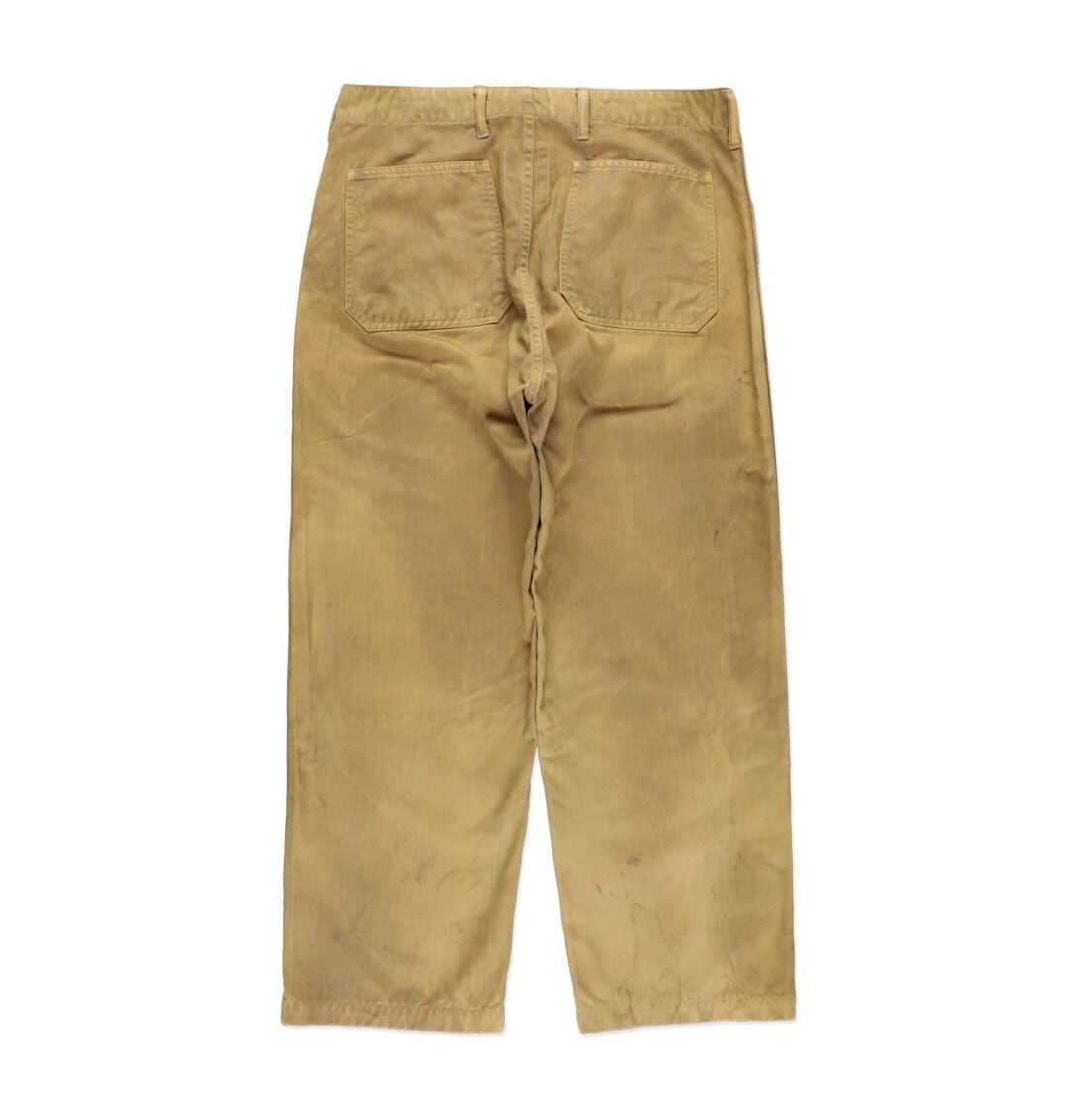 USMC P-41 HBTトラウザーズの中でも、経年変化によってカーキグリーンから黄色味へと変色した個体の存在に着目した表現。長年の使用や洗い込みによって色味が抜け、独特のトーンに変化した姿をイメージしている。 汚れや擦れの表情まで細かく作り込み、実際のヴィンテージと見紛うほどのリアリティを持たせた加工で、時間の積なりを感じさせる佇まいに仕上げている。