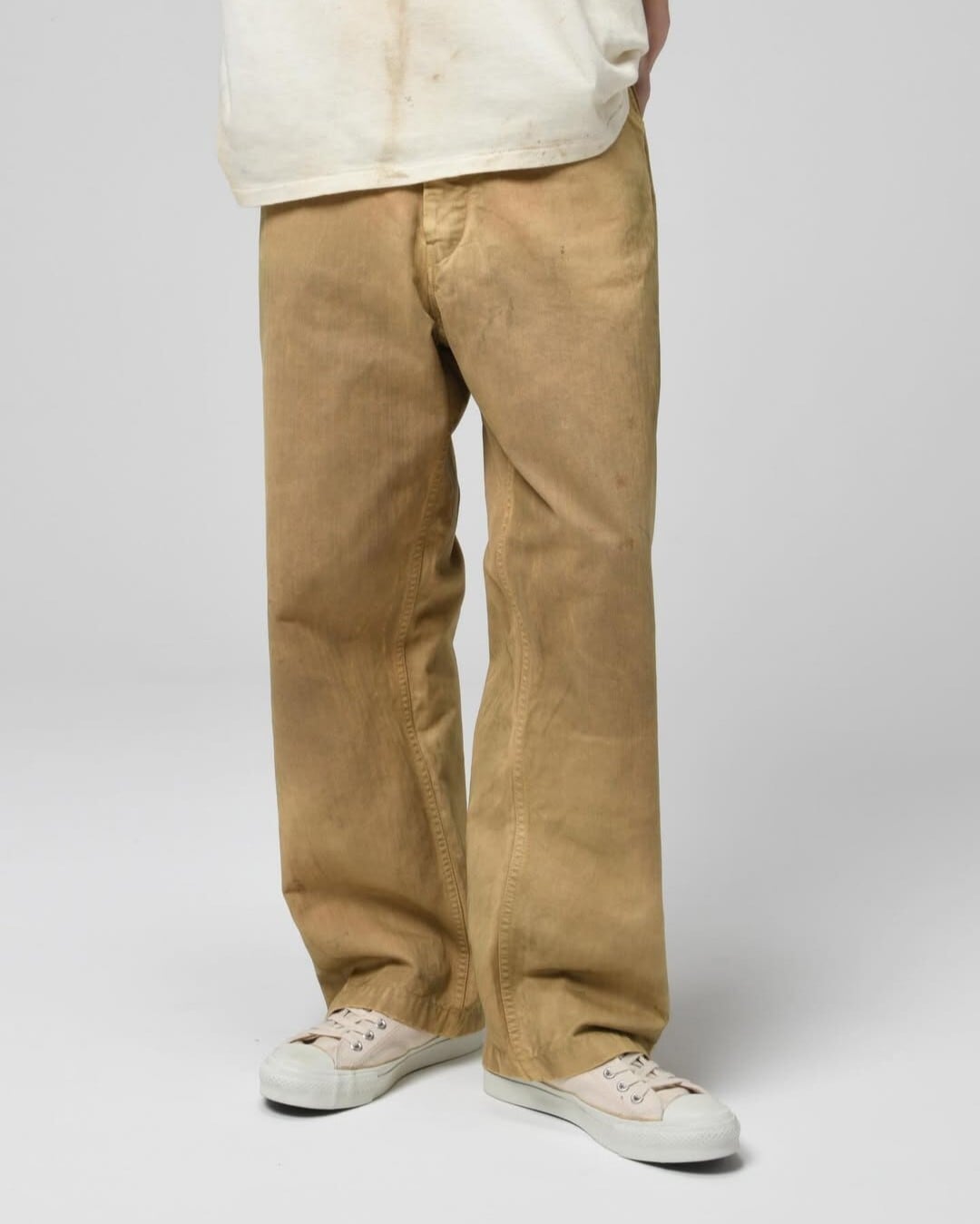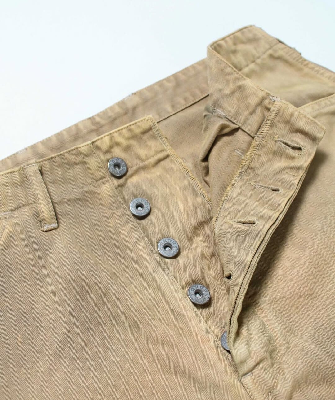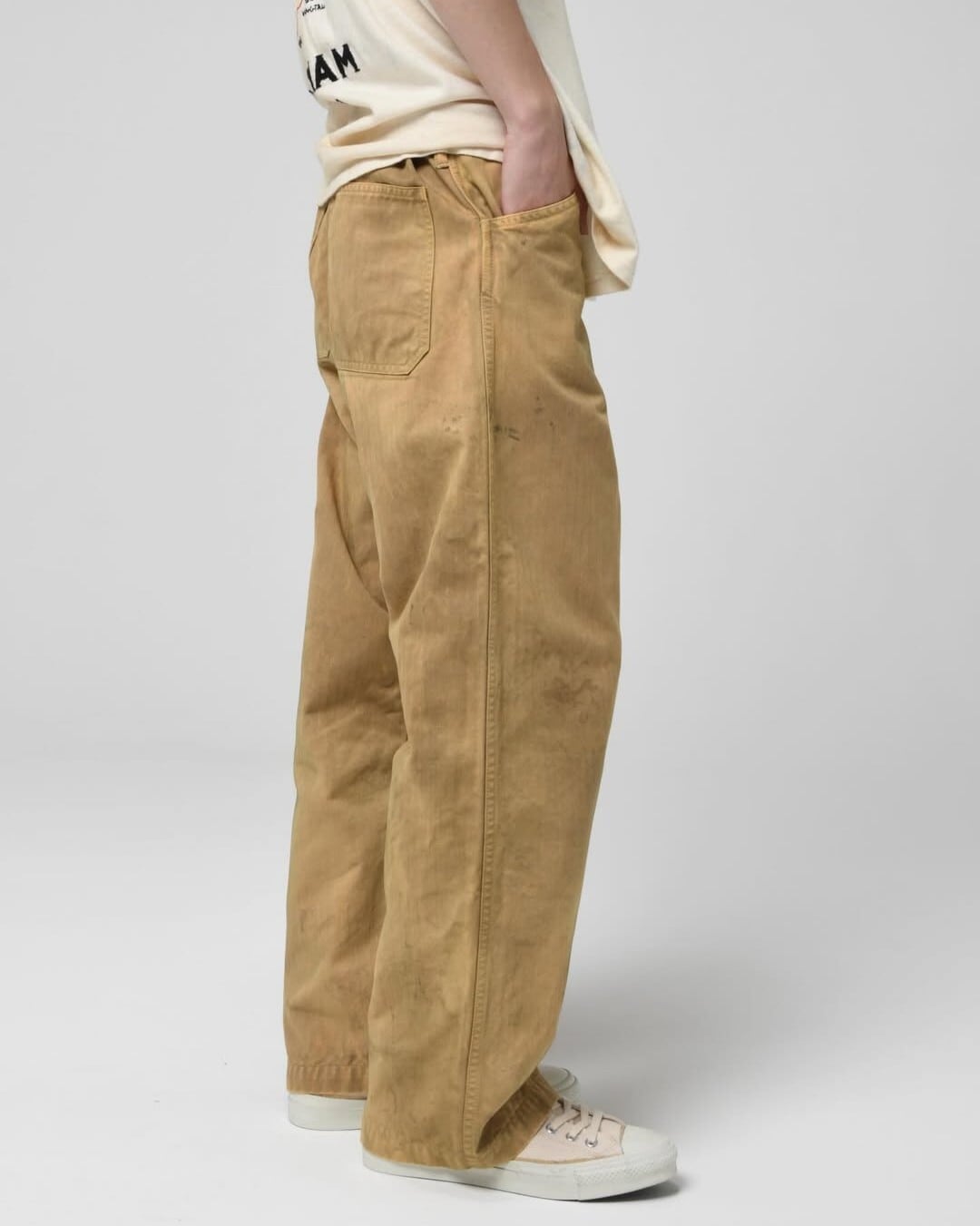 USMC P-41 HBTトラウザーズの中でも、経年変化によってカーキグリーンから黄色味へと変色した個体の存在に着目した表現。長年の使用や洗い込みによって色味が抜け、独特のトーンに変化した姿をイメージしている。 汚れや擦れの表情まで細かく作り込み、実際のヴィンテージと見紛うほどのリアリティを持たせた加工で、時間の積なりを感じさせる佇まいに仕上げている。