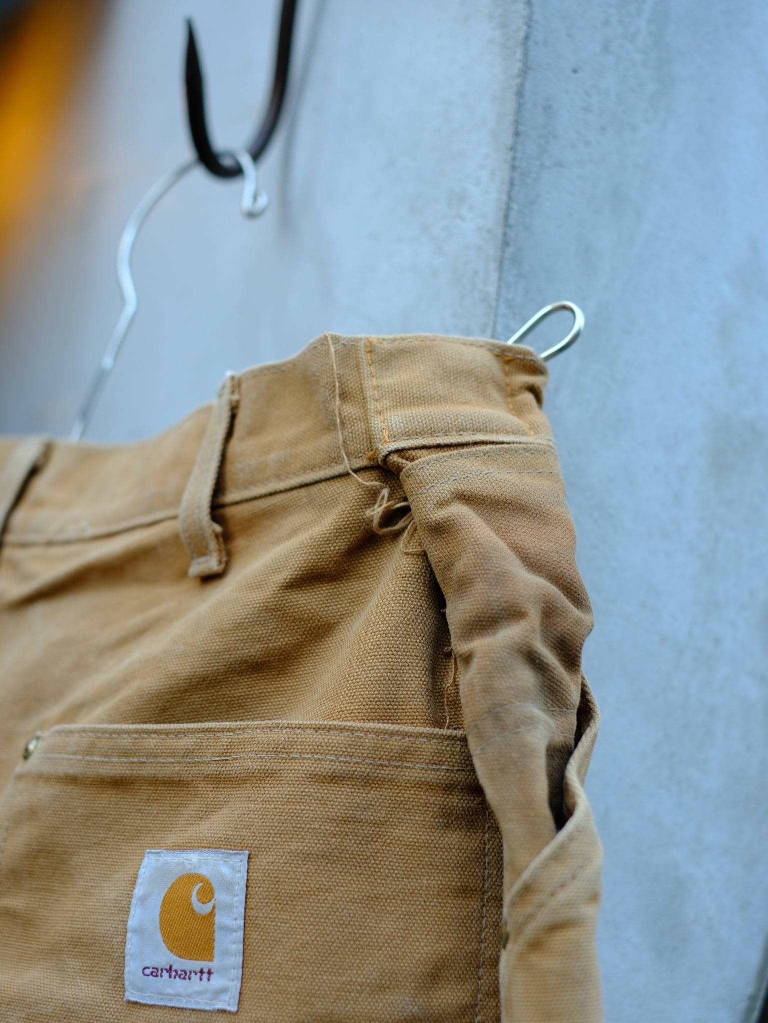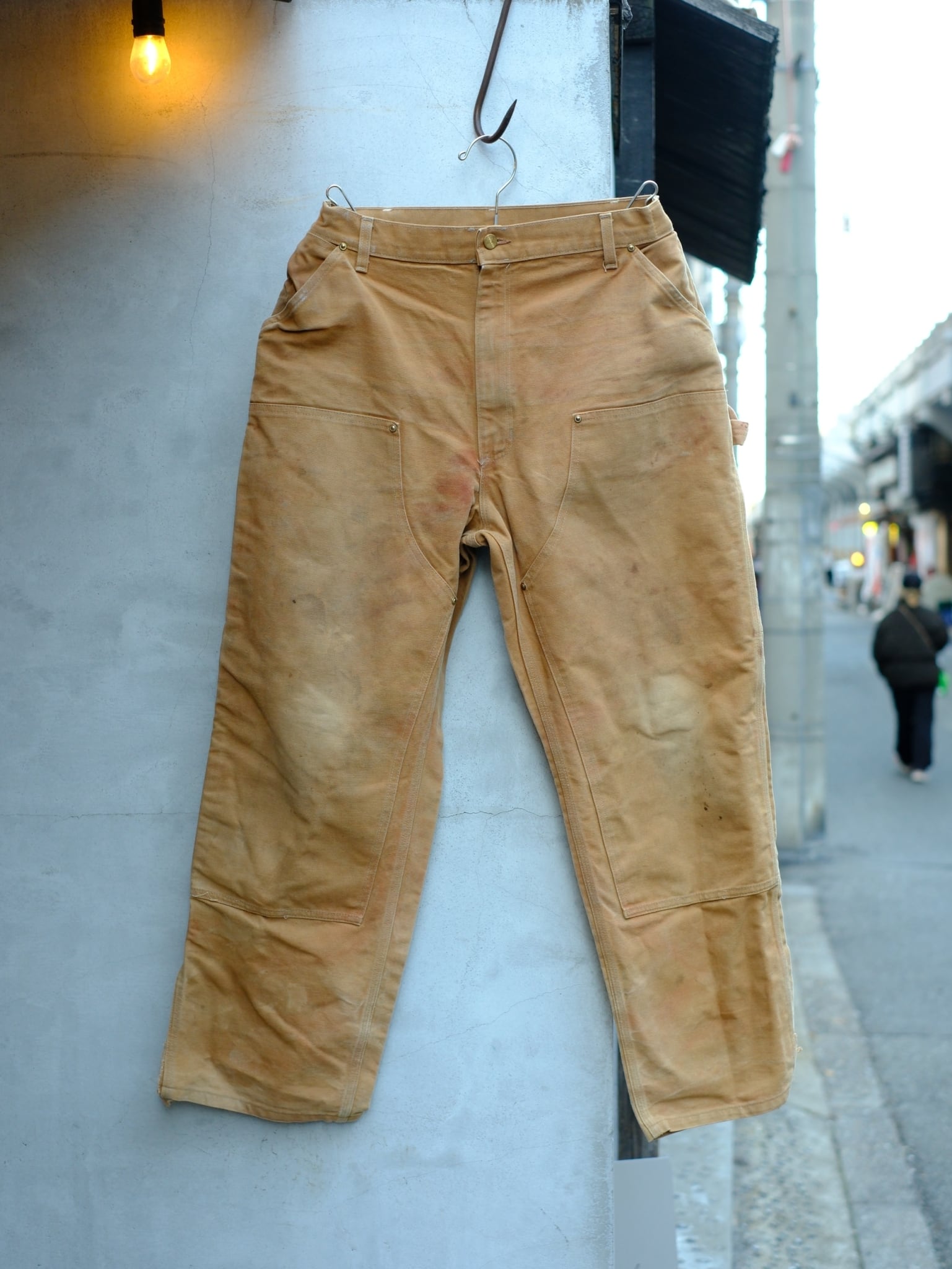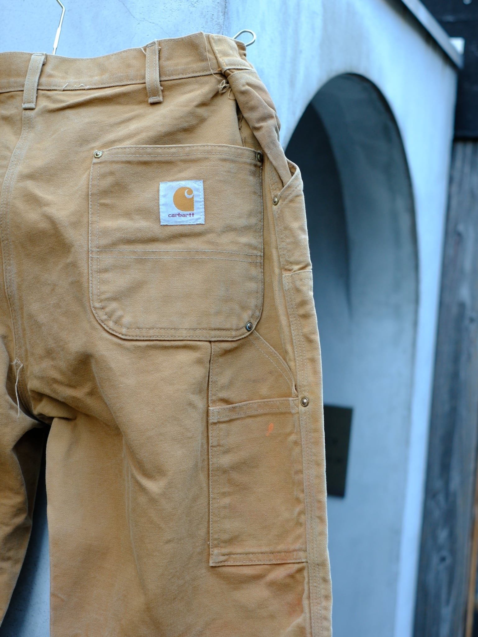 1990年代 USA製 カーハートのダブルニーダックパンツになります。厚手のダック生地で両膝は生地を二重にしたダブルニー仕様。サイズ表記はウエスト40ですが、サイドを縫い付けで摘まんでおり実寸はウエスト80cm程に。その摘まんだ仕様が見た目にも格好良く目を惹くポイント!全体的汚れありですが雰囲気も良く男前な一本。両足裾の片方を5~6cmほど割いてます。昨今お探しの方も多いCARHARTT 。USA製も少なくなった今、気になった方は是非!!