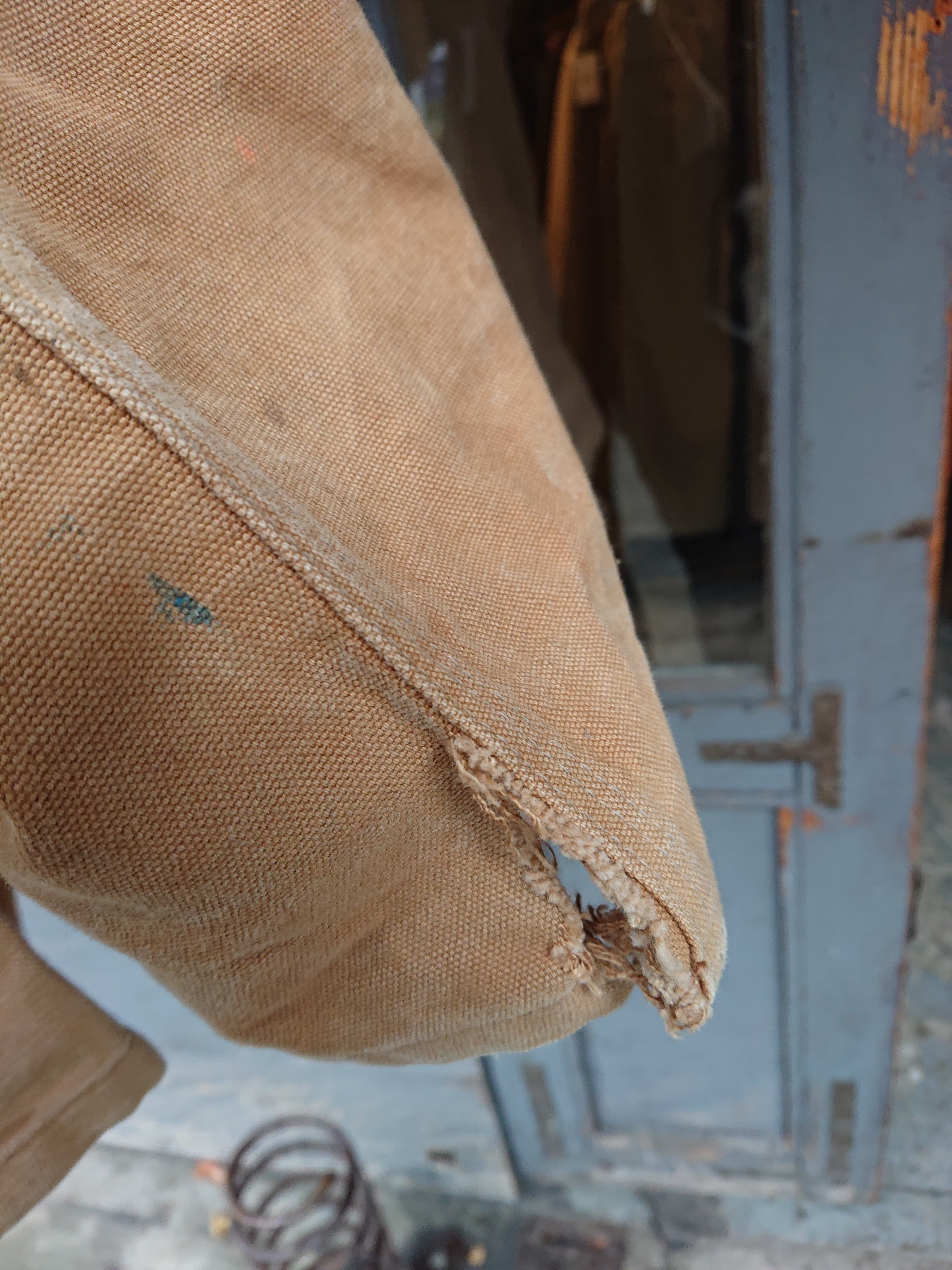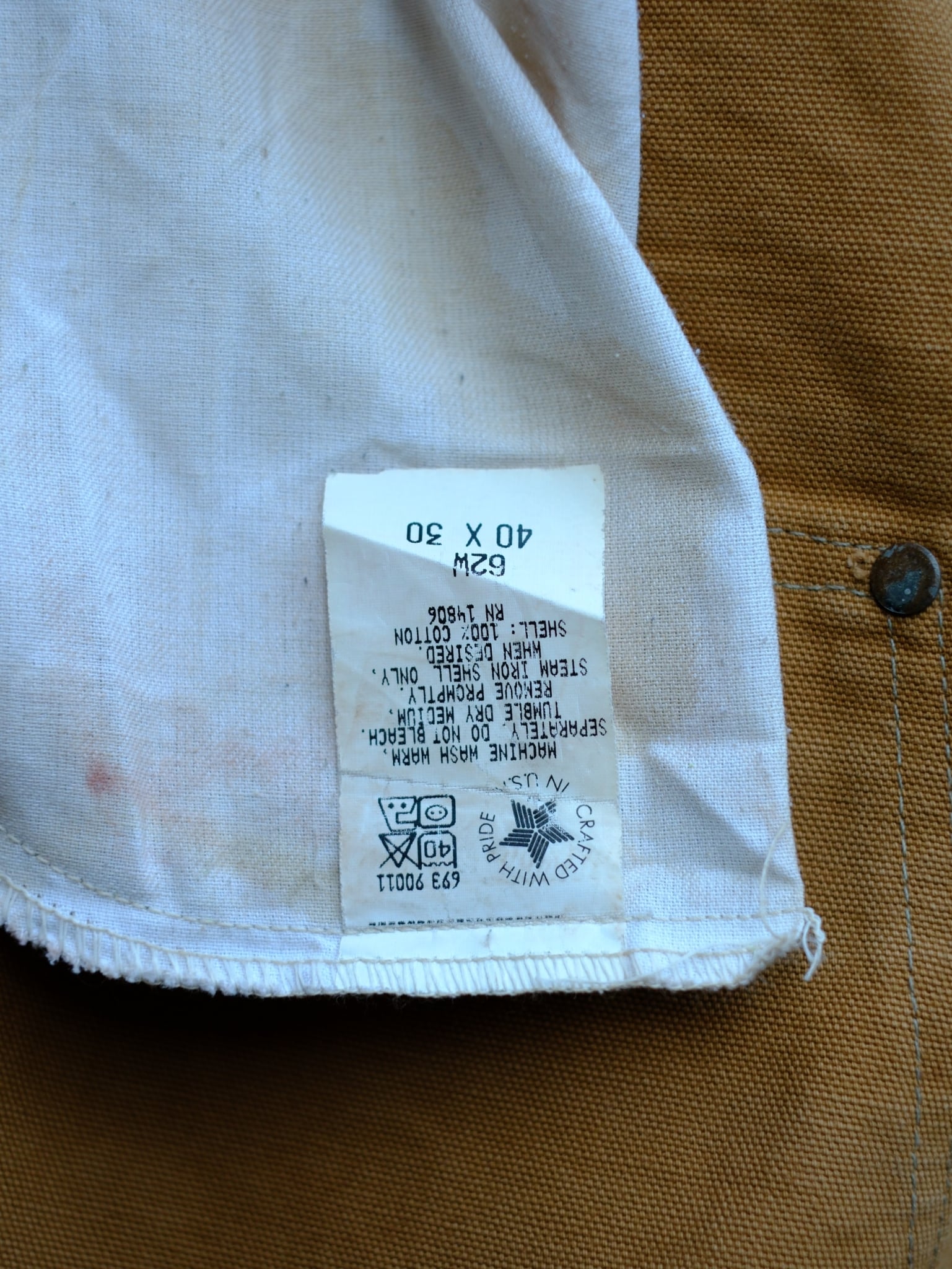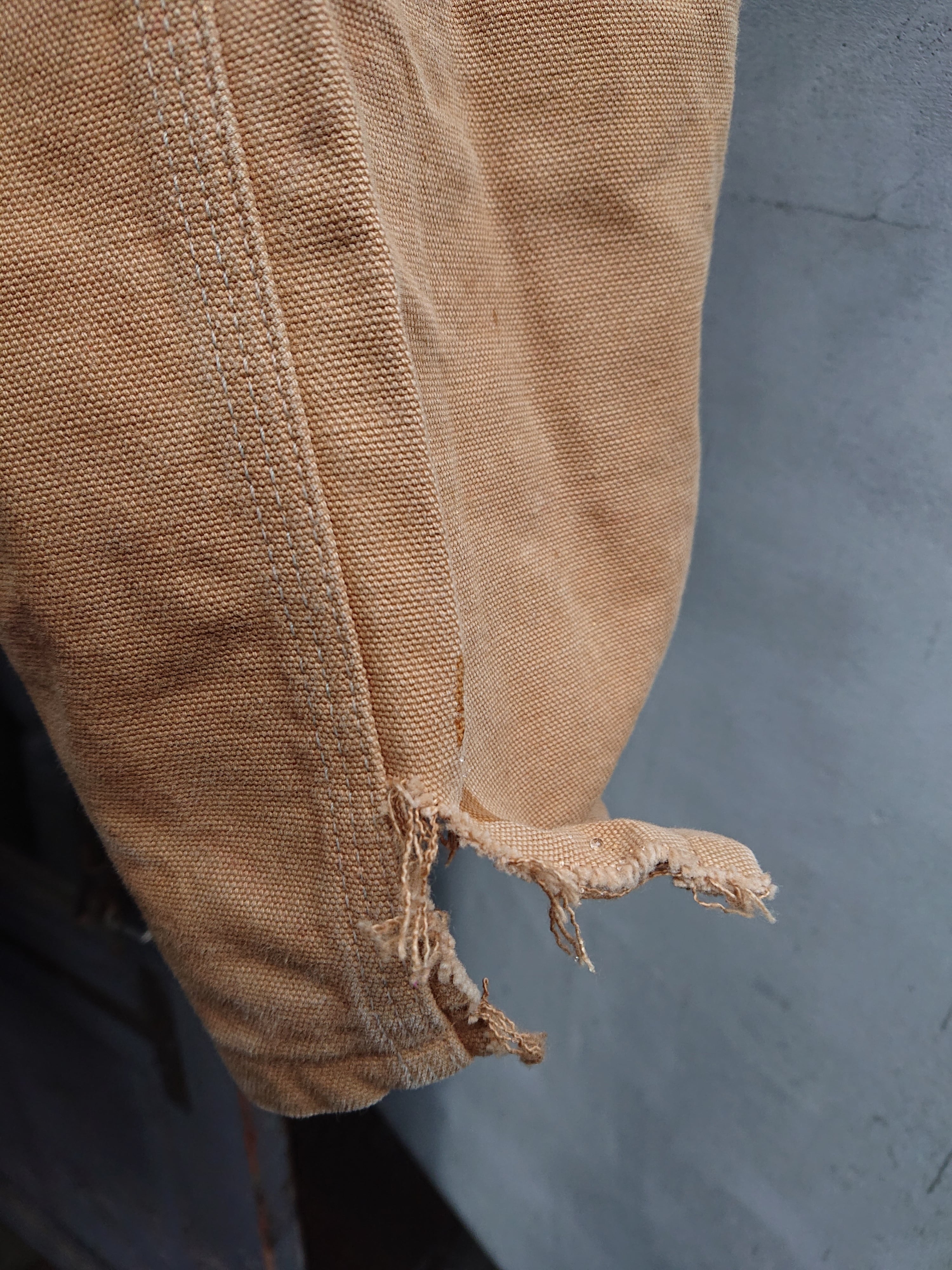 1990年代 USA製 カーハートのダブルニーダックパンツになります。厚手のダック生地で両膝は生地を二重にしたダブルニー仕様。サイズ表記はウエスト40ですが、サイドを縫い付けで摘まんでおり実寸はウエスト80cm程に。その摘まんだ仕様が見た目にも格好良く目を惹くポイント!全体的汚れありですが雰囲気も良く男前な一本。両足裾の片方を5~6cmほど割いてます。昨今お探しの方も多いCARHARTT 。USA製も少なくなった今、気になった方は是非!!
