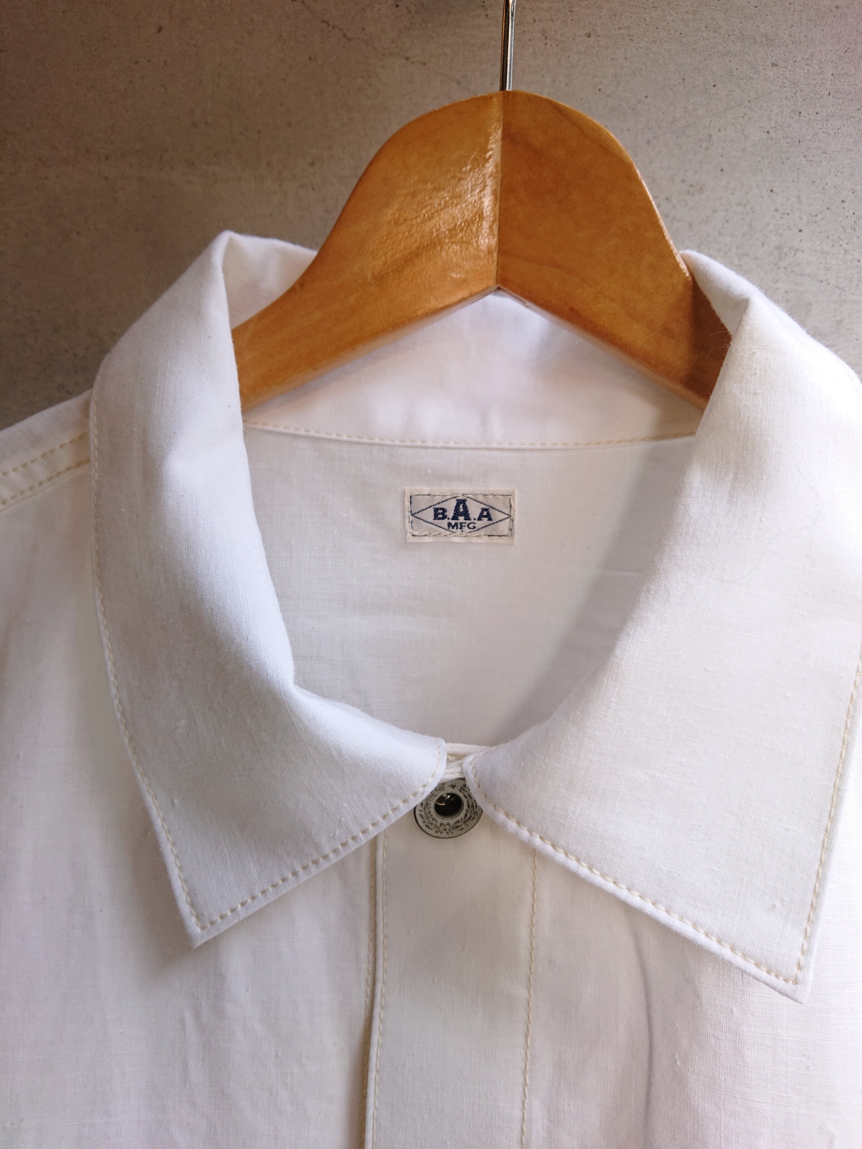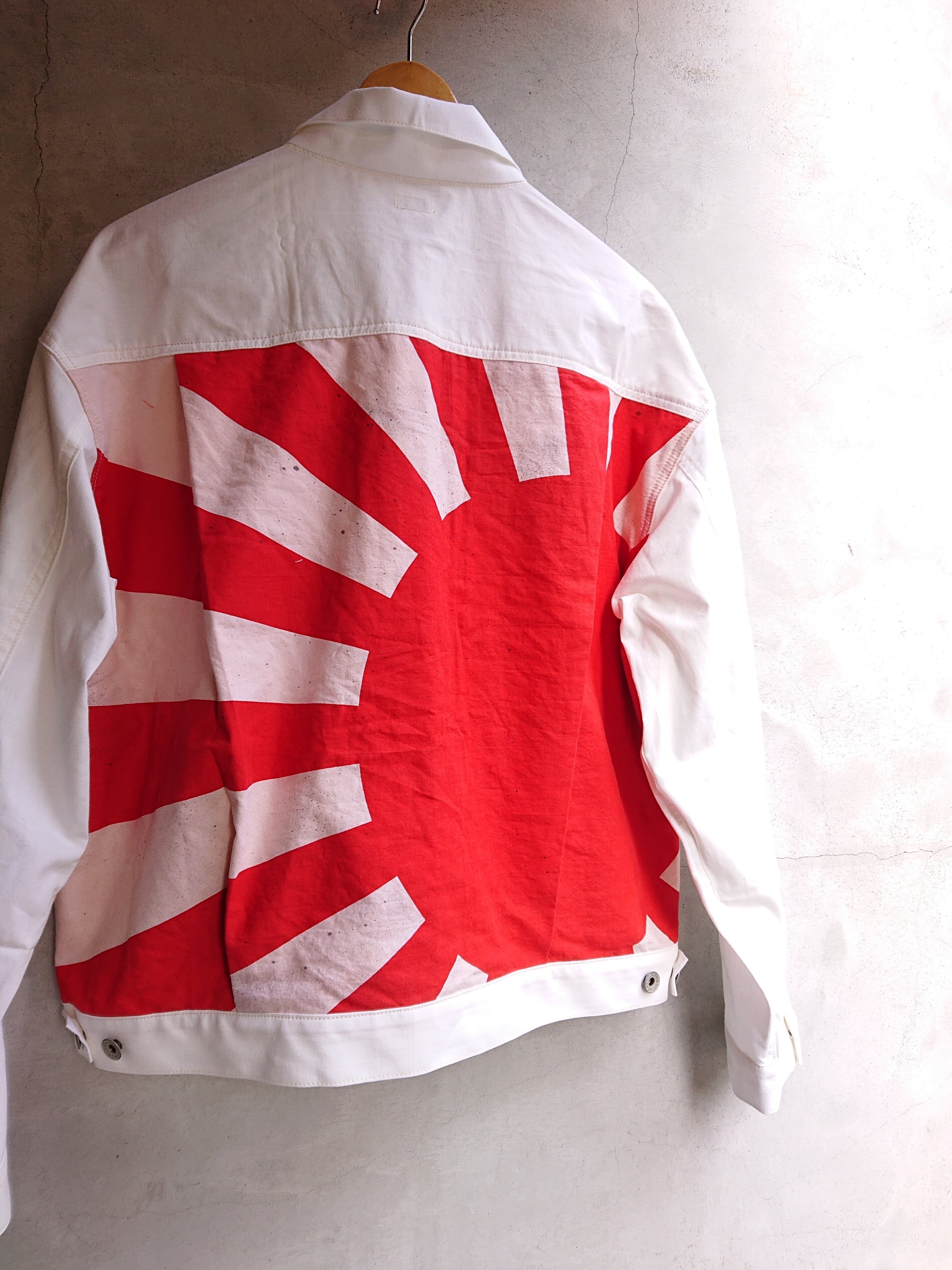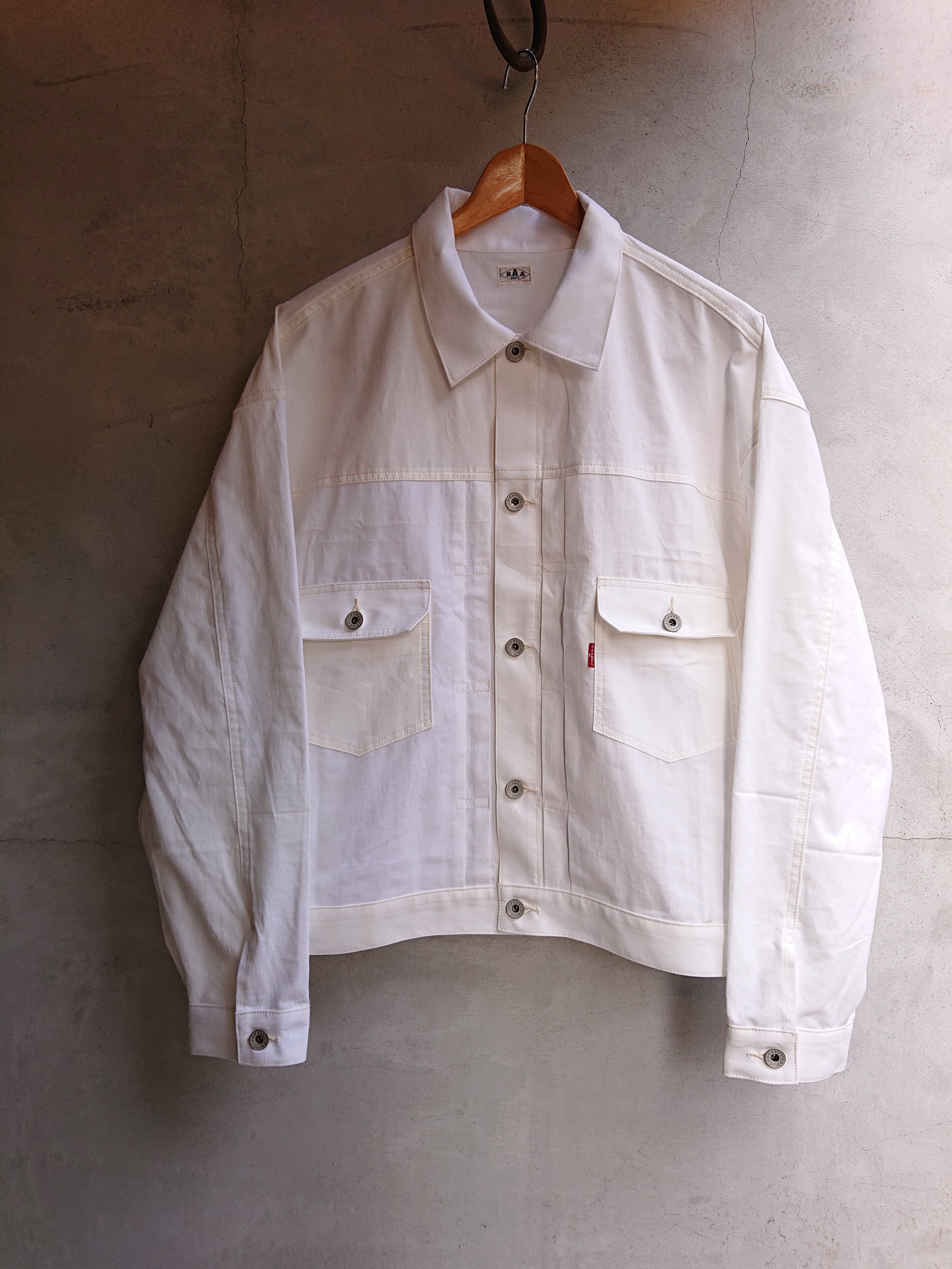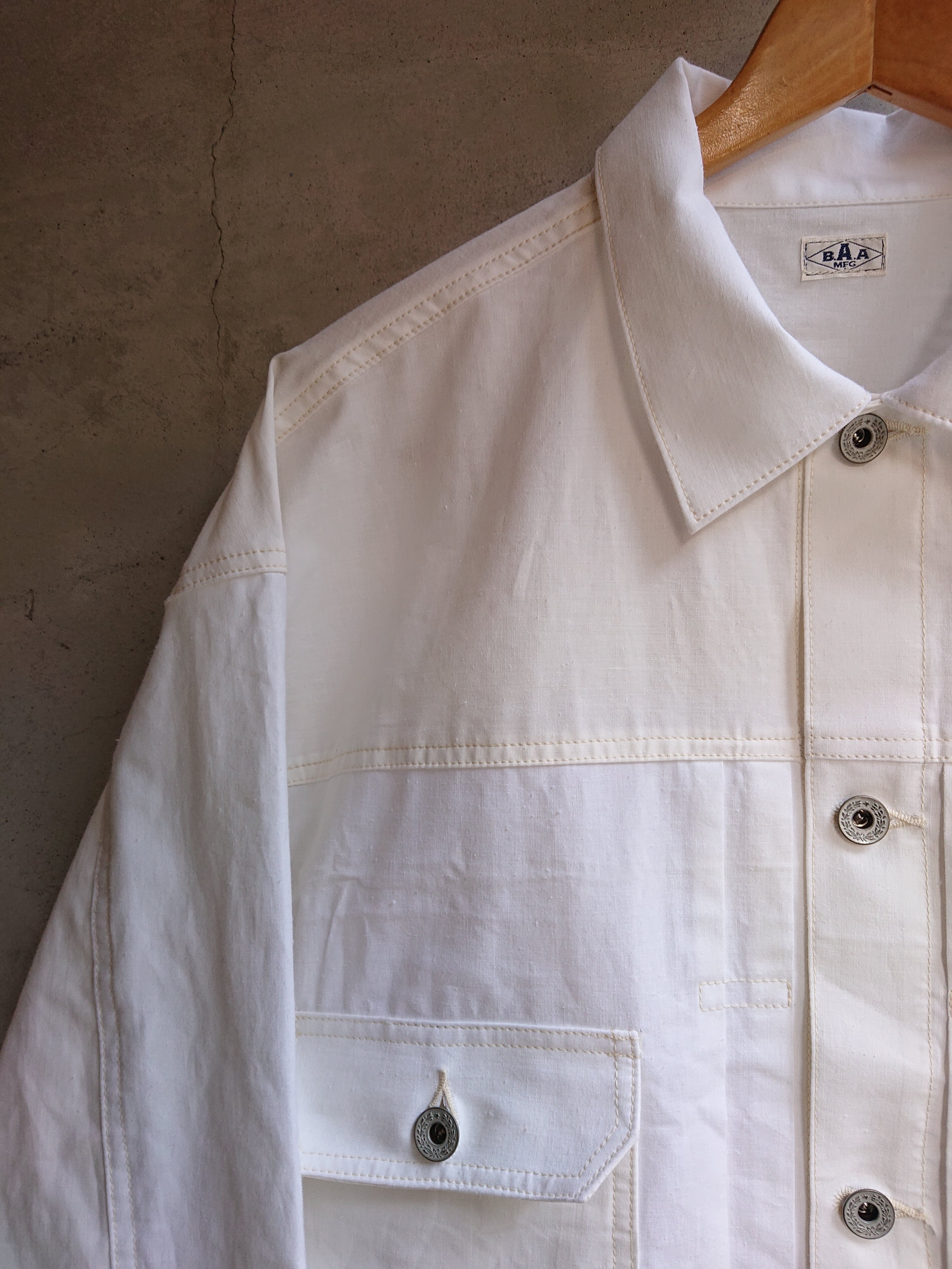 1960年代の米軍パネルマーカーシートをデッドストックを入手。今回は以前製作した2ndタイプに。ワイドシルエットの背中にアンティークナショナルフラッグをバックパーツに組み込んだ渾身の一作。 ステンシル部分の一部もフラップ裏や、カフスパーツ裏に使用は変わらず。昨今、この様な素材が纏まって入手出来る事は稀で、素晴らしい素材に巡り会える事も少なくなりました。ブランドタグはオールレーヨン糸で制作しものを使用し、ボタンは月桂樹ボタンに変更。