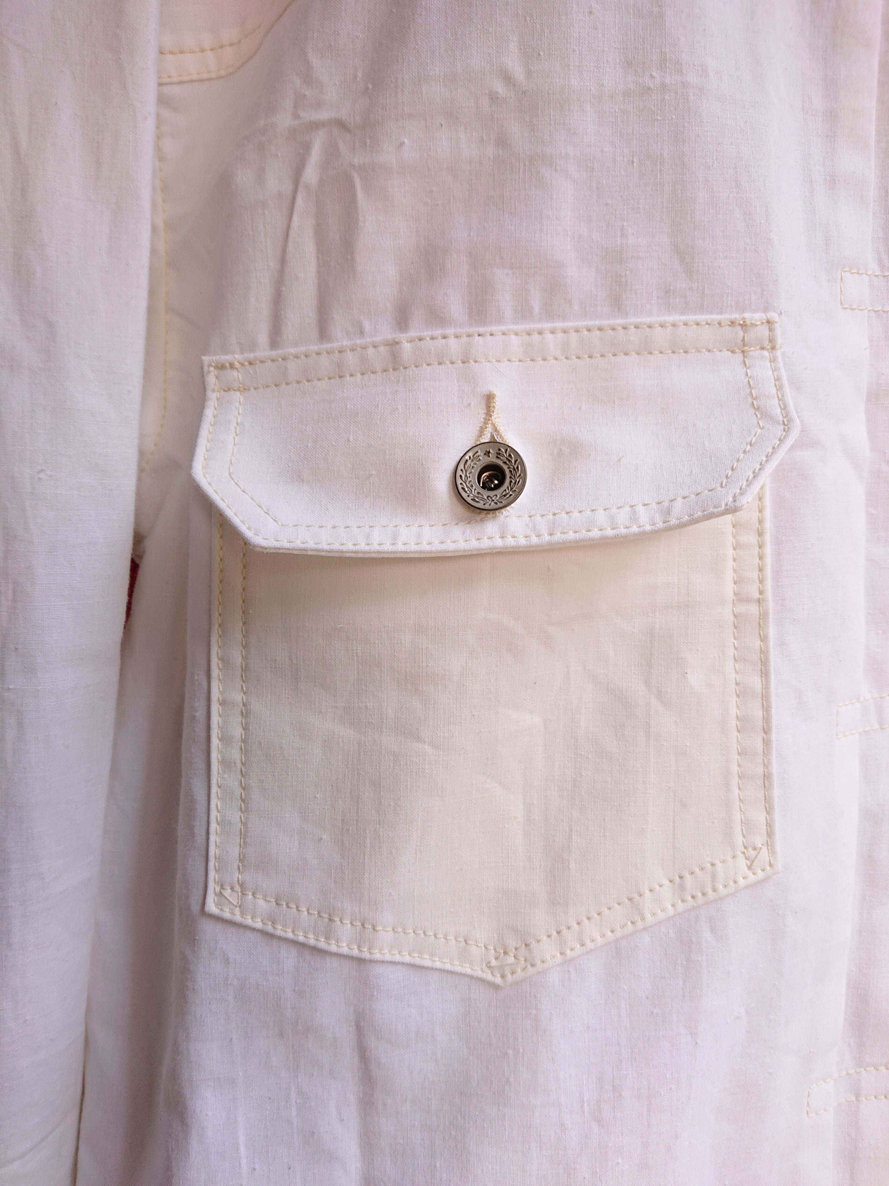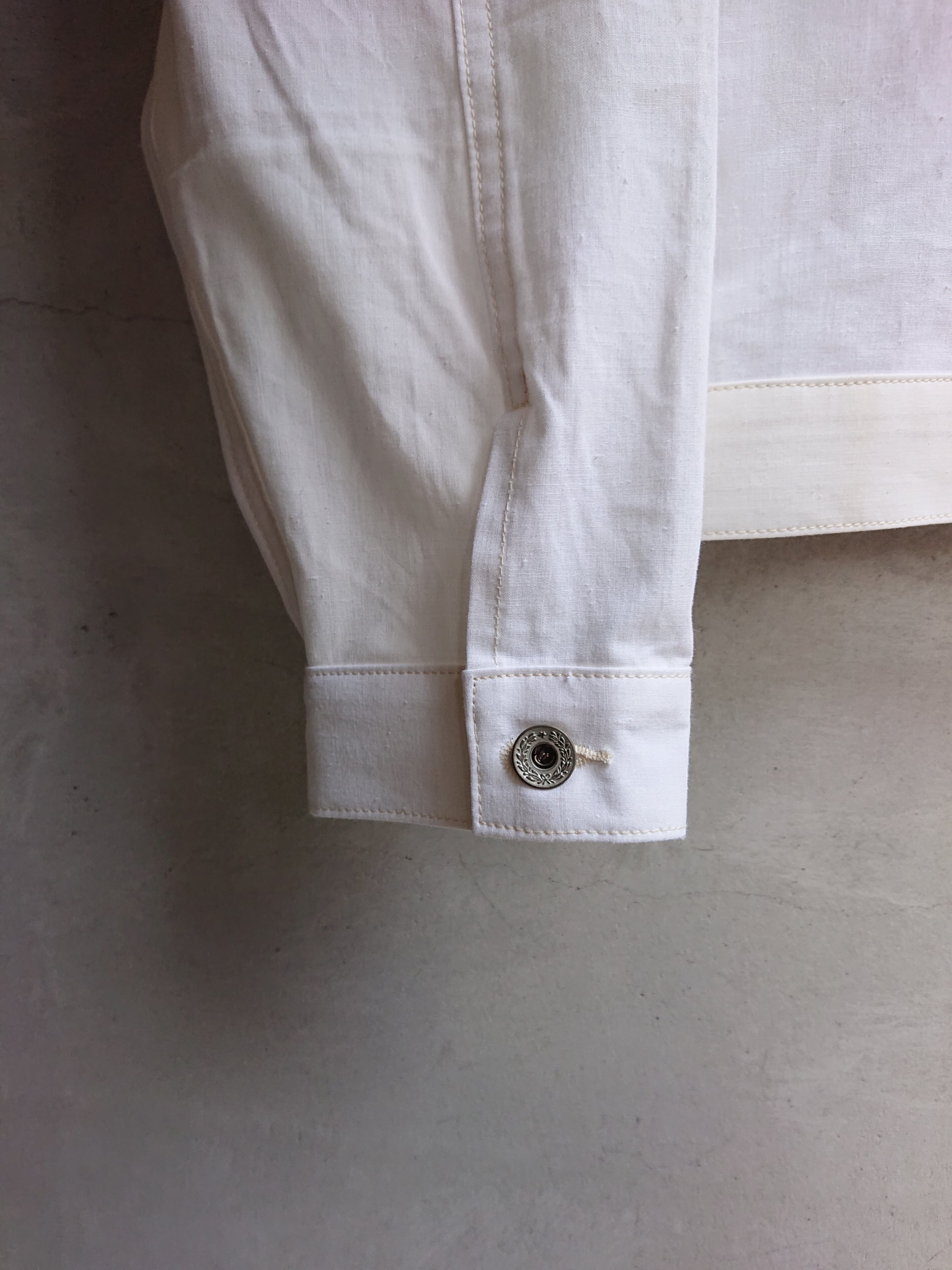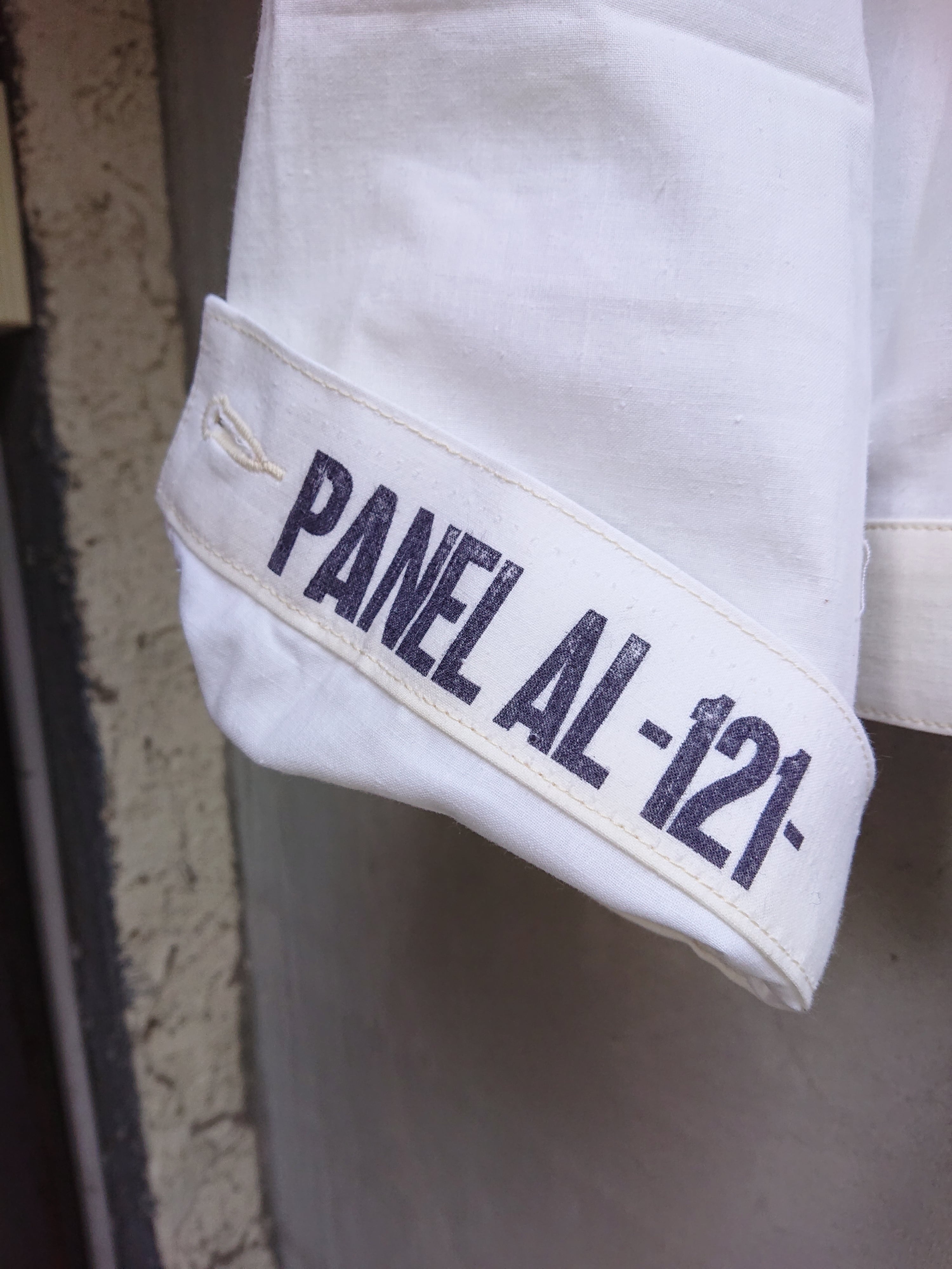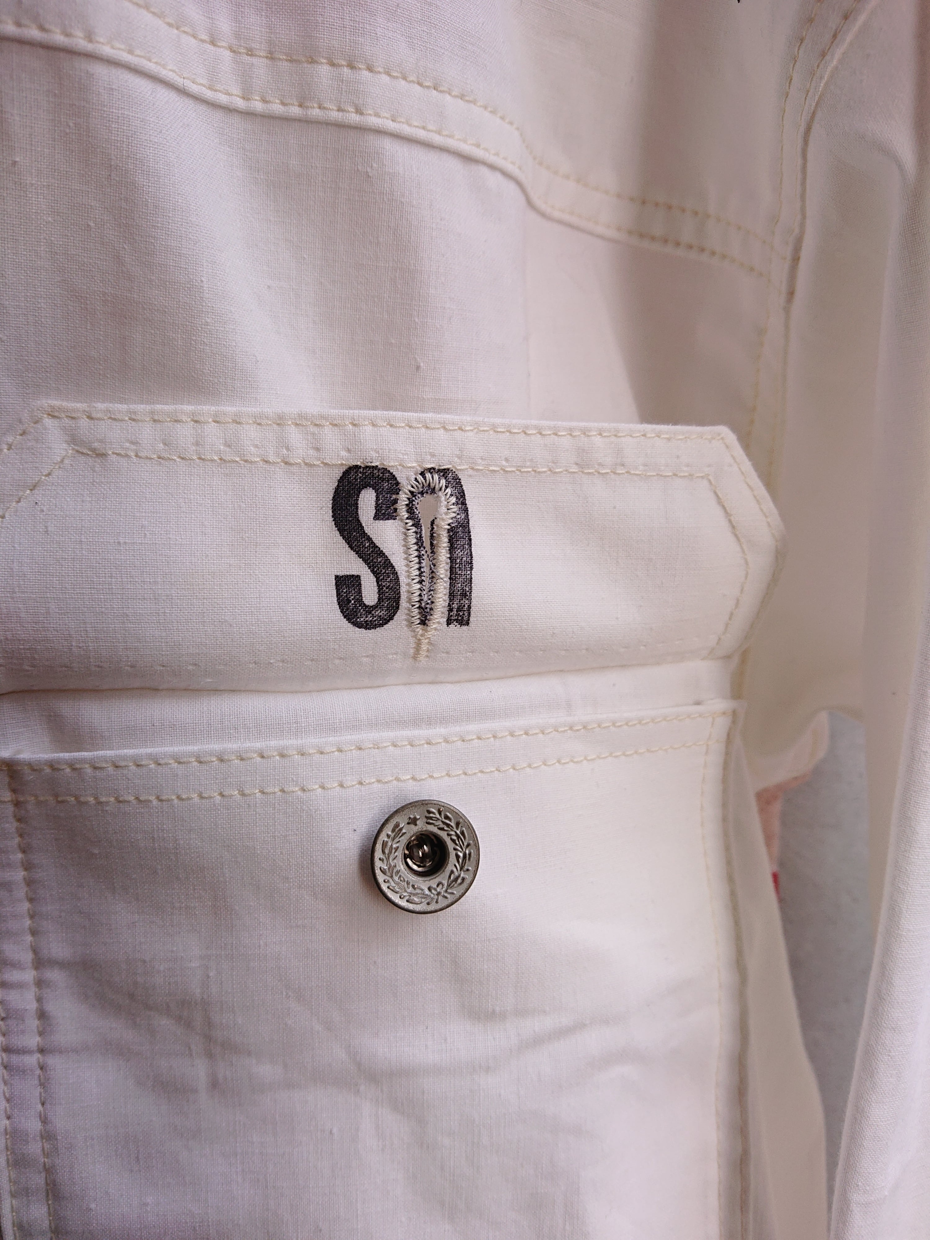 1960年代の米軍パネルマーカーシートをデッドストックを入手。今回は以前製作した2ndタイプに。ワイドシルエットの背中にアンティークナショナルフラッグをバックパーツに組み込んだ渾身の一作。 ステンシル部分の一部もフラップ裏や、カフスパーツ裏に使用は変わらず。昨今、この様な素材が纏まって入手出来る事は稀で、素晴らしい素材に巡り会える事も少なくなりました。ブランドタグはオールレーヨン糸で制作しものを使用し、ボタンは月桂樹ボタンに変更。