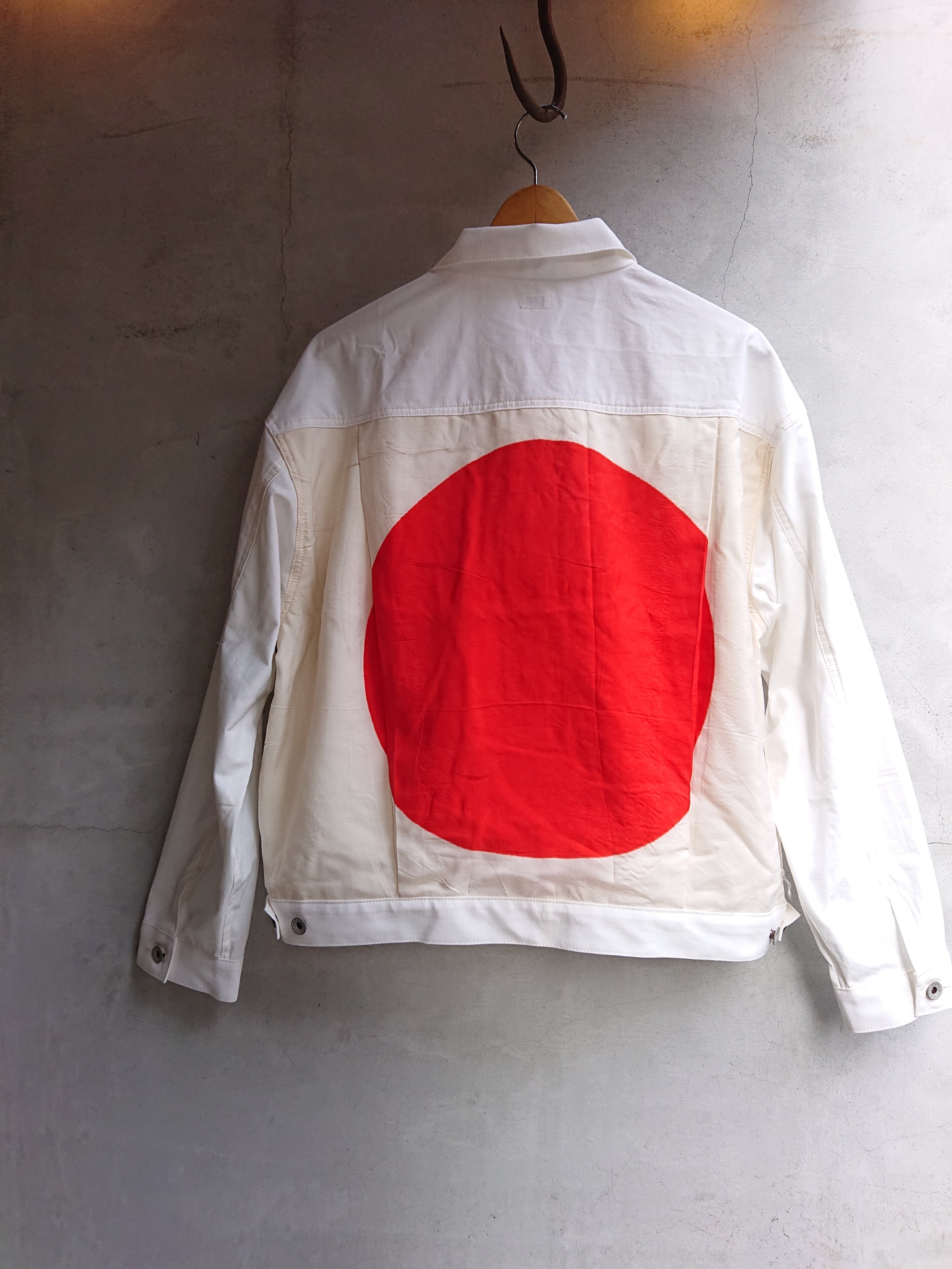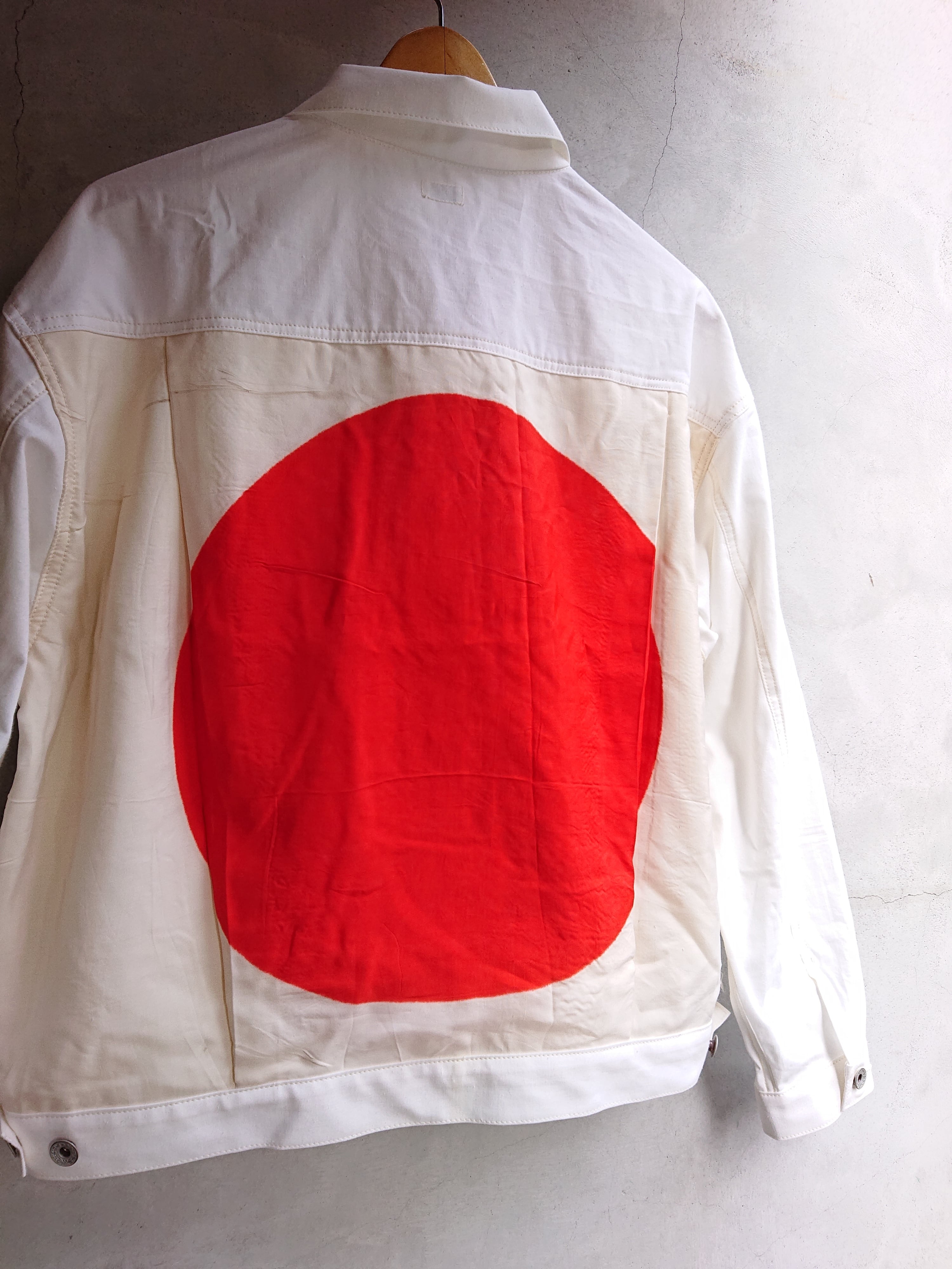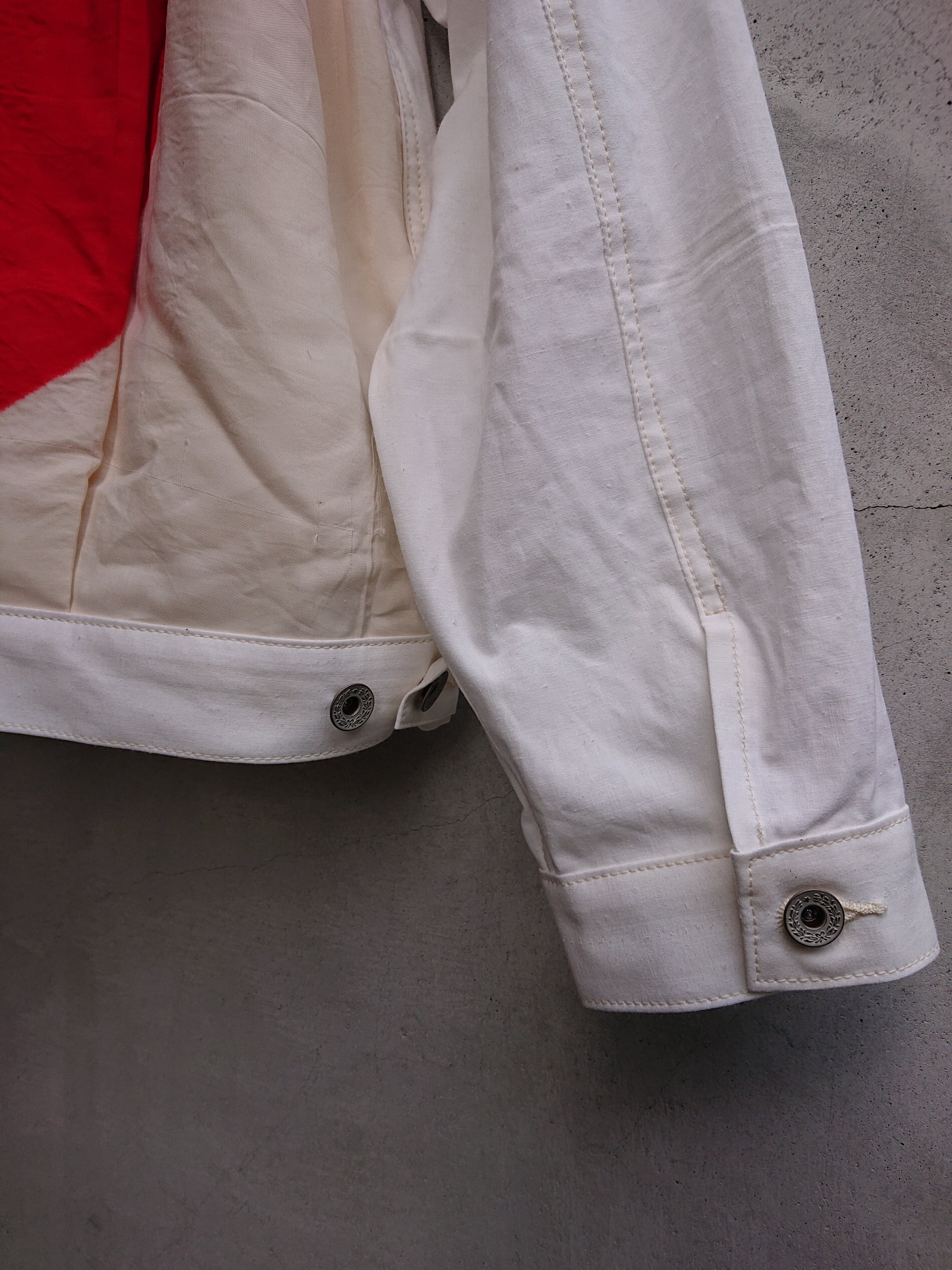 1960年代の米軍パネルマーカーシートをデッドストックを入手。今回は以前製作した2ndタイプに。ワイドシルエットの背中にアンティークナショナルフラッグをバックパーツに組み込んだ渾身の一作。 ステンシル部分の一部もフラップ裏や、カフスパーツ裏に使用は変わらず。昨今、この様な素材が纏まって入手出来る事は稀で、素晴らしい素材に巡り会える事も少なくなりました。ブランドタグはオールレーヨン糸で制作しものを使用し、ボタンは月桂樹ボタンに変更。