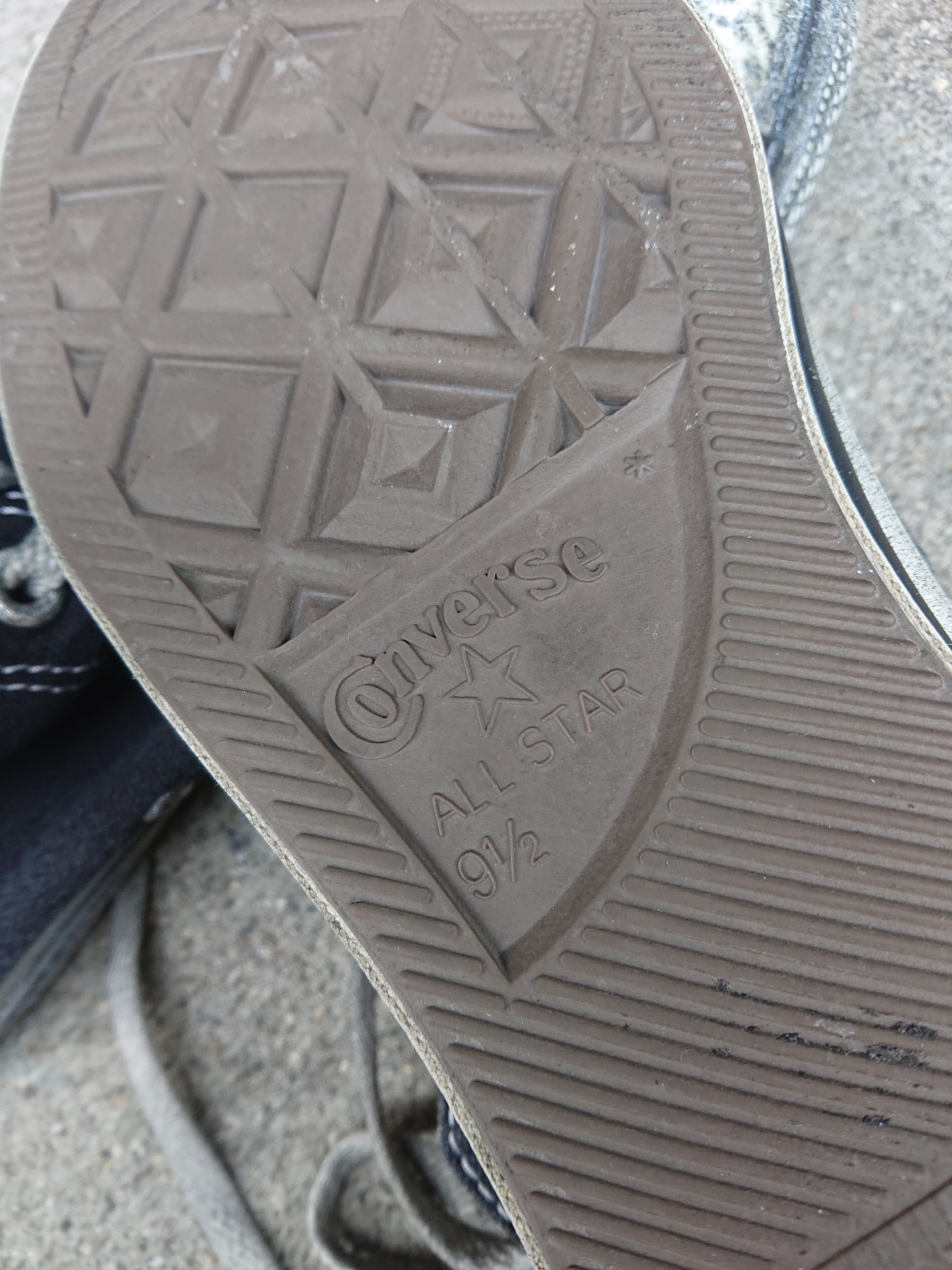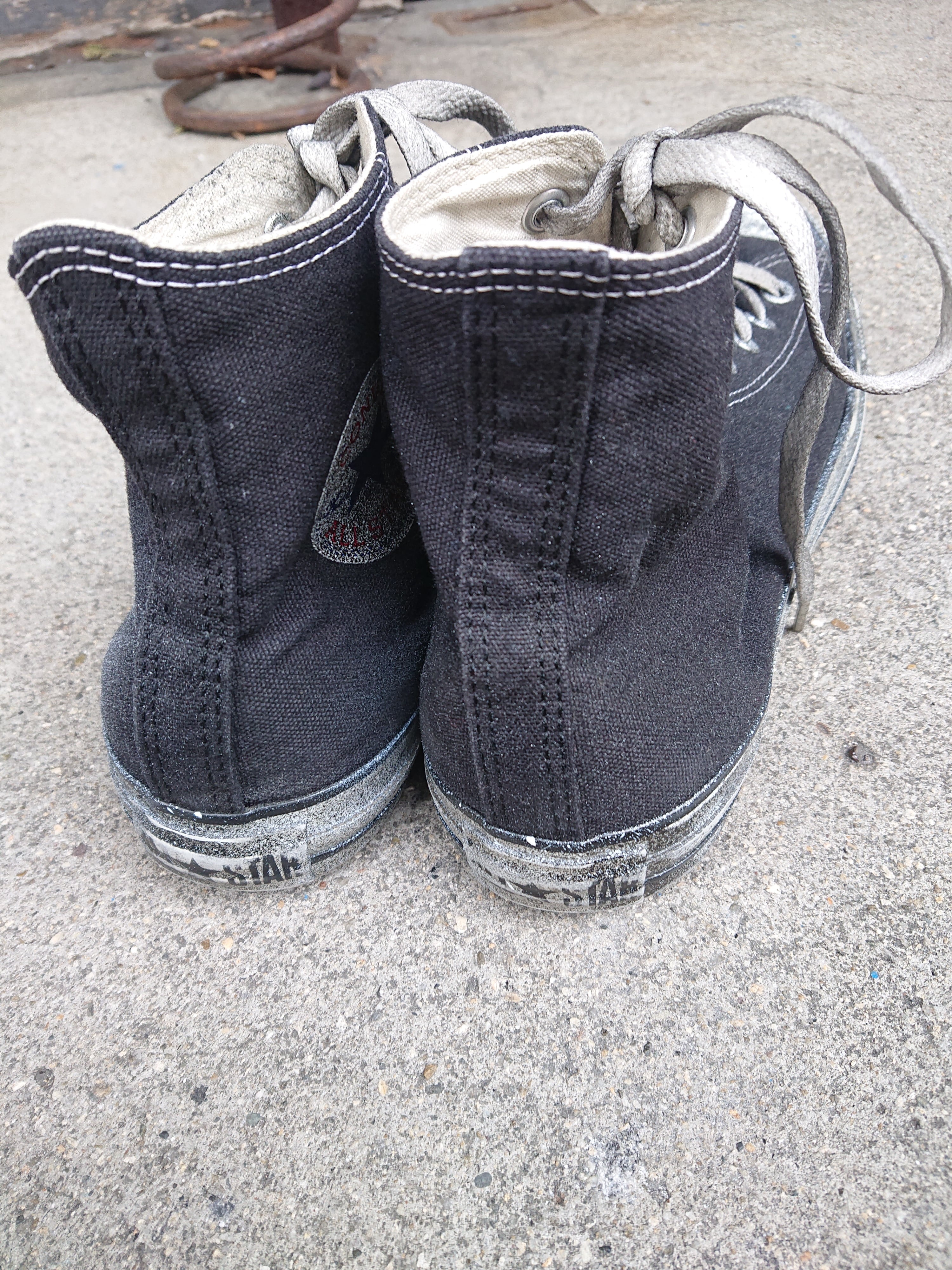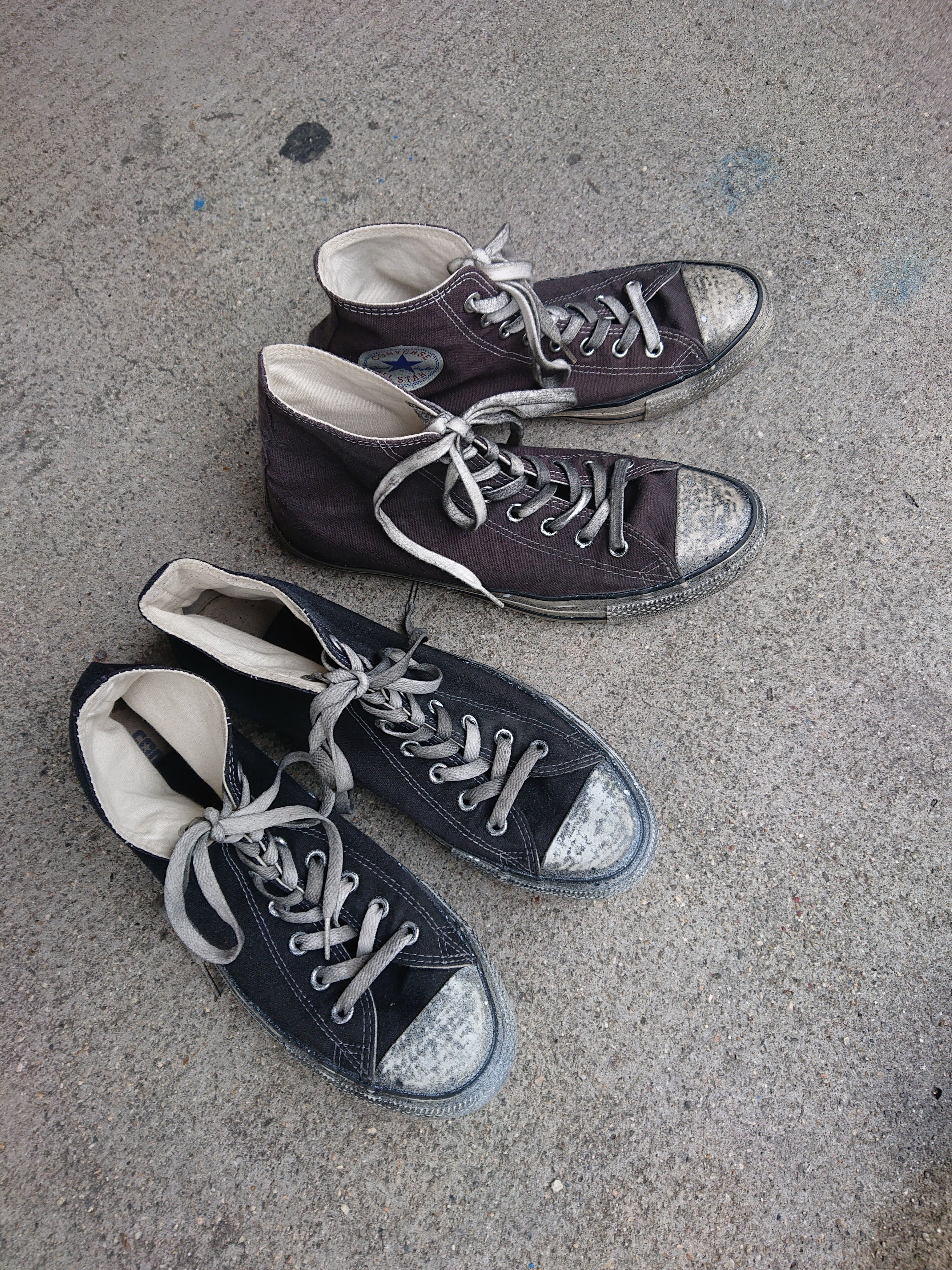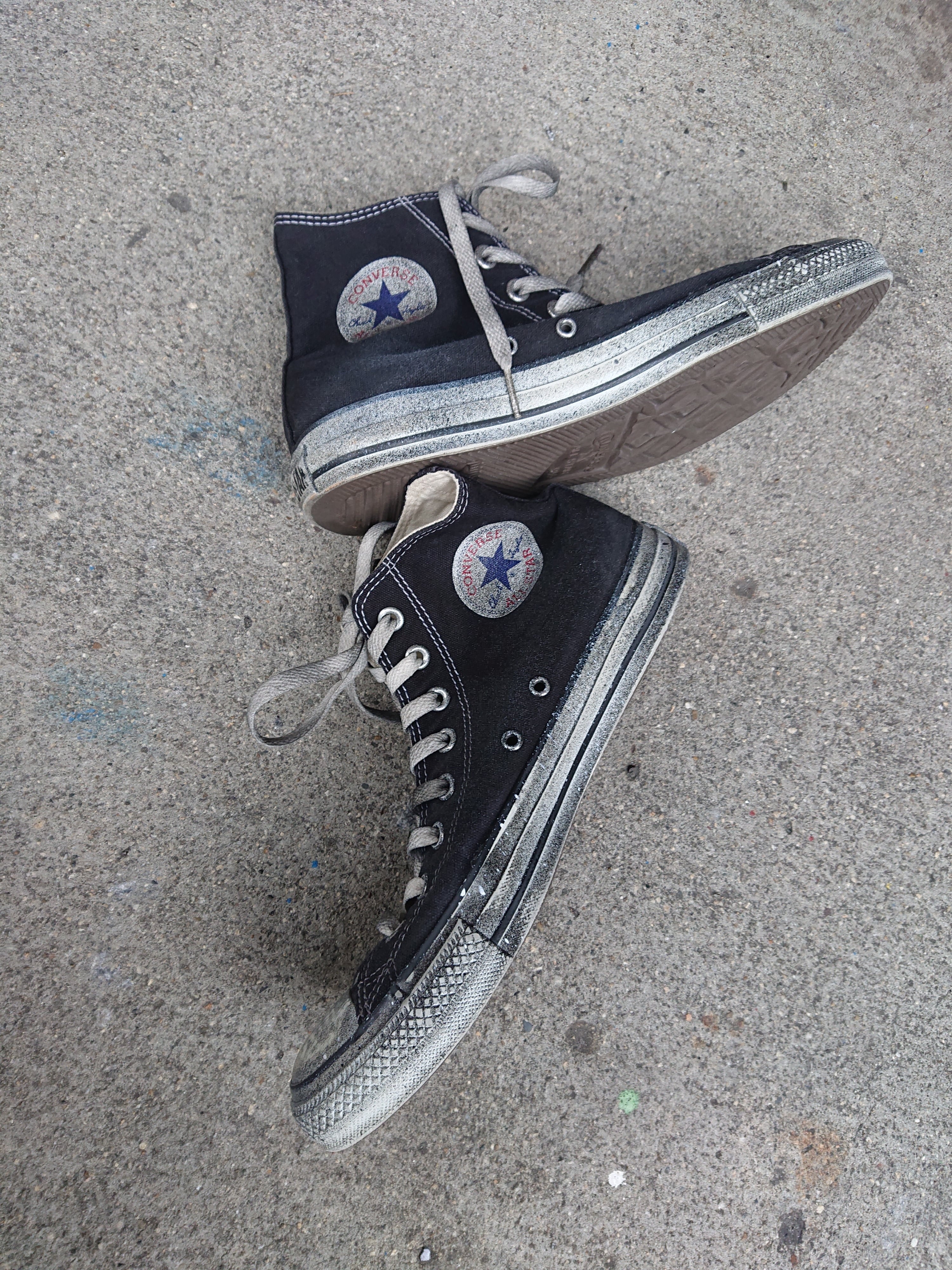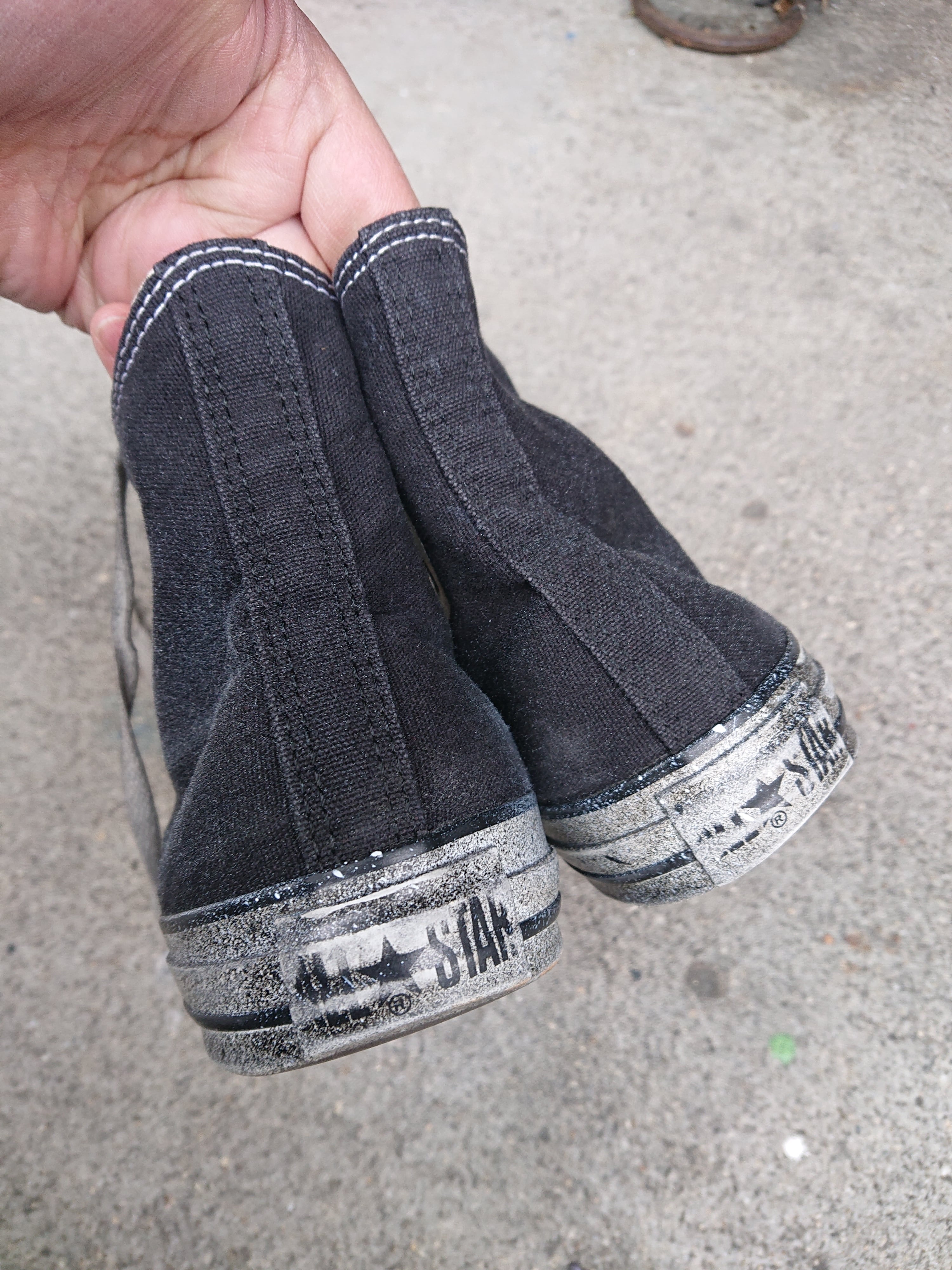 手作業でエイジング加工されたCONVERSE ALLSTAR。通常のブラックのオールスターとは一味違う雰囲気。着用されており、使用感はありますがソールの減りもまだ少なくガンガン履いていただける一足です。インドネシア製。