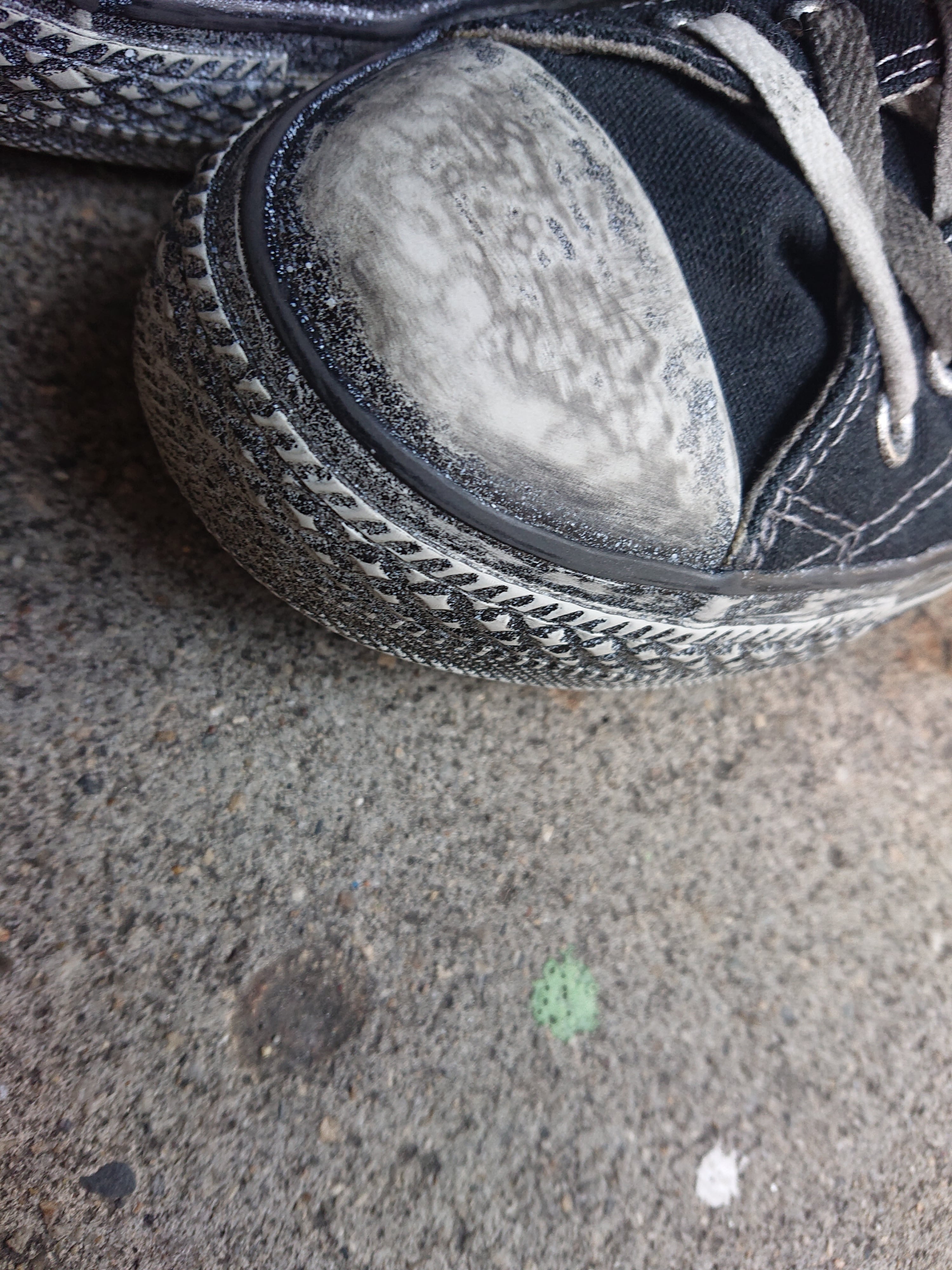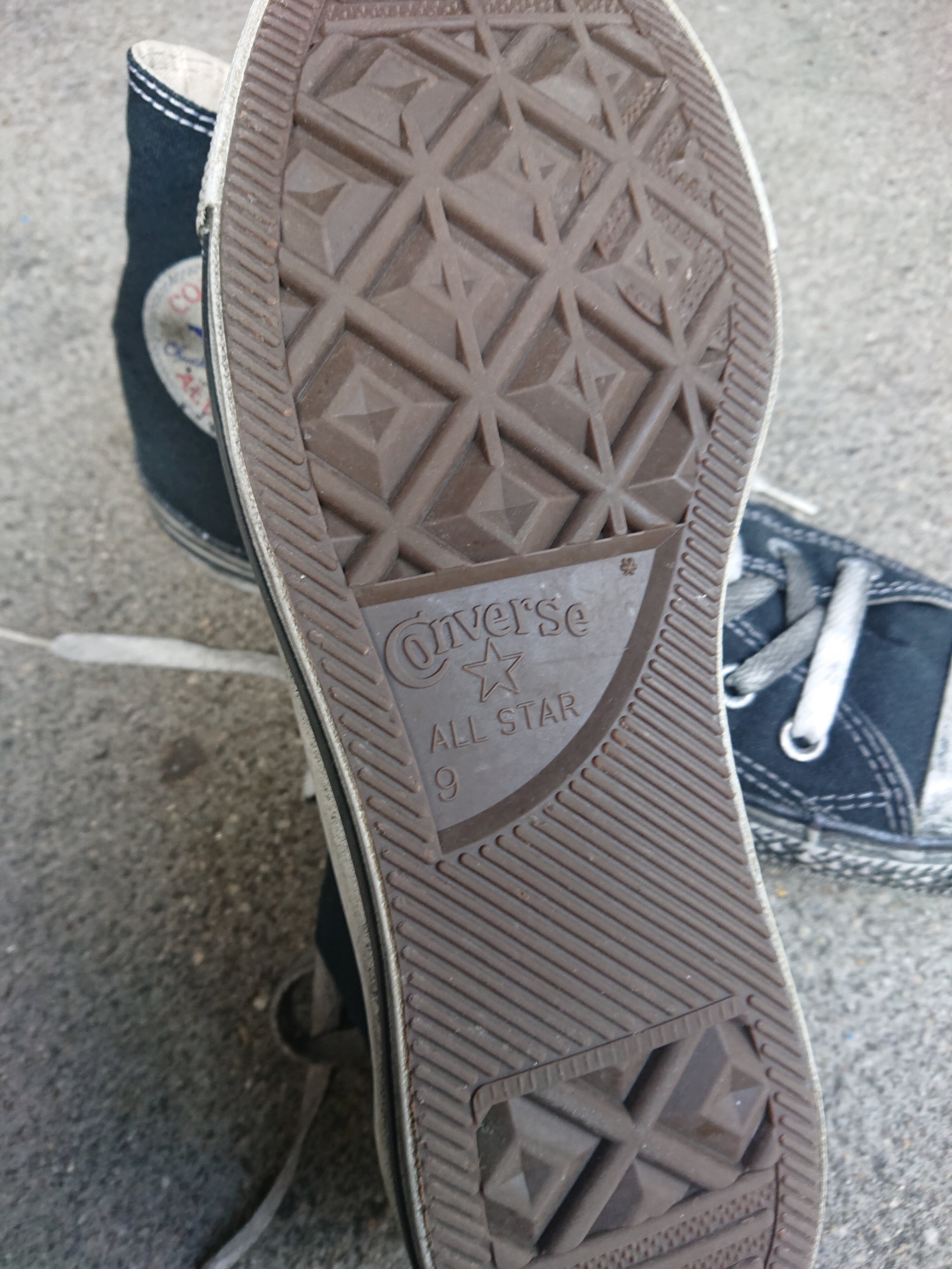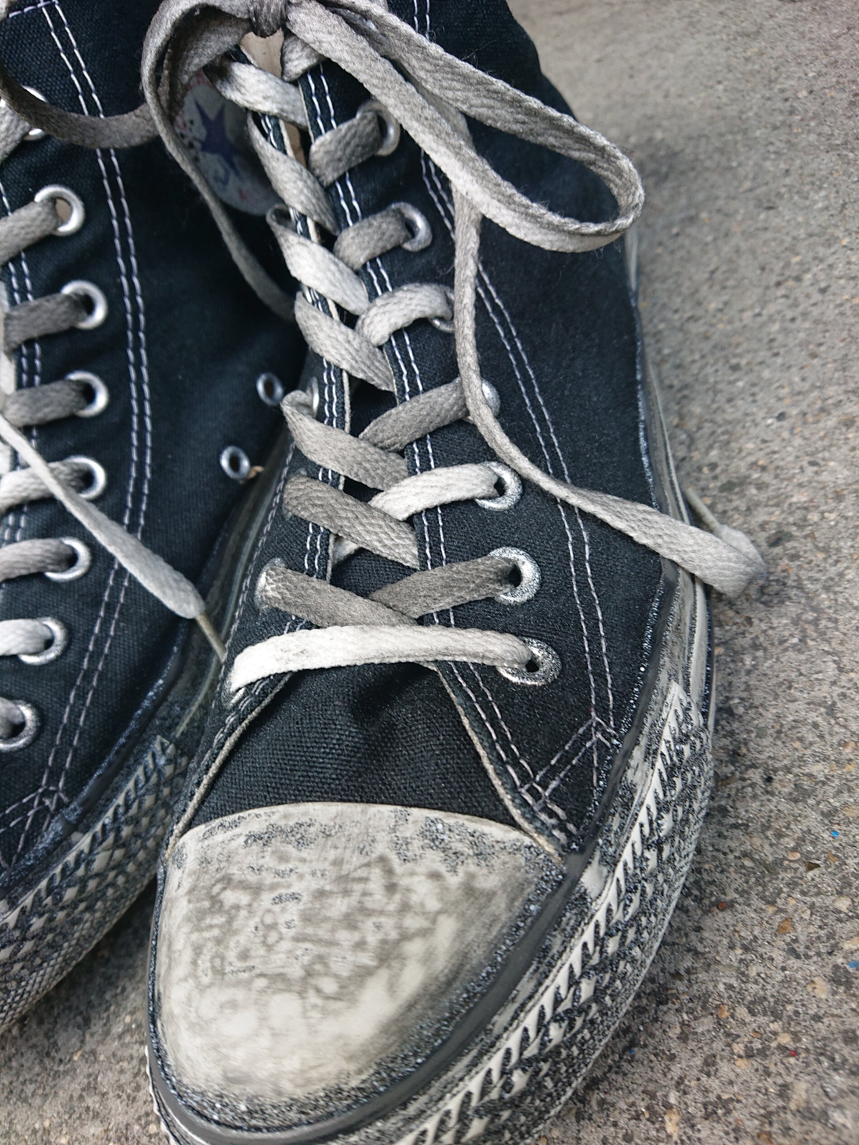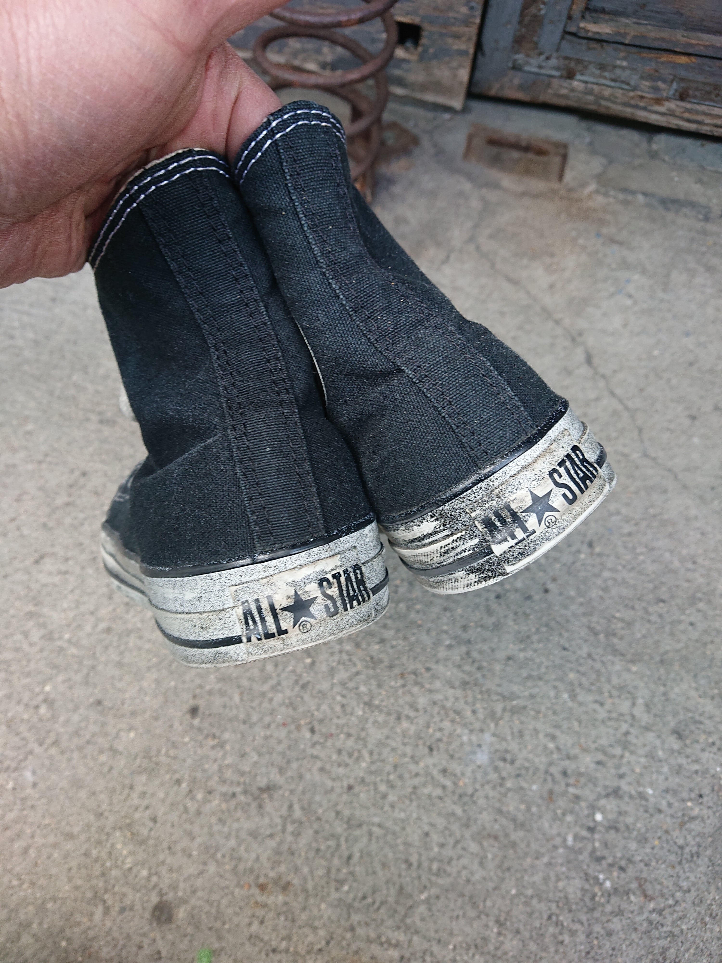 手作業でエイジング加工されたCONVERSE ALLSTAR。通常のブラックのオールスターとは一味違う雰囲気。着用されており、使用感はありますがソールの減りもまだ少なくガンガン履いていただける一足です。ミャンマー製。