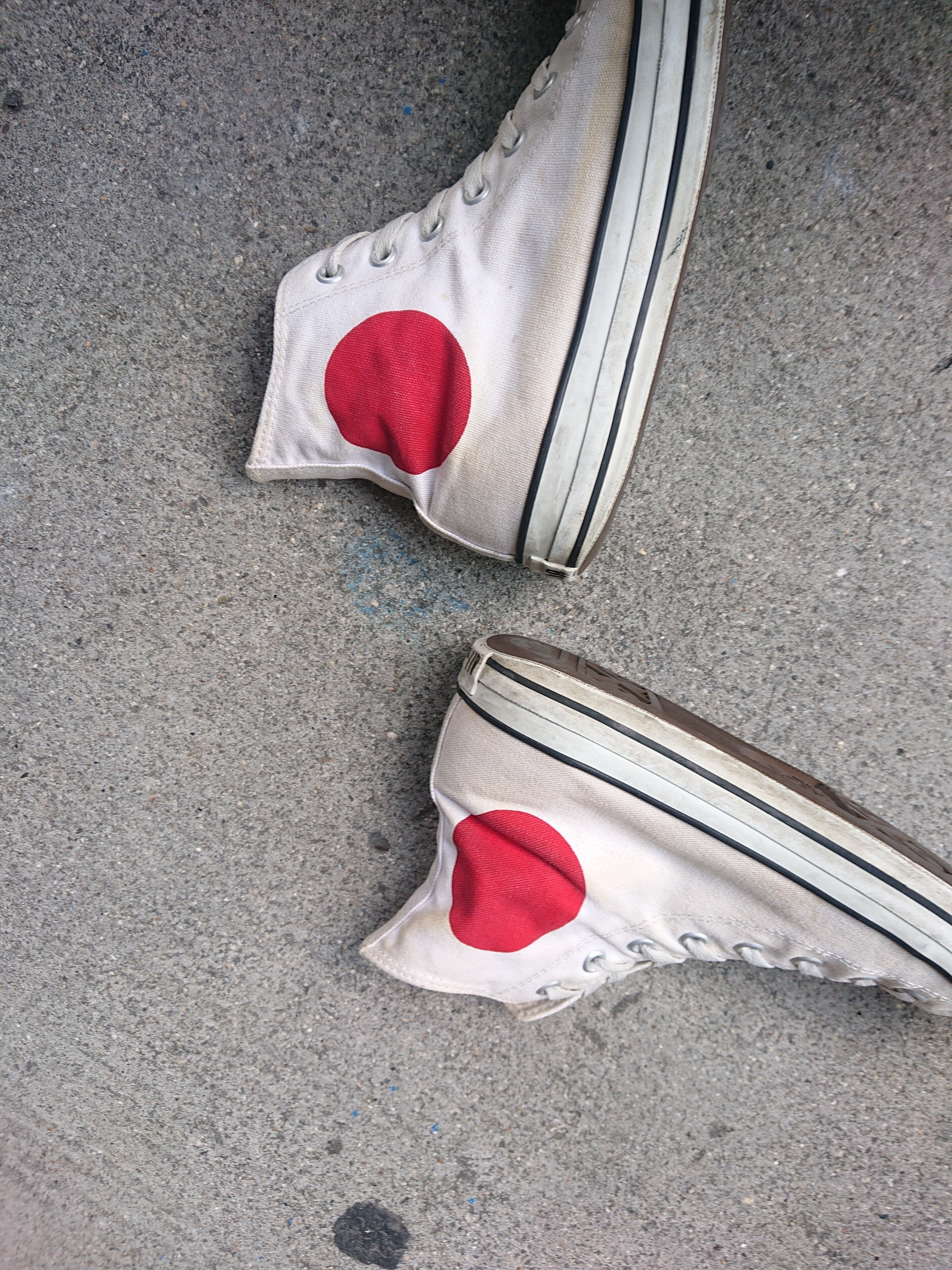 MADE IN JAPANのCONVERSE ALLSTAR 日の丸。ベーシックで幅広いスタイルに使えるオールスターも日の丸となれば一癖感じるスニーカーに。丸型コンバースパッチは取れてますがその分日の丸がより目を惹いてくれてます。ソールの減りはありますが着用に問題はありません。