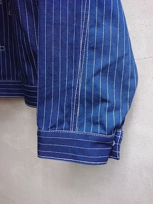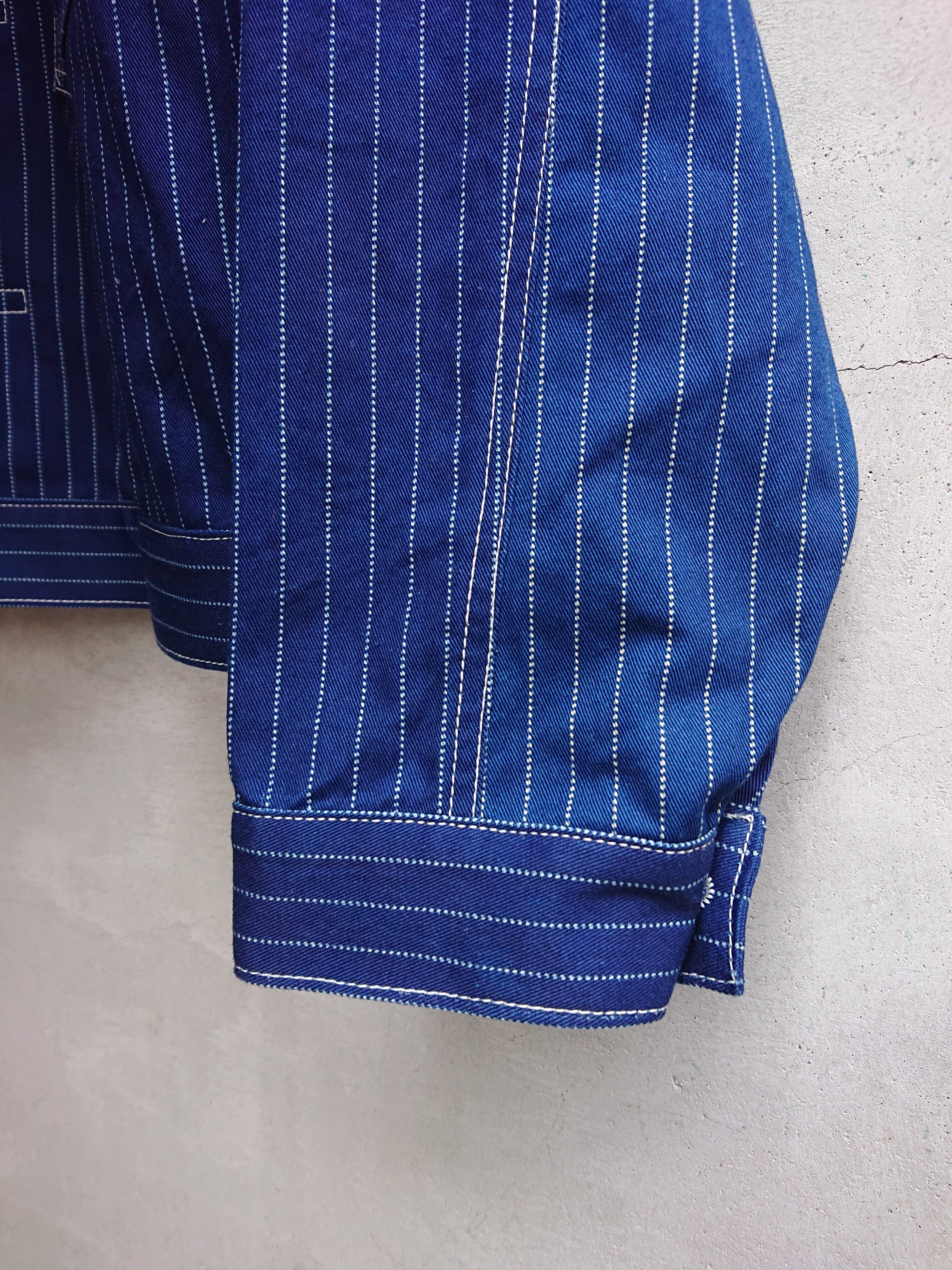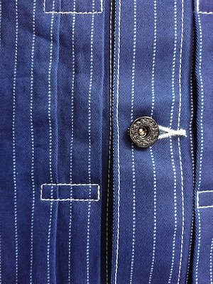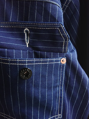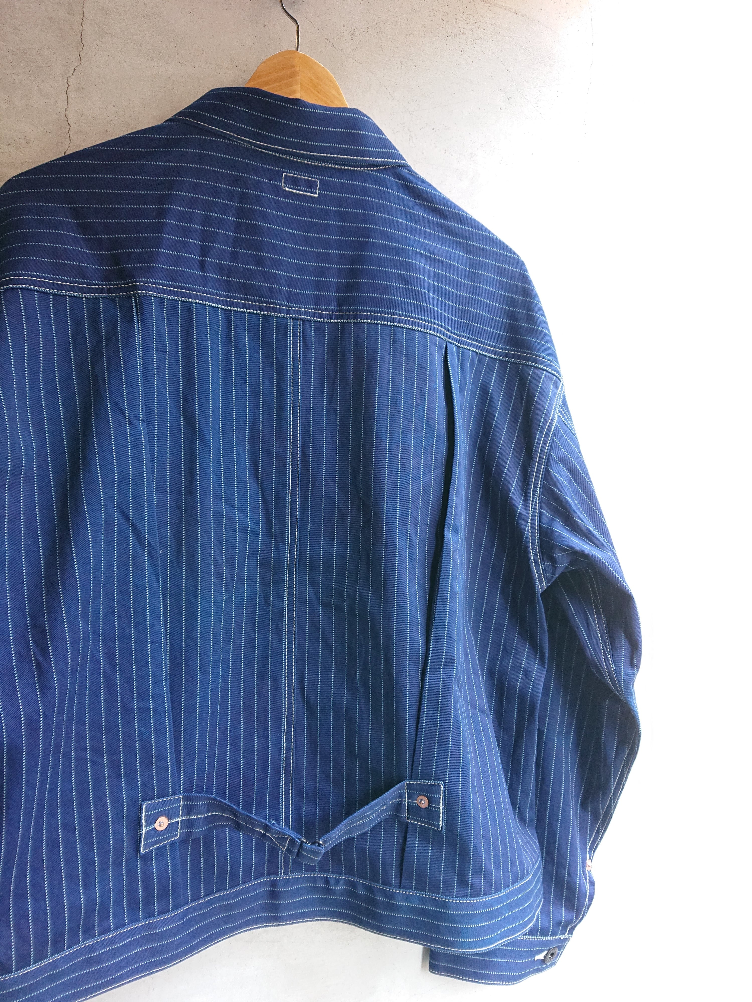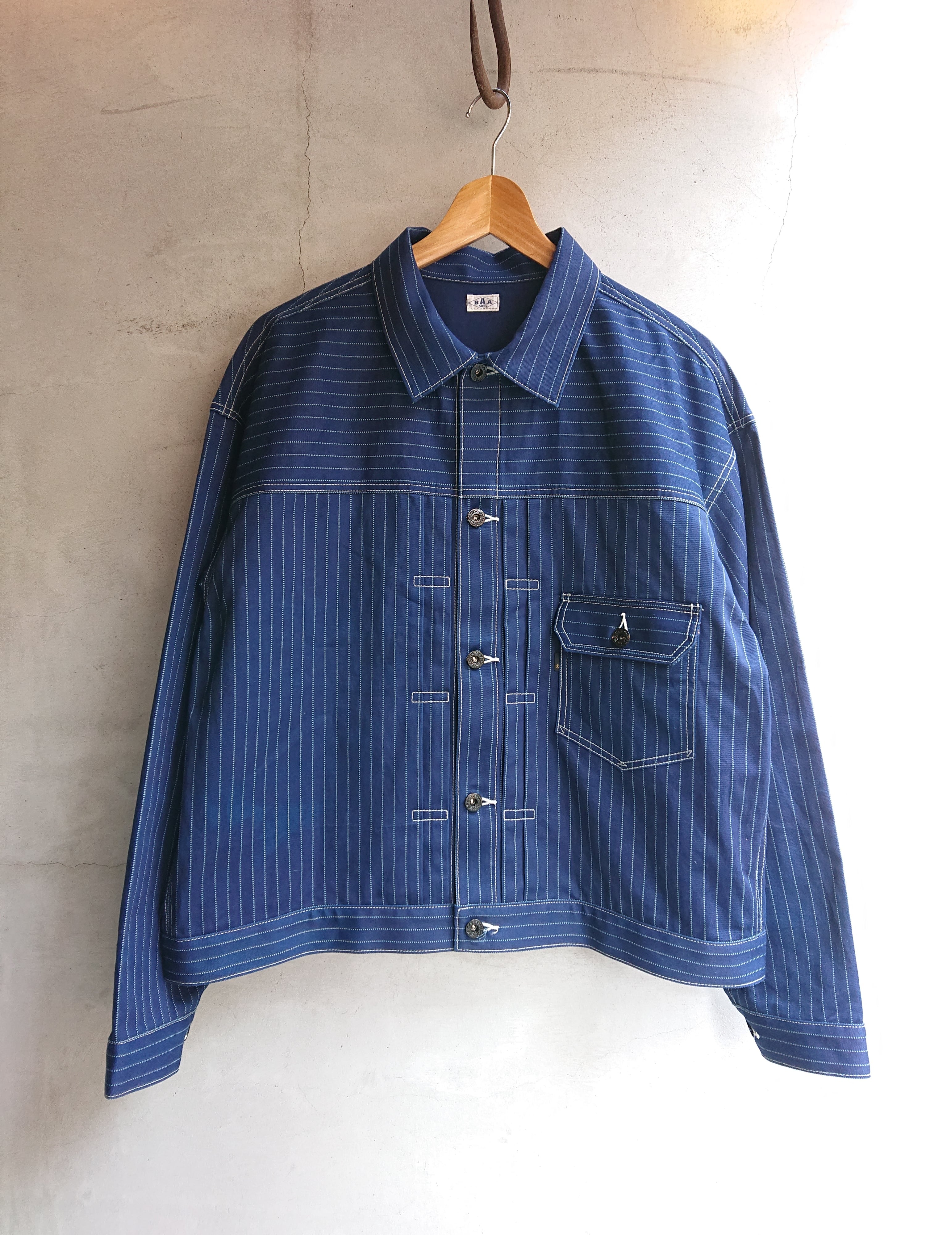 NEWのWABASHストライプの生地を使い一着のみ製作したBAA 1st MODEL。今まで色々な生地で製作しましたがWABASH生地で1stタイプのスプリットバック(ワイドシルエット)は初となります。ヴィンテージ生地ではないので気を使わずにガンガン着て色落ちも楽しんでもらいたいジャケットです。