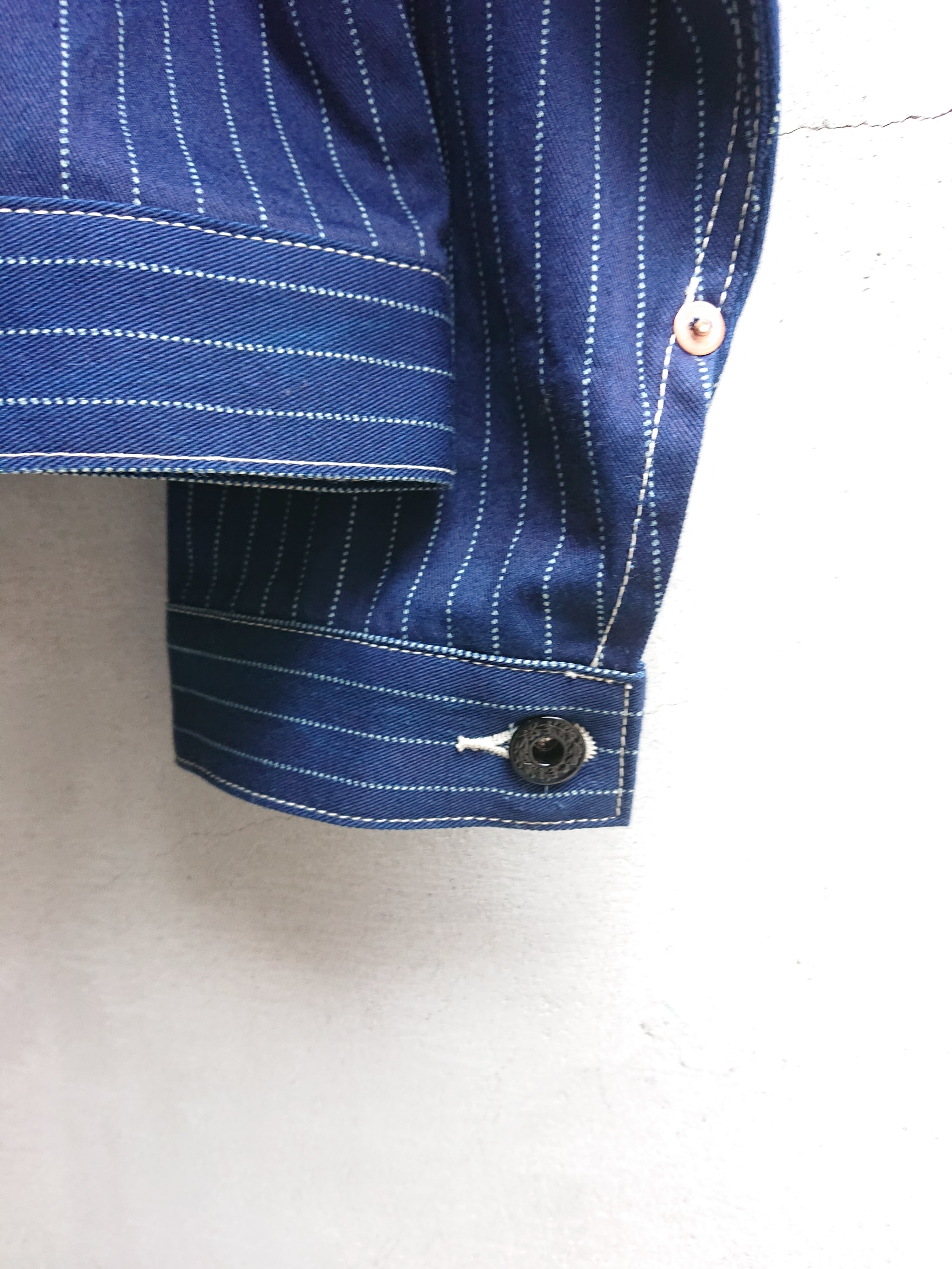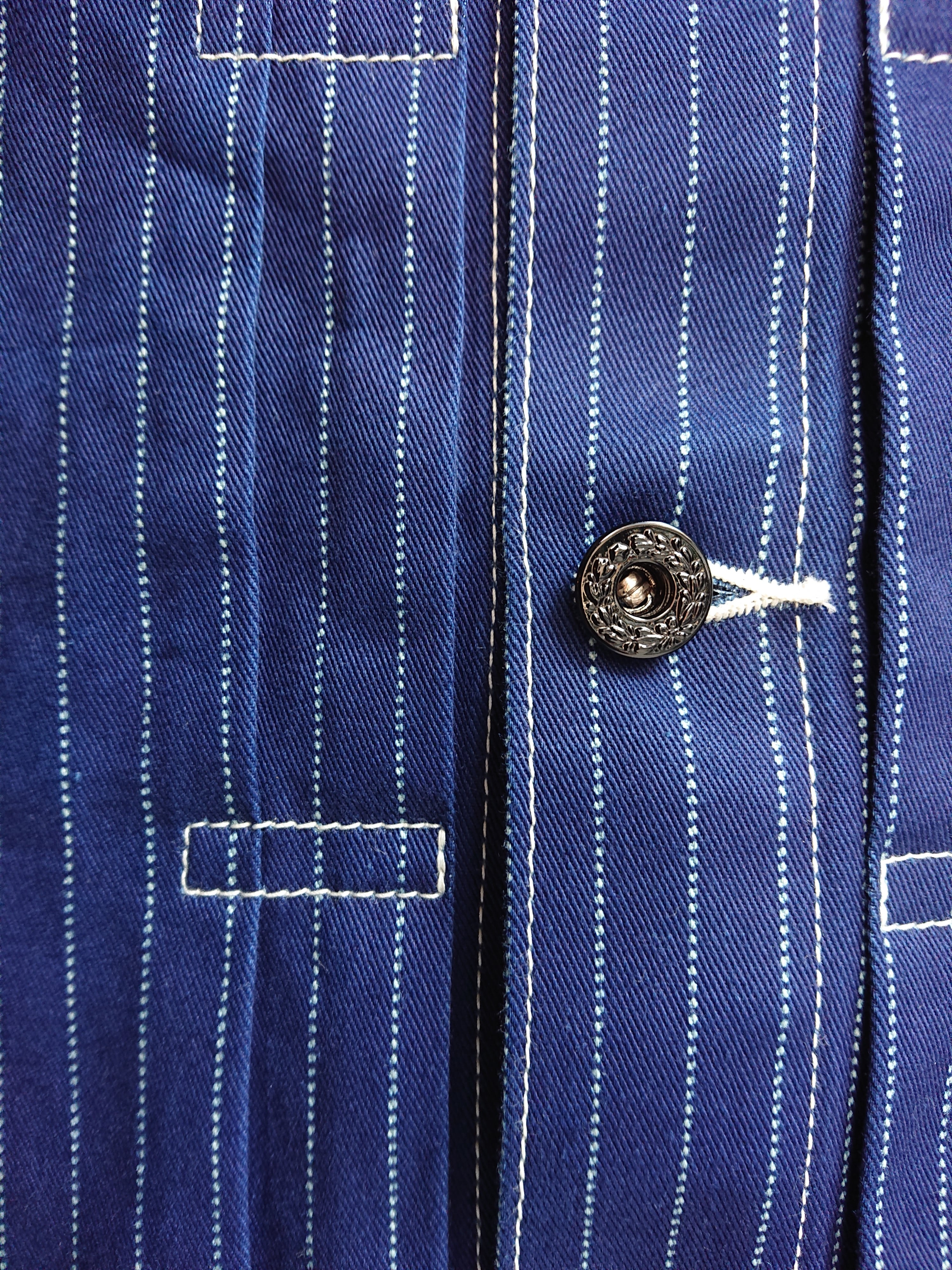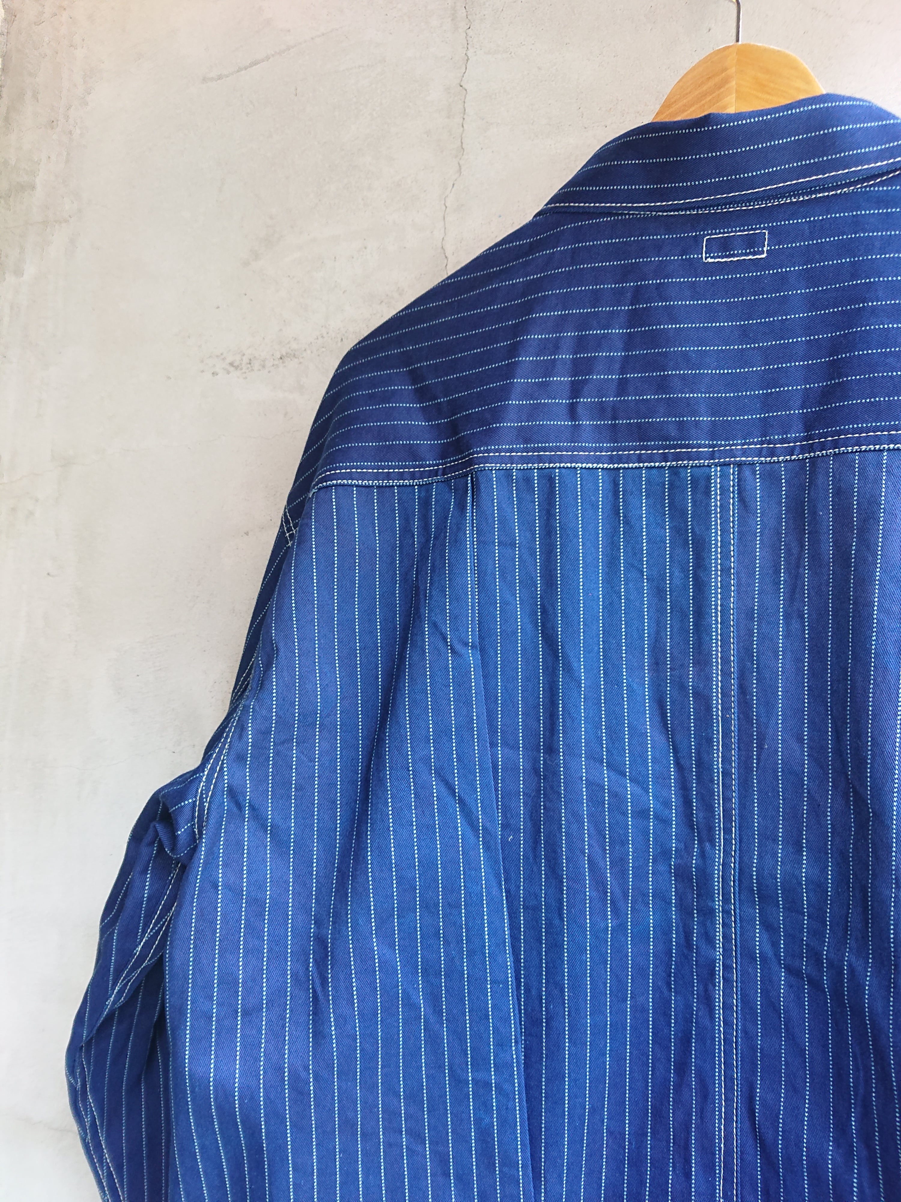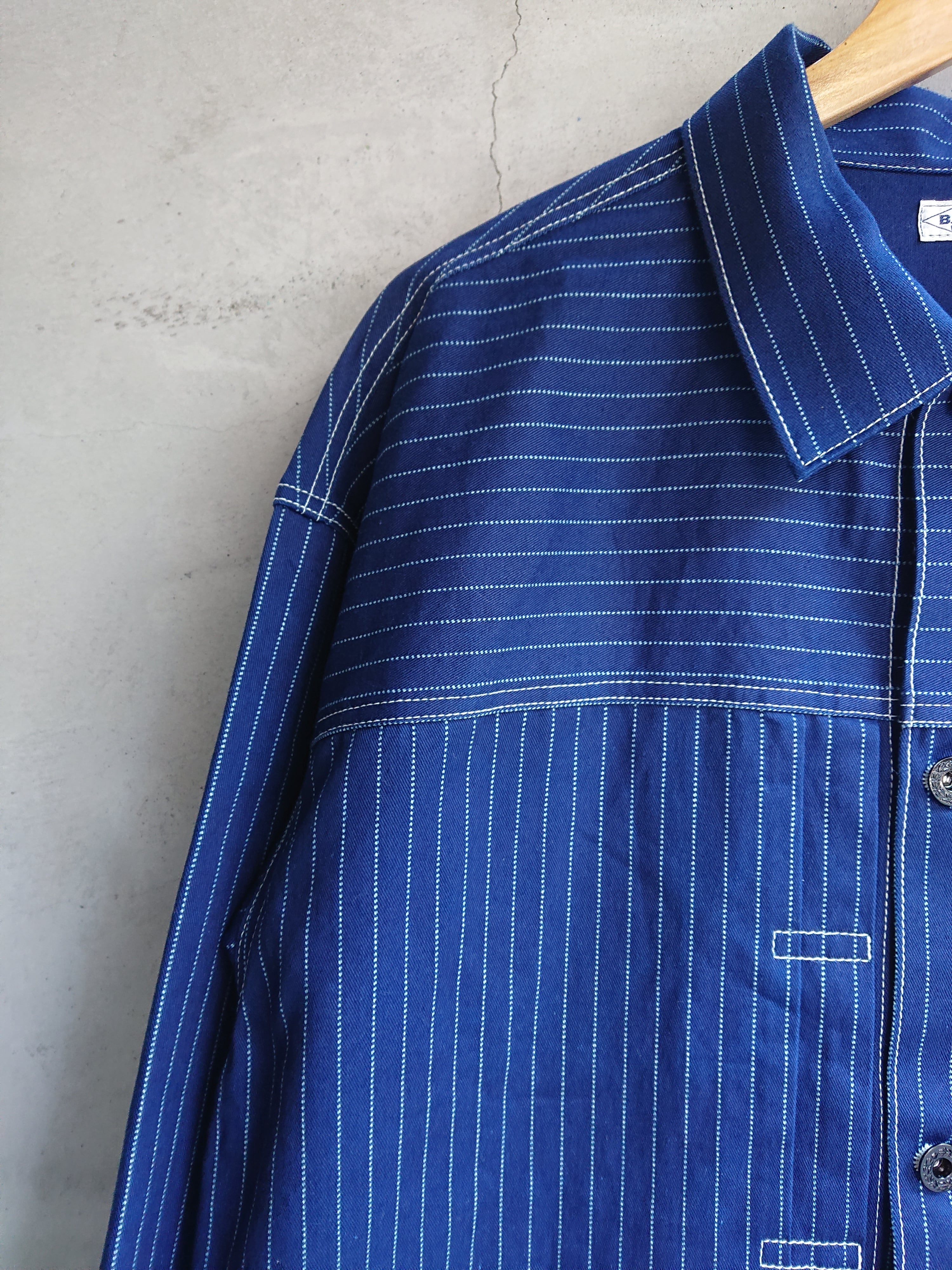 NEWのWABASHストライプの生地を使い一着のみ製作したBAA 1st MODEL。今まで色々な生地で製作しましたがWABASH生地で1stタイプのスプリットバック(ワイドシルエット)は初となります。ヴィンテージ生地ではないので気を使わずにガンガン着て色落ちも楽しんでもらいたいジャケットです。