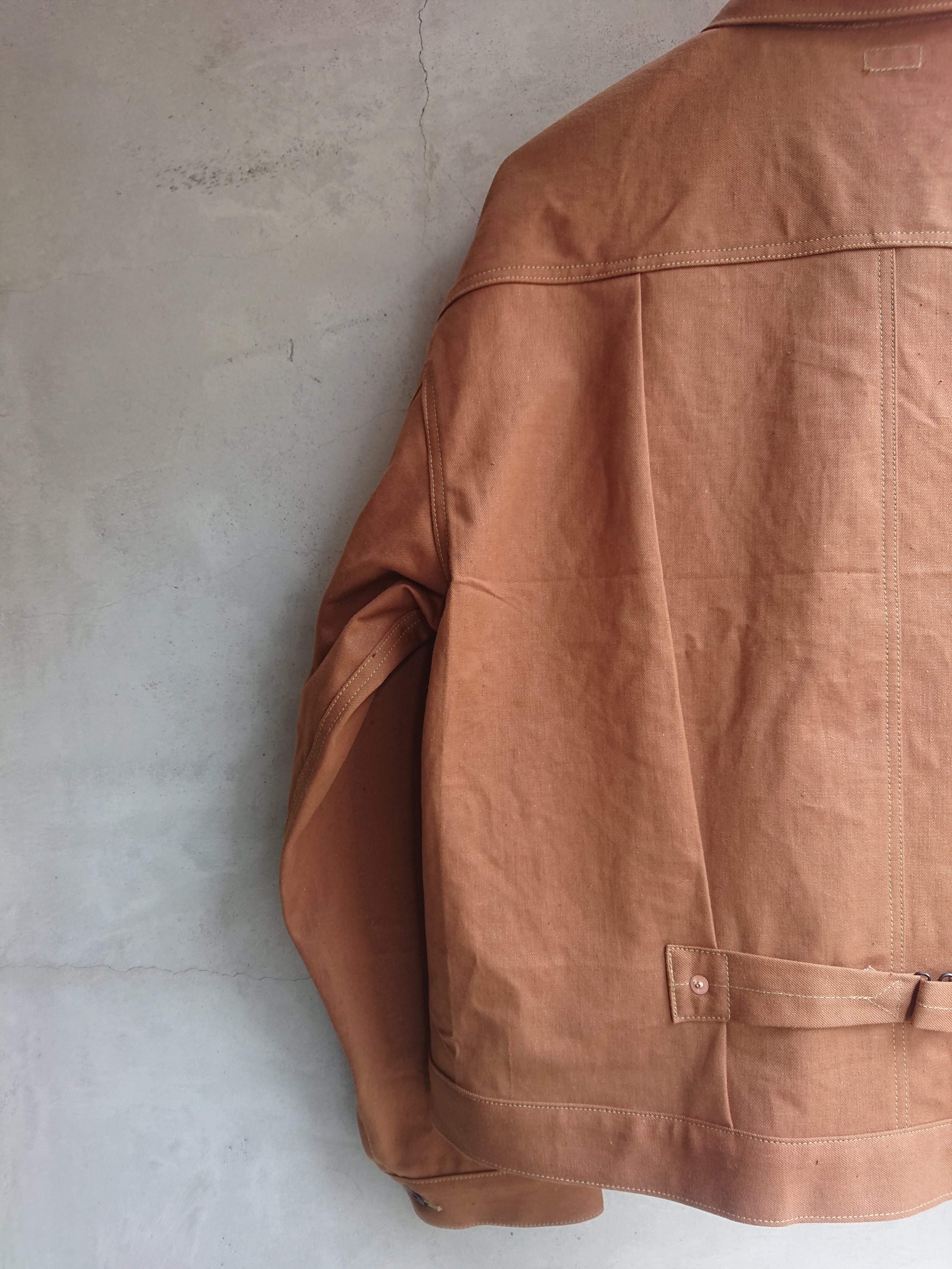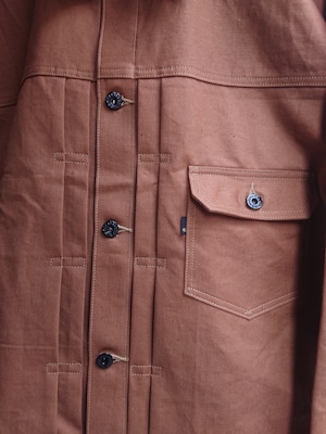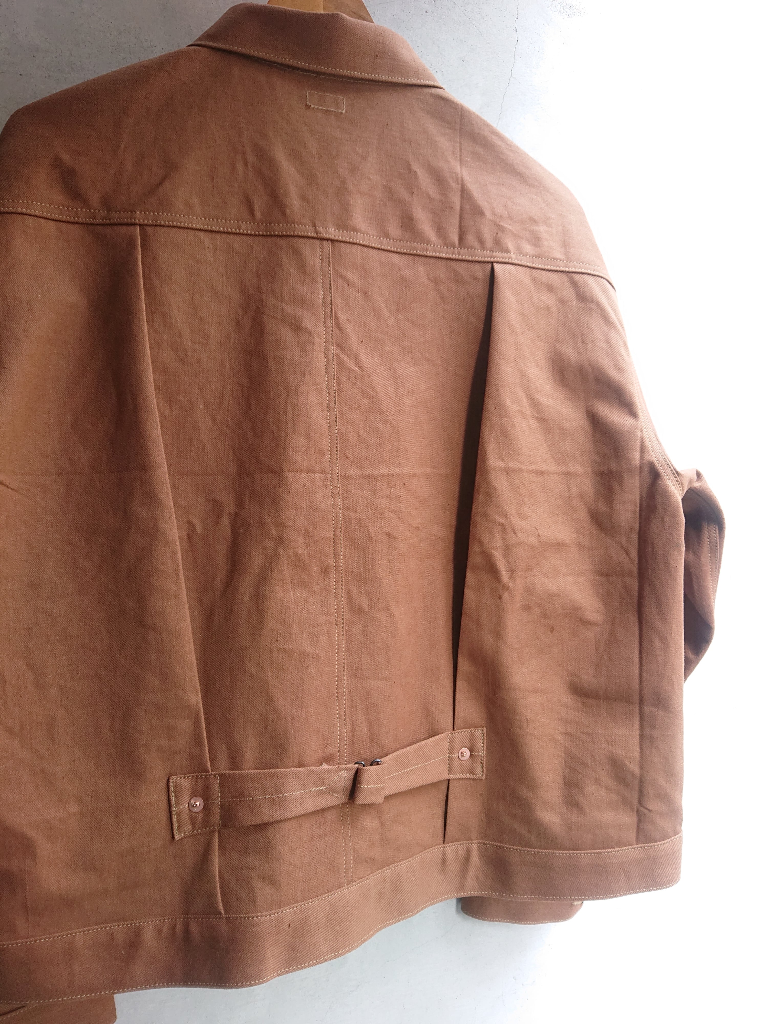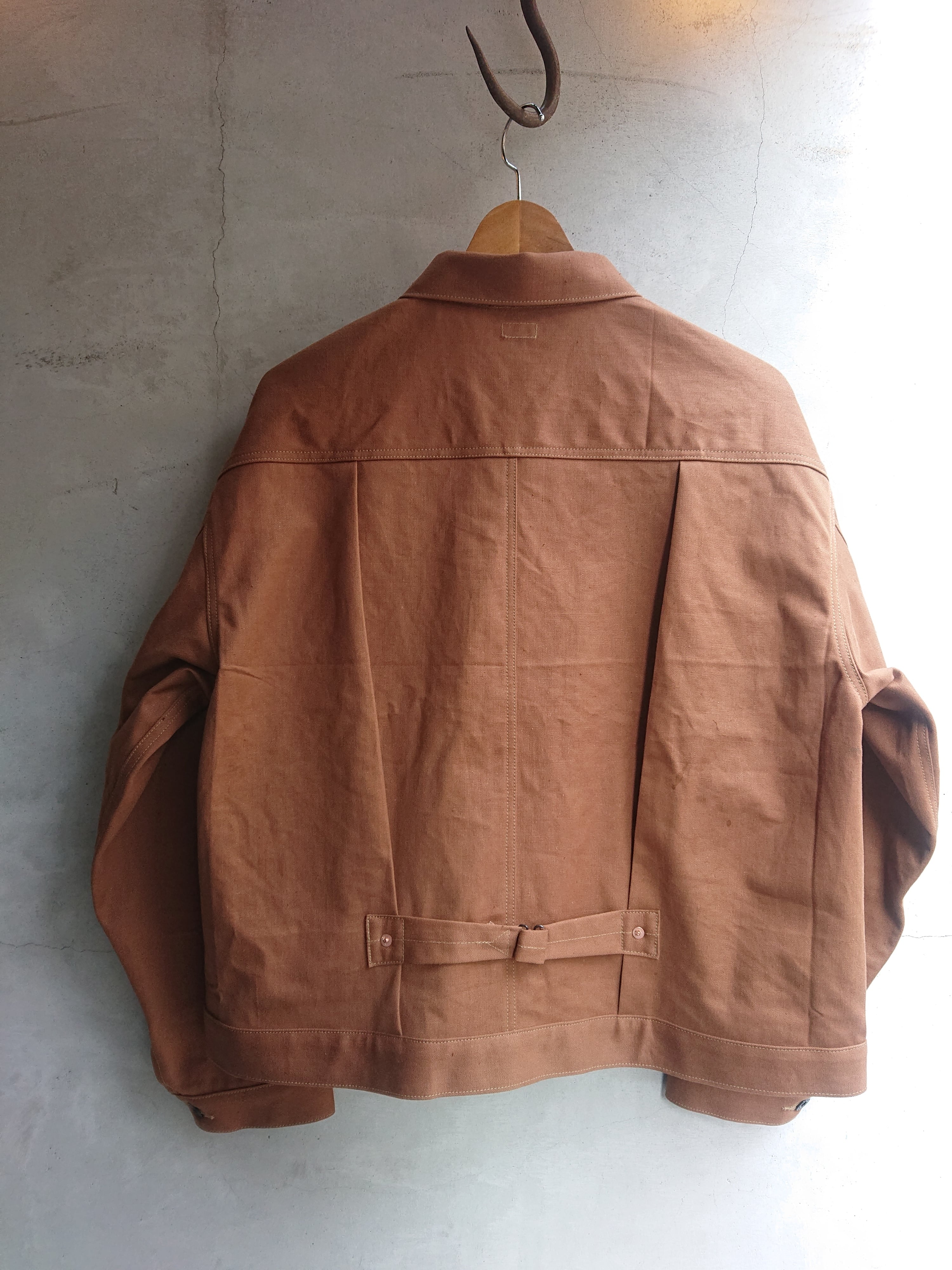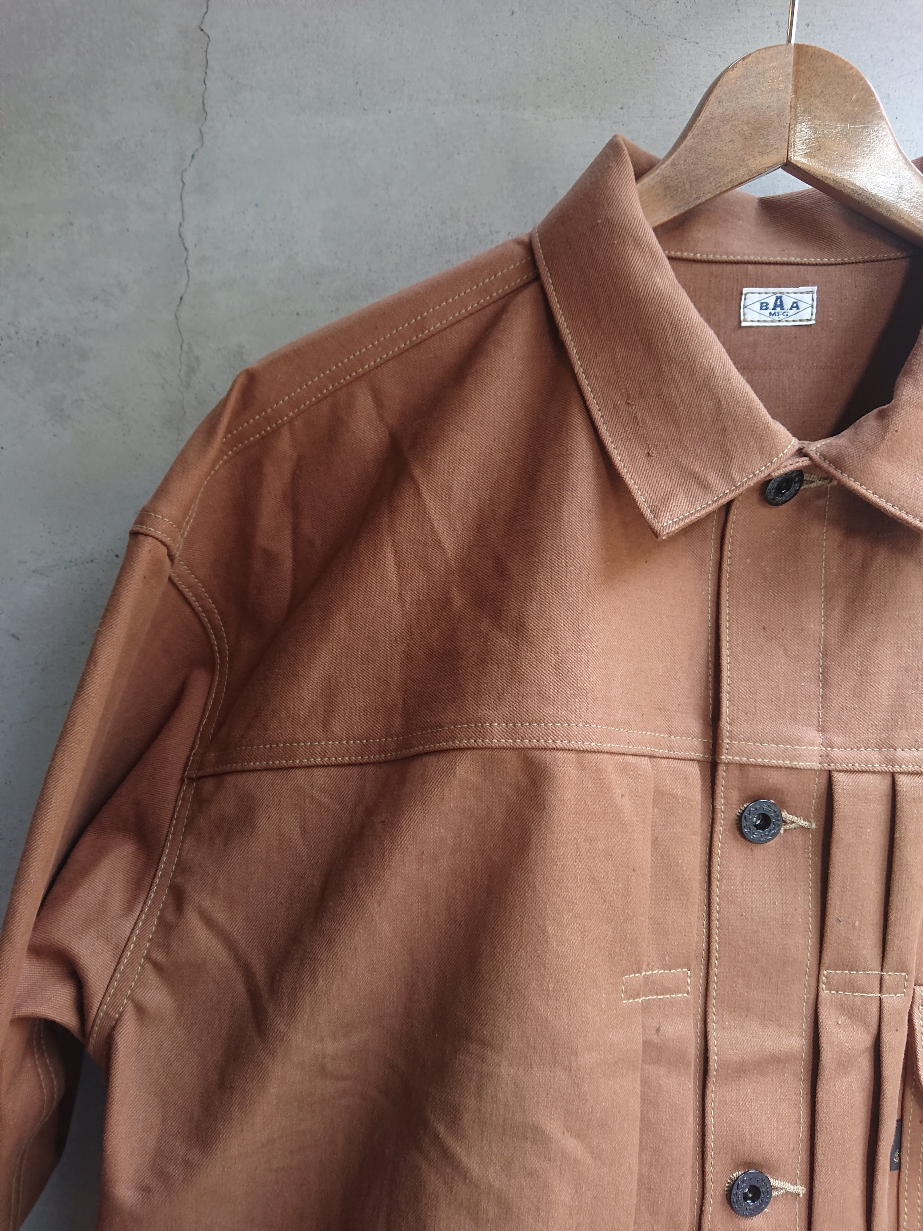 VINTAGEのテント生地を使い一着のみ製作したBAA 1st MODEL。ブラウン、ダックのような色目でテント生地ですがデニムのような生地感。どんな風な雰囲気になっていくのか楽しみでもあります。デザインは1stタイプのスプリットバック(ワイドシルエット)。今まで製作してない生地だけに魅力な一着です。