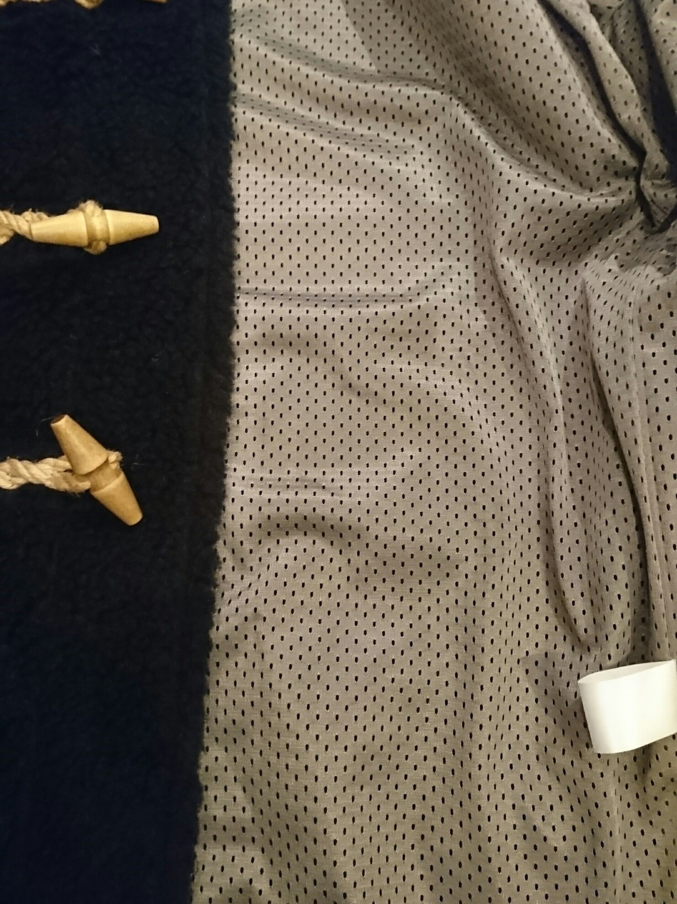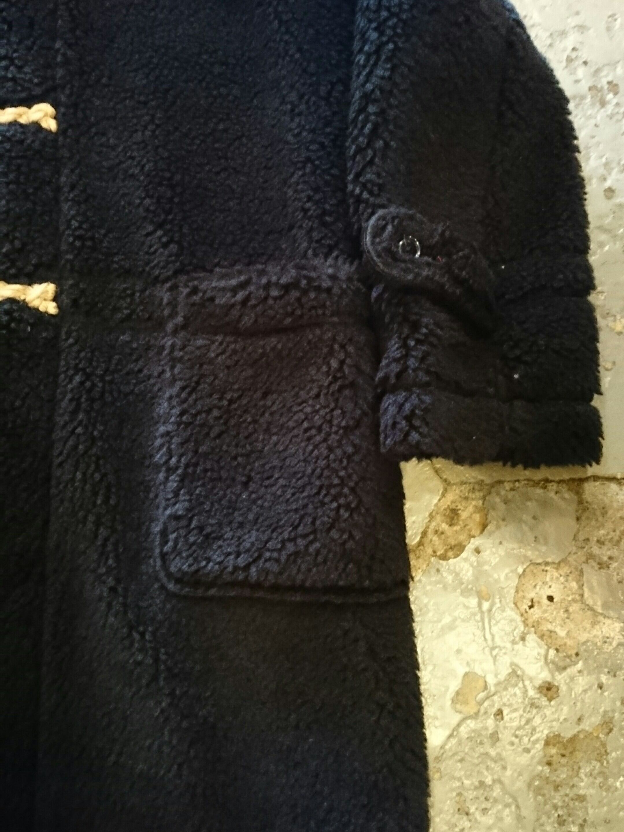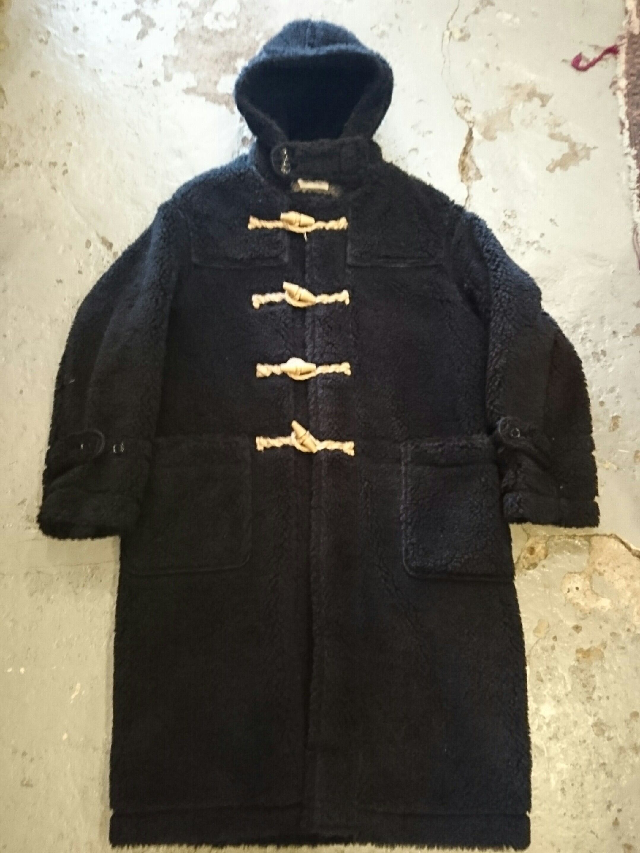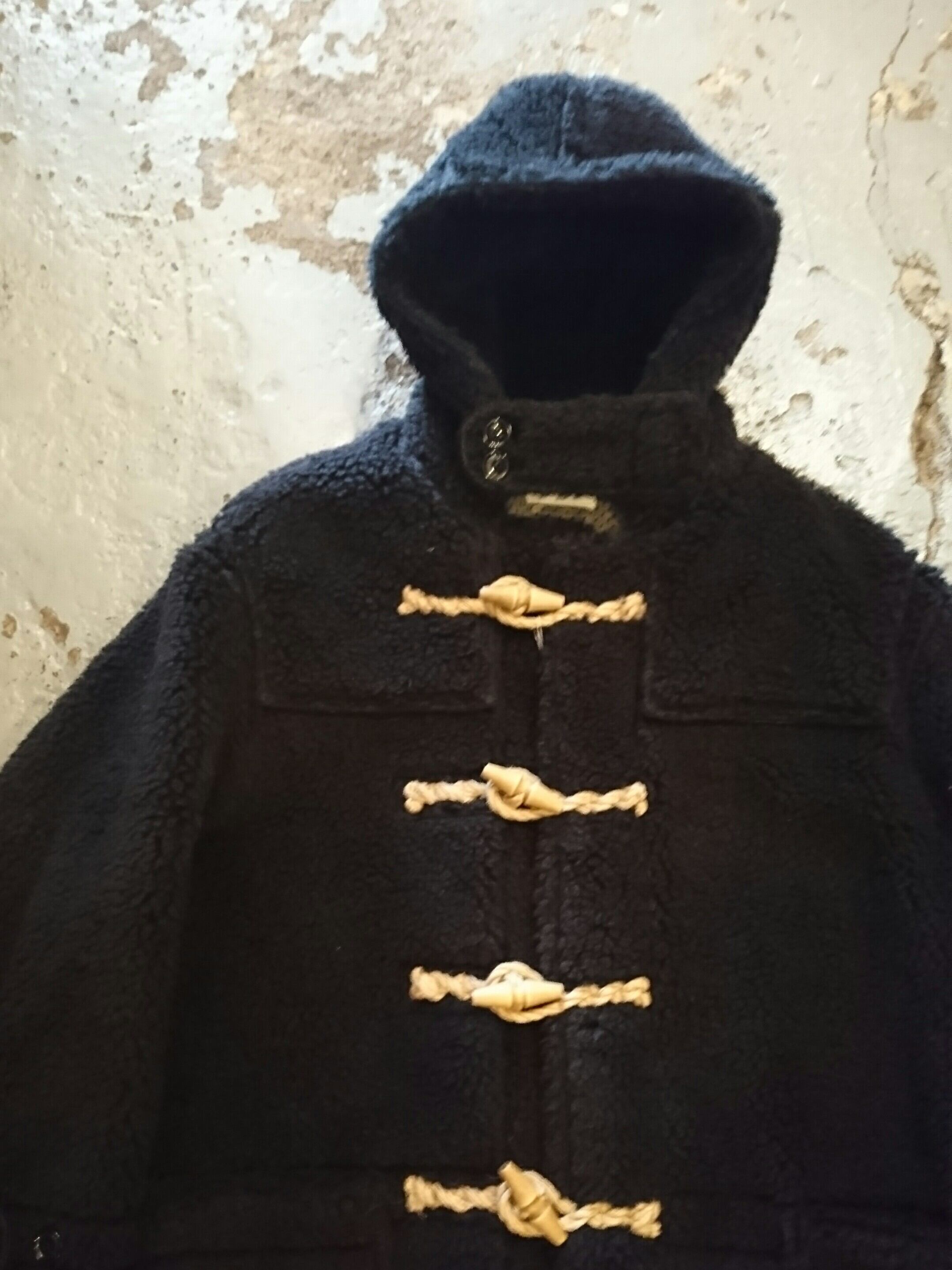 背中にインパクトのあるプリント。フリーハンドで一点一点エアブラシを施したボア ダッフルコート。ウールのダッフルコートとは違い着用した時軽く、ゆったりとシルエットにモコモコ感がとても目を惹く1着です。