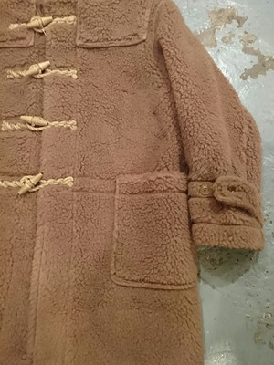 背中にインパクトのあるプリント。フリーハンドで一点一点エアブラシを施したボア ダッフルコート。ウールのダッフルコートとは違い着用した時軽く、ゆったりとシルエットにモコモコ感がとても目を惹く1着です。
