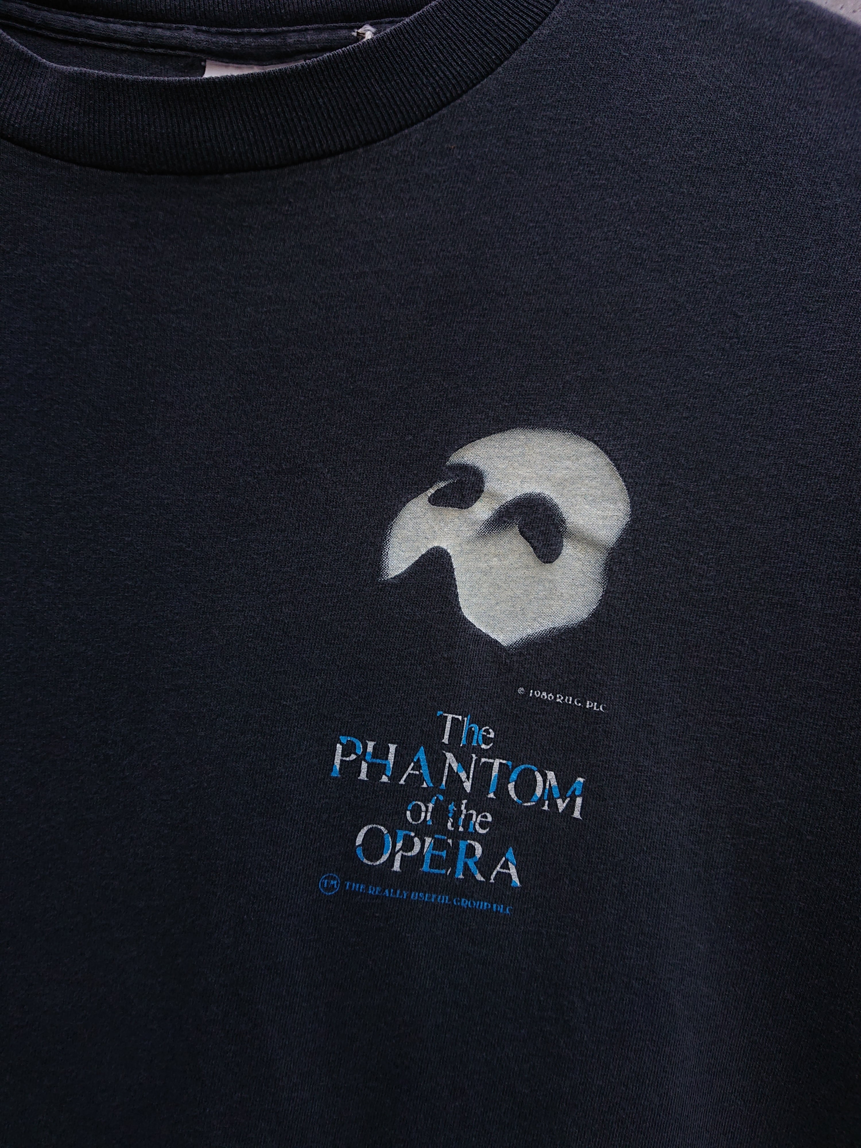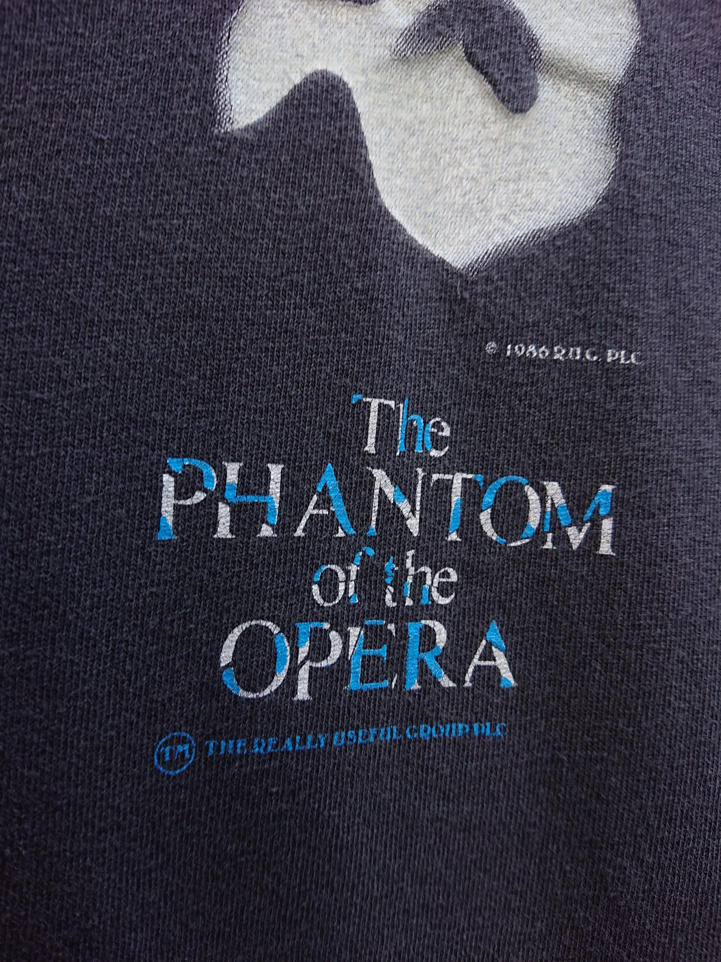 1980年代 ミュージカルや映画で有名な"The PHANTOM of the OPERA"オペラ座の怪人のTシャツになります。1986年にR.U.G. Plc(The Really Useful Group Plc)によって公式で作成されたTシャツ。左胸にプリントされたシンプルな一着。着用感ありますが全体的に色褪せしています。