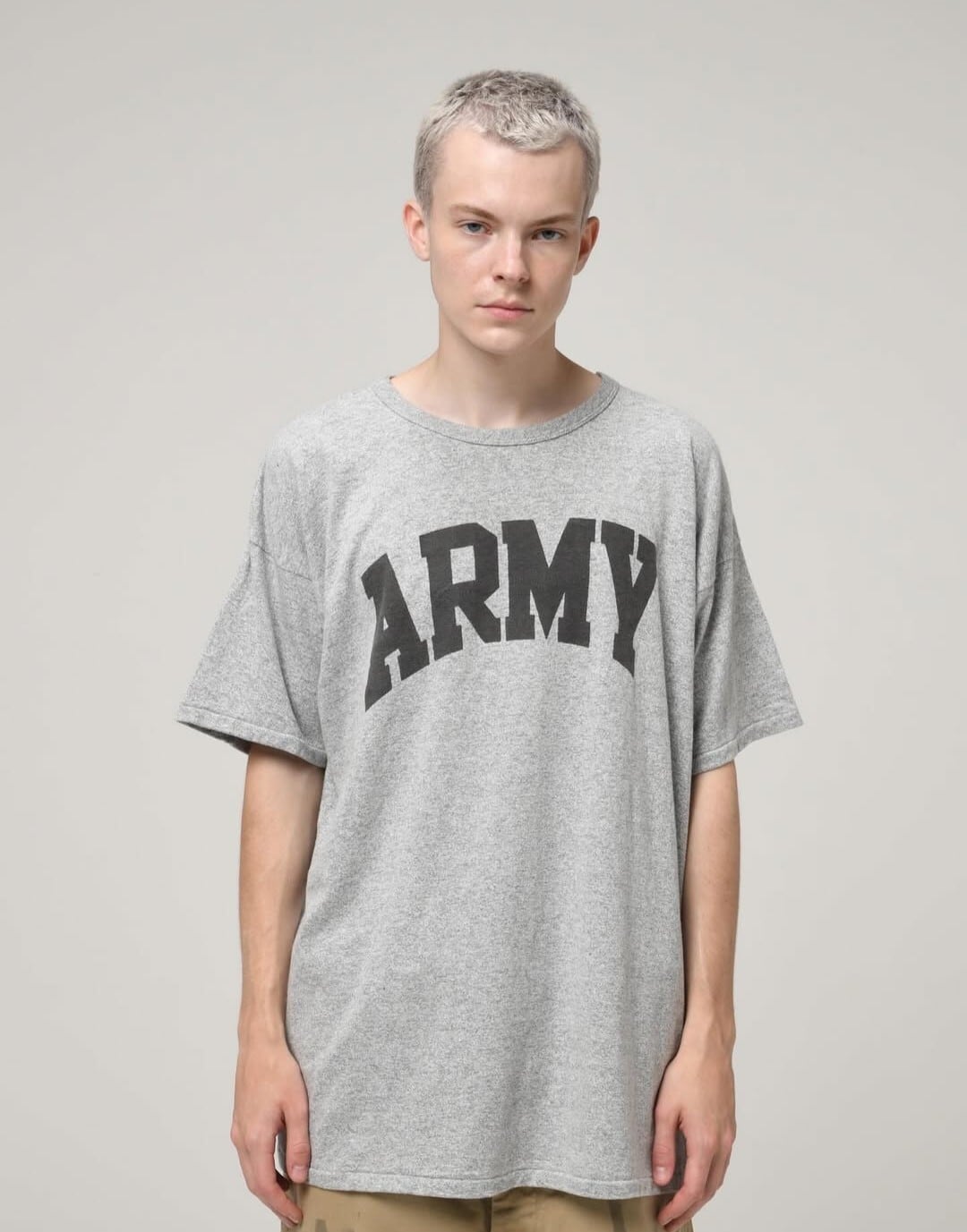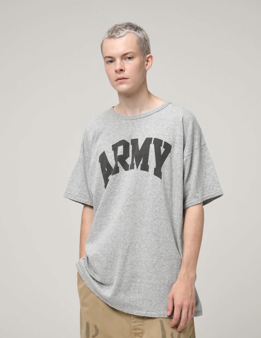 高く評価されているミリタリー由来のARMYプリントをメインに配した88/12のTシャツ。高価値なオリジナルアイテムによく見られるバランスの良さを反映しています。1980年代のレーヨン12%/コットン88%のTシャツからインスピレーションを得た筒状のボディを採用し、快適性、ドレープ性、軽さ、動きやすさを優先しています。珍しい60cmの筒状ボディと「完成形」のシルエットにより、生地、縫製、パターンは効率性よりも完成度を重視して作られており、プリントが自然に映えるようになっています。