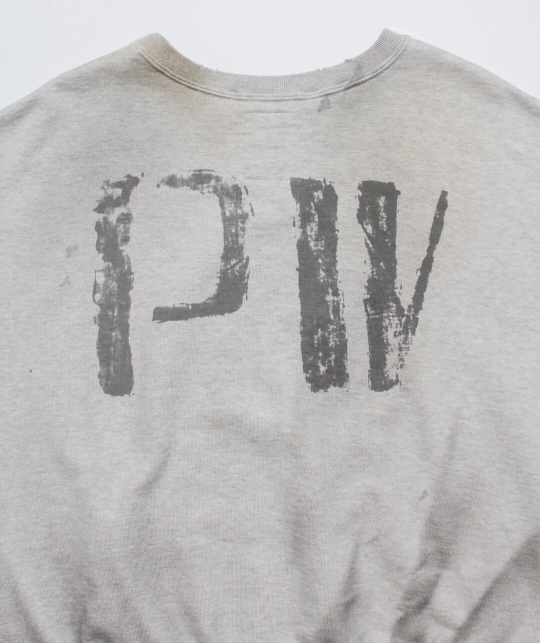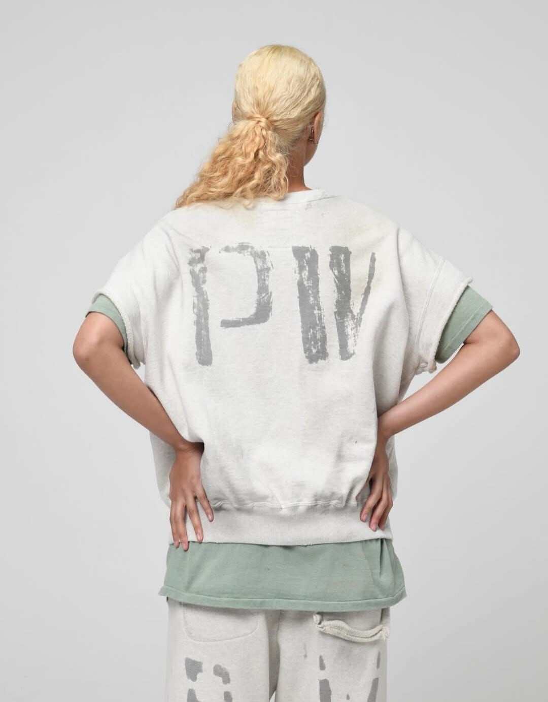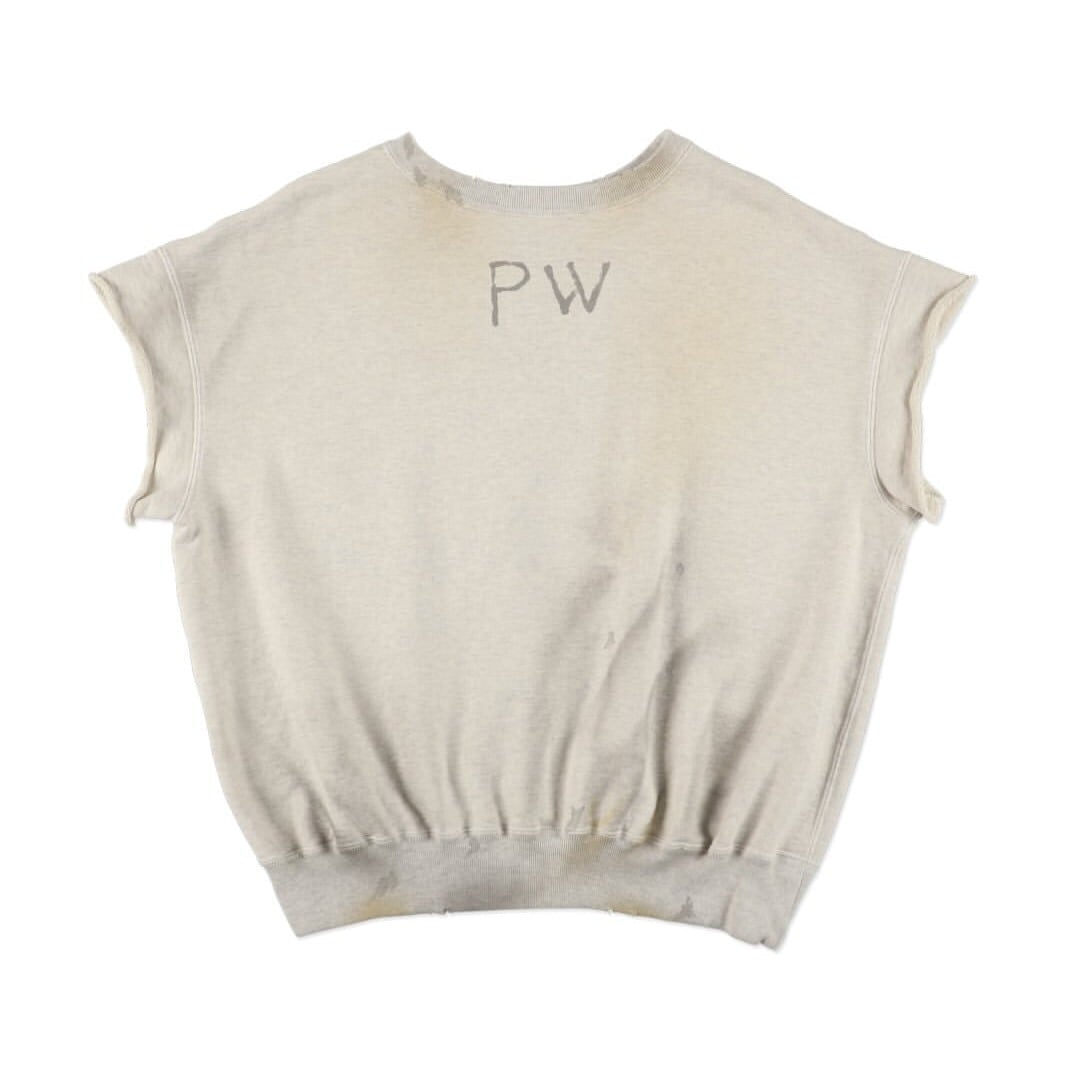 PWマークは、戦時中の識別マークが支給品に直接書き込まれるように配置されており、捕虜が着用していた衣服の雰囲気を彷彿とさせます。洗練されていない、無機質な存在感を保つことで、緊張感と閉塞感を醸し出しています。1950年代から60年代にかけて流行した、袖を切り落としたスウェットシャツのスタイルを参考に、着古したようなリアルな雰囲気を演出しています。裾のリブはしっかりとした作りで、ヴィンテージ仕様の厚手のフレンチテリー素材を使用することで、ミニマルな構造の中に重厚感と存在感を加えています。