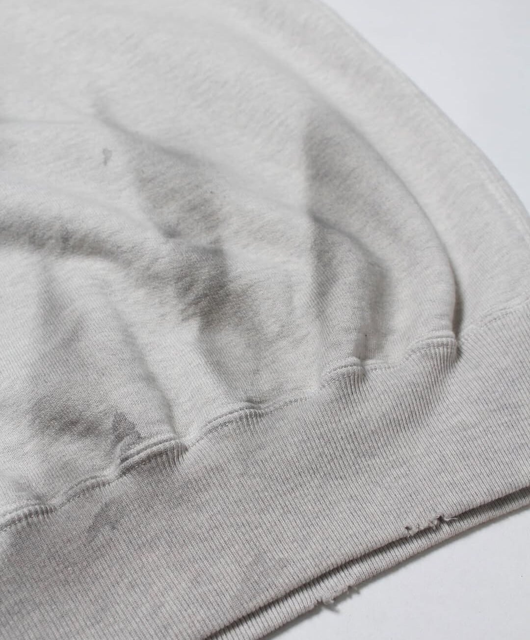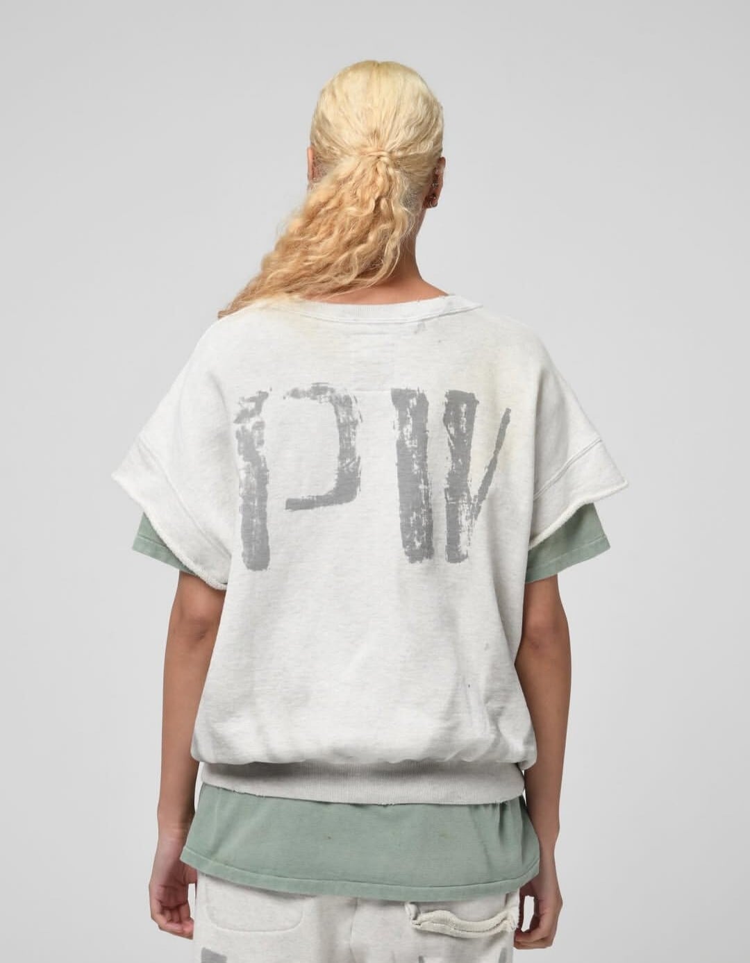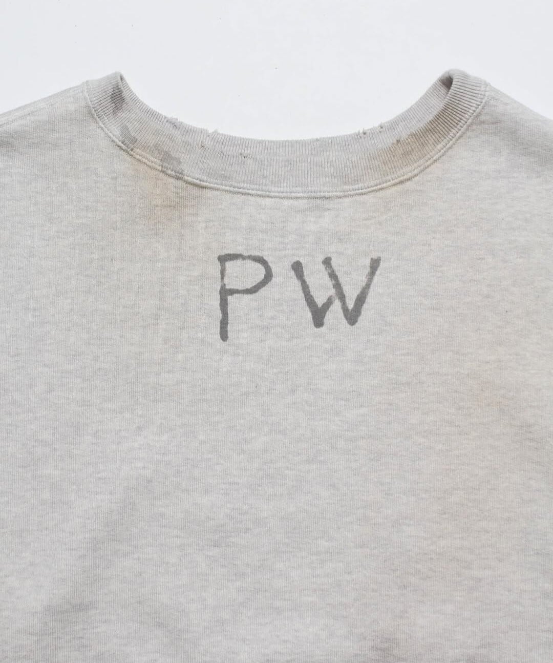 PWマークは、戦時中の識別マークが支給品に直接書き込まれるように配置されており、捕虜が着用していた衣服の雰囲気を彷彿とさせます。洗練されていない、無機質な存在感を保つことで、緊張感と閉塞感を醸し出しています。1950年代から60年代にかけて流行した、袖を切り落としたスウェットシャツのスタイルを参考に、着古したようなリアルな雰囲気を演出しています。裾のリブはしっかりとした作りで、ヴィンテージ仕様の厚手のフレンチテリー素材を使用することで、ミニマルな構造の中に重厚感と存在感を加えています。