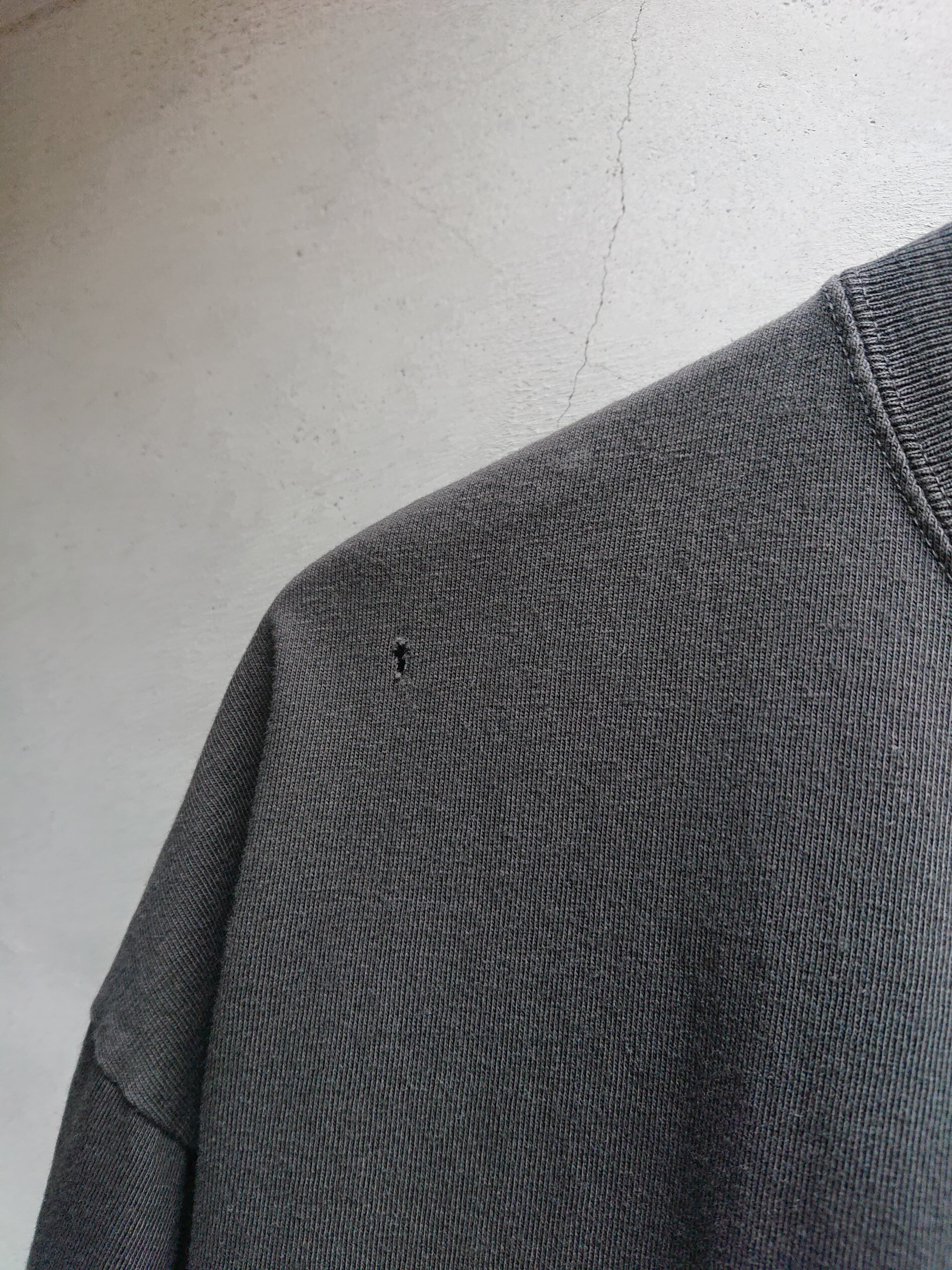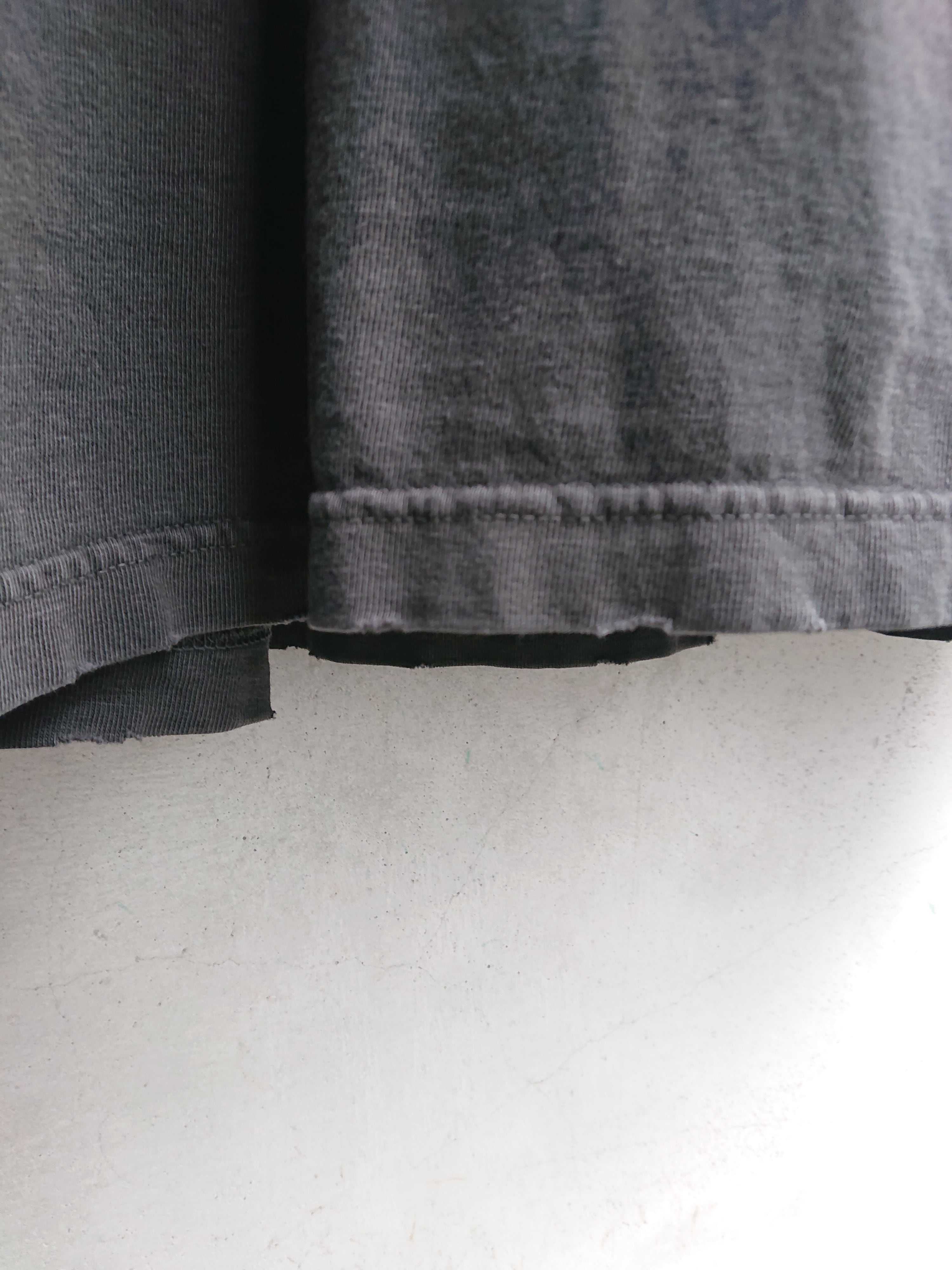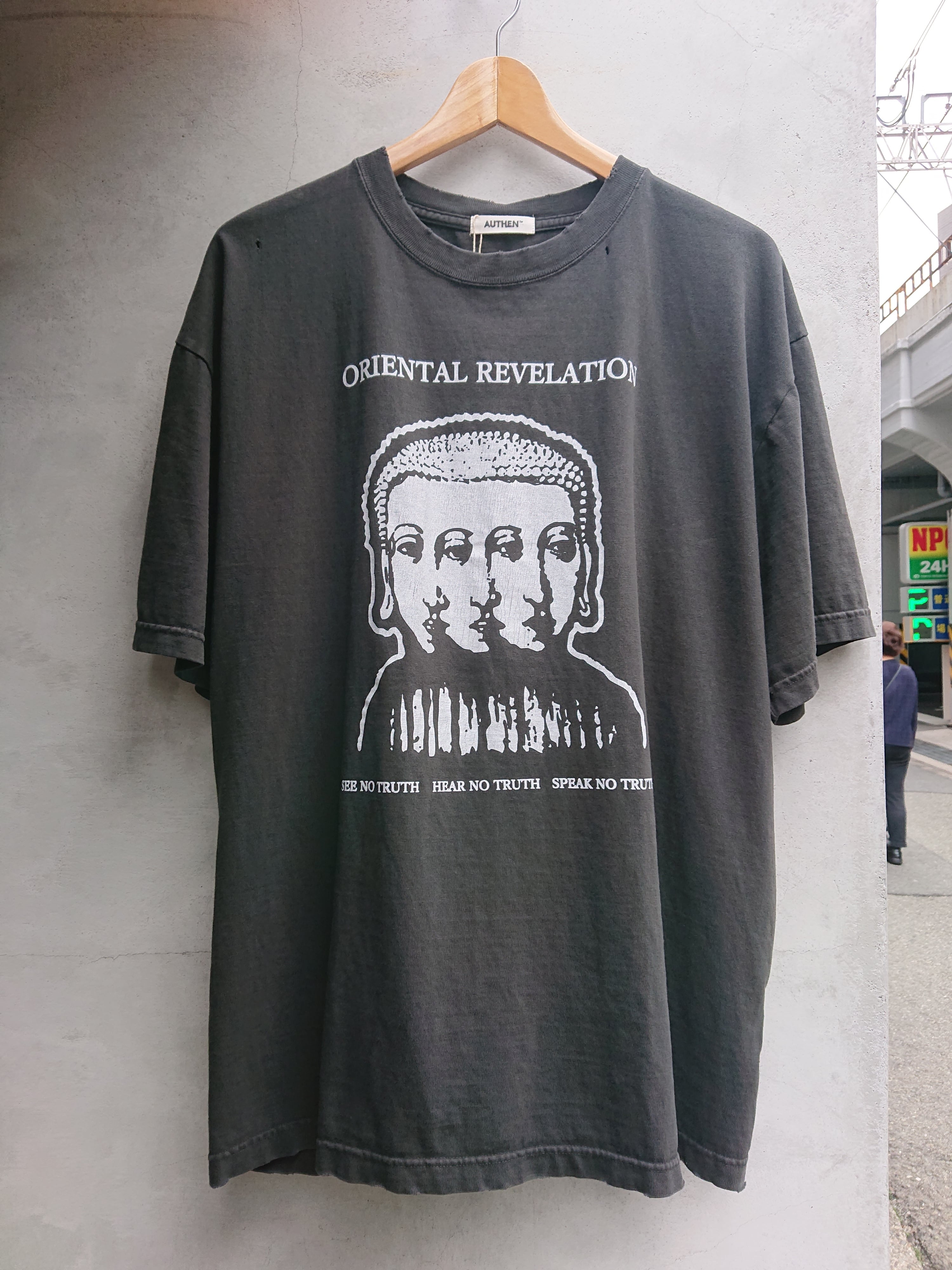 古着のバンドTシャツをモチーフとし、架空のバンドTデザインをプリント。東洋、アジアのモチーフとのミクスチャーがデザインのポイントに。その後製品染めとダメージ加工でリアルな剥がれ感もプラス。
