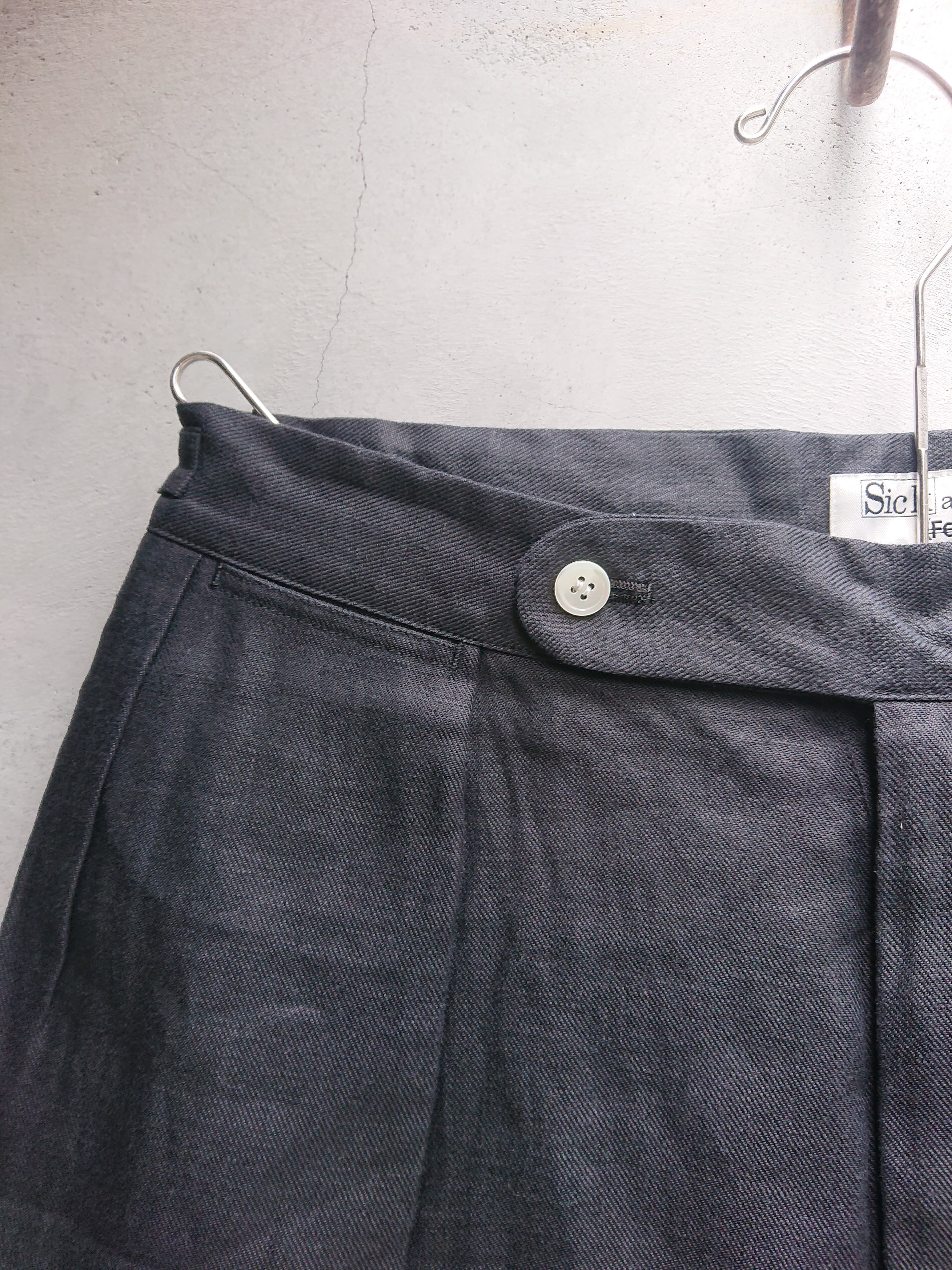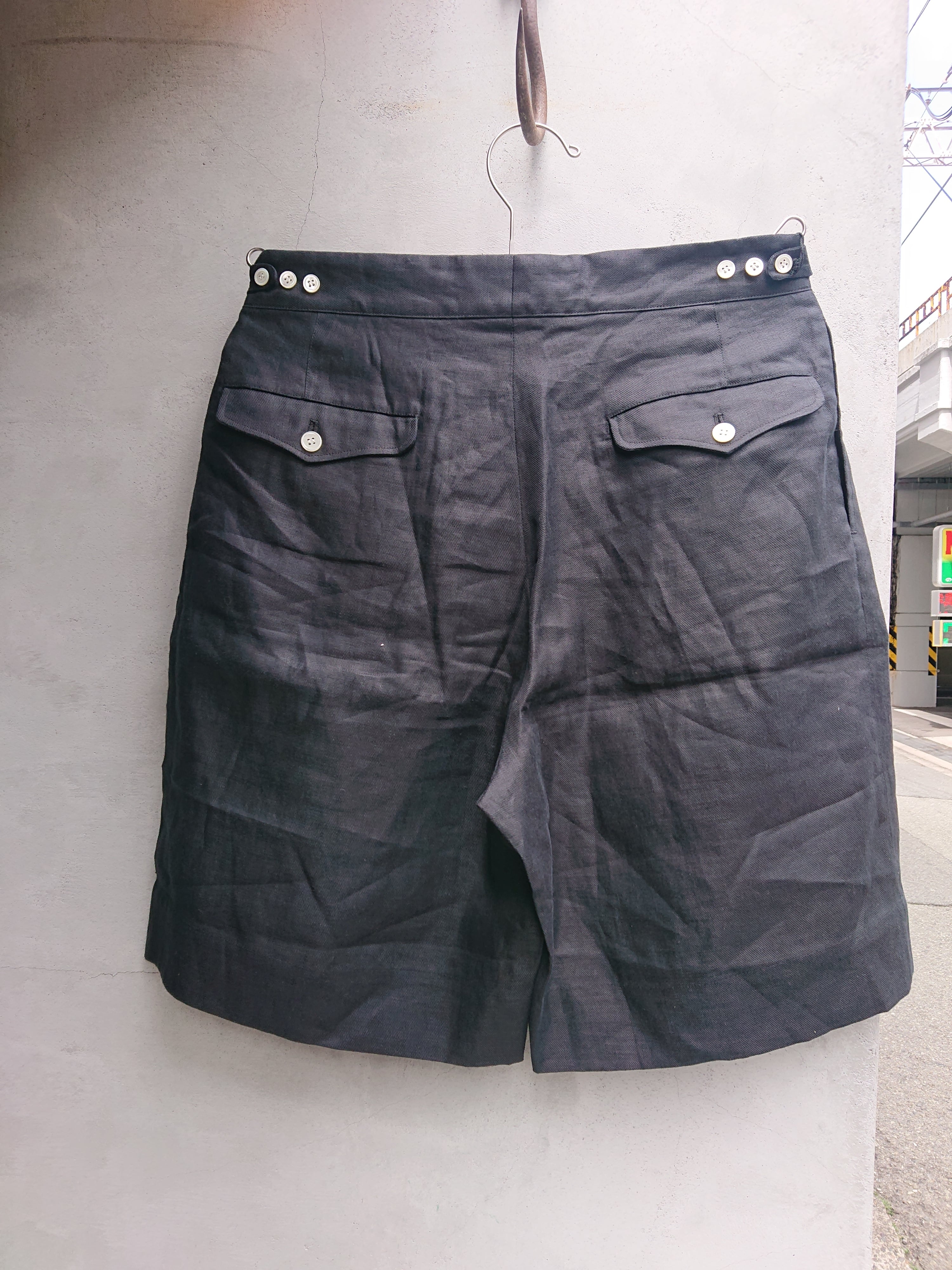 夏っぽい肉感のあるリネン素材を使用しています。ボタンは天然の貝ボタン(白)を使用する事で夏っぽさと見た目にも高級感が出ます。ウエストはサイドのタブで3個のボタンによって3段階の調整が出来る仕様に。