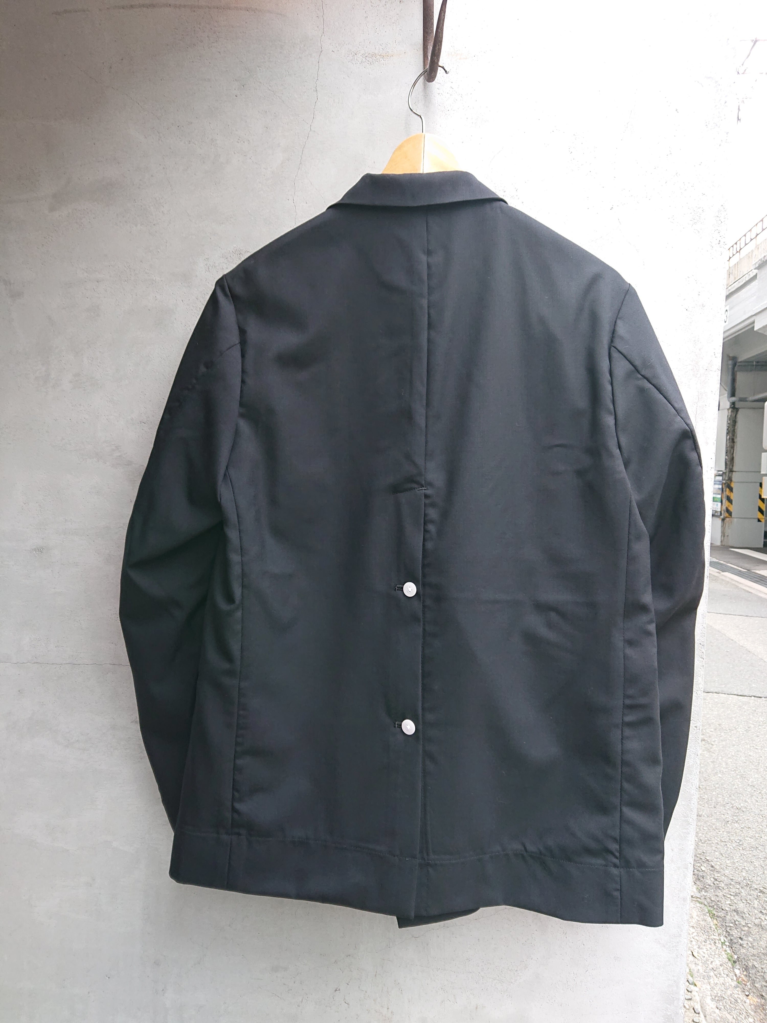 ボタンを外す事で着て頂いた際にゆとりと動きが出来、後ろから見たデザインにユーモアを感じていただけます。ジャケット自体の仕立ては簡易的なコットン生地の前後の裏地が付くのみで縫い代始末は全てパイピングにて美しく処理。