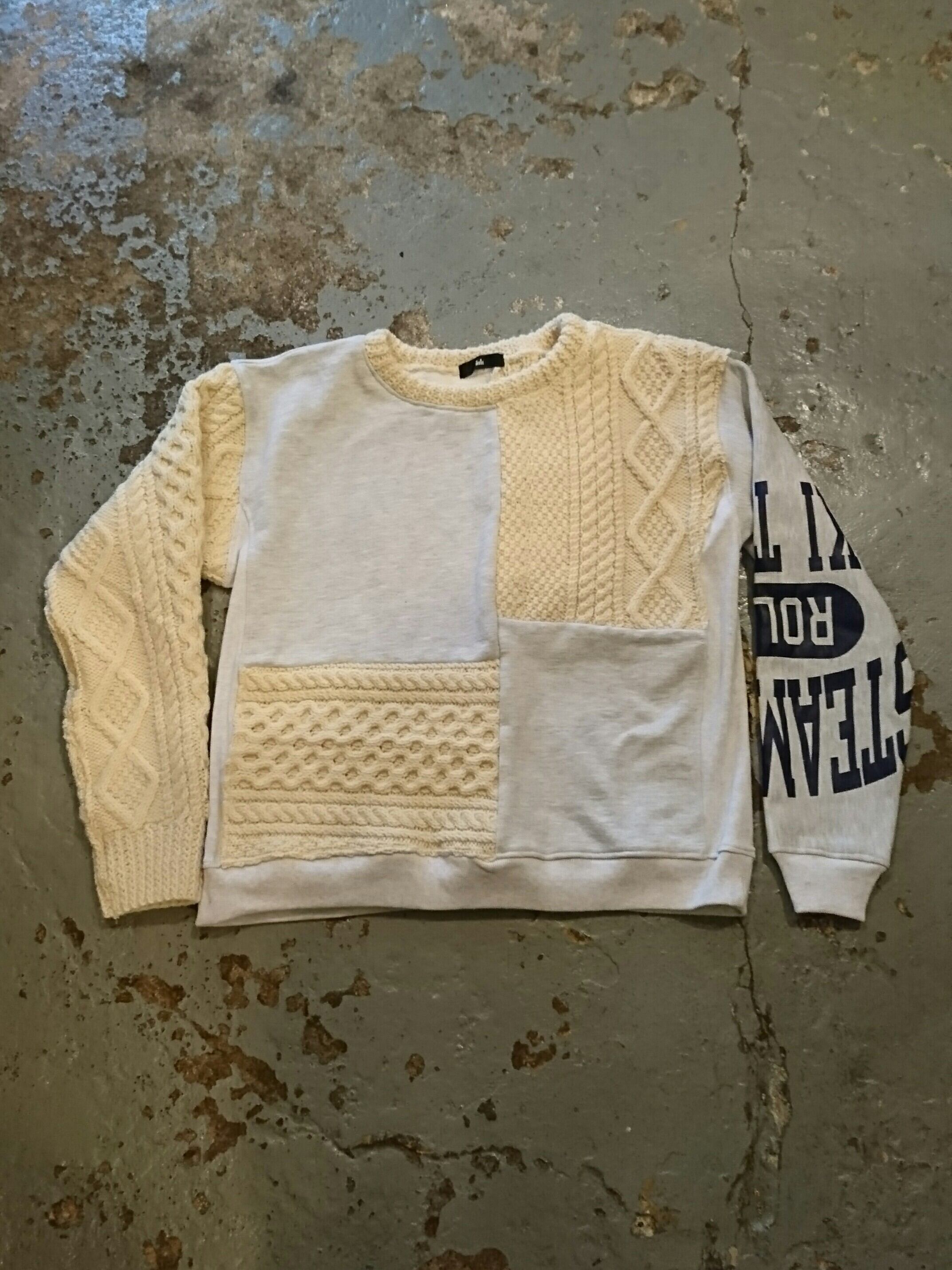 UsedのREVERSE WEAVEとフィッシャーマンニットを使用しかけあわせたinkオリジナルリバースウィーブ。左袖に入るプリントがアクセントになっております。少しゆったりしたシルエットも今の気分にピッタリです。