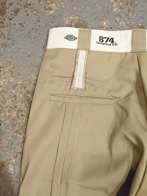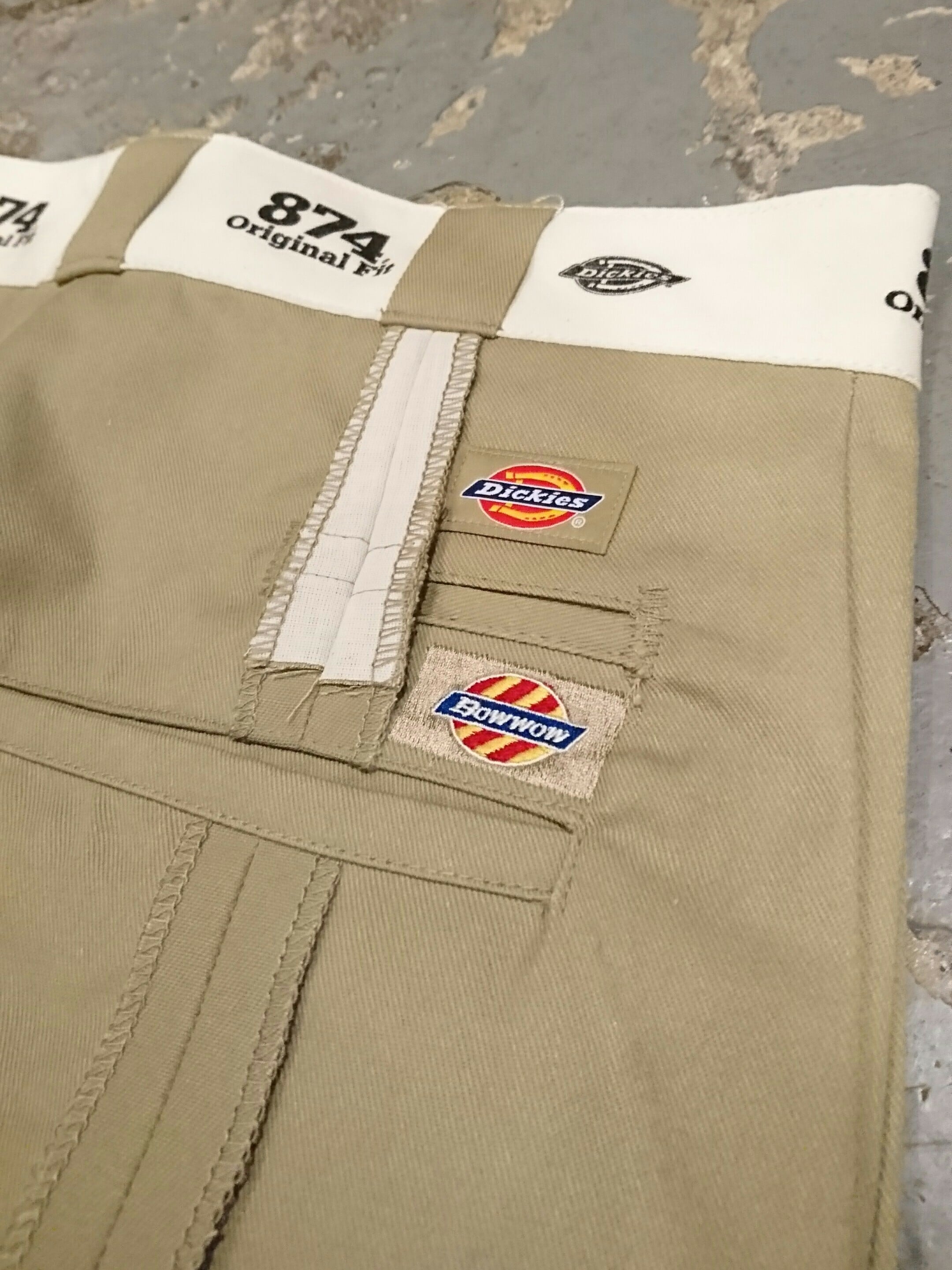 ビッグサイズのディッキーズのワークパンツを使い、縫い上げたリメイクトラウザー。裏返したようなデザイン。シンプルでありながら、複雑な仕様なのも目を惹きます。