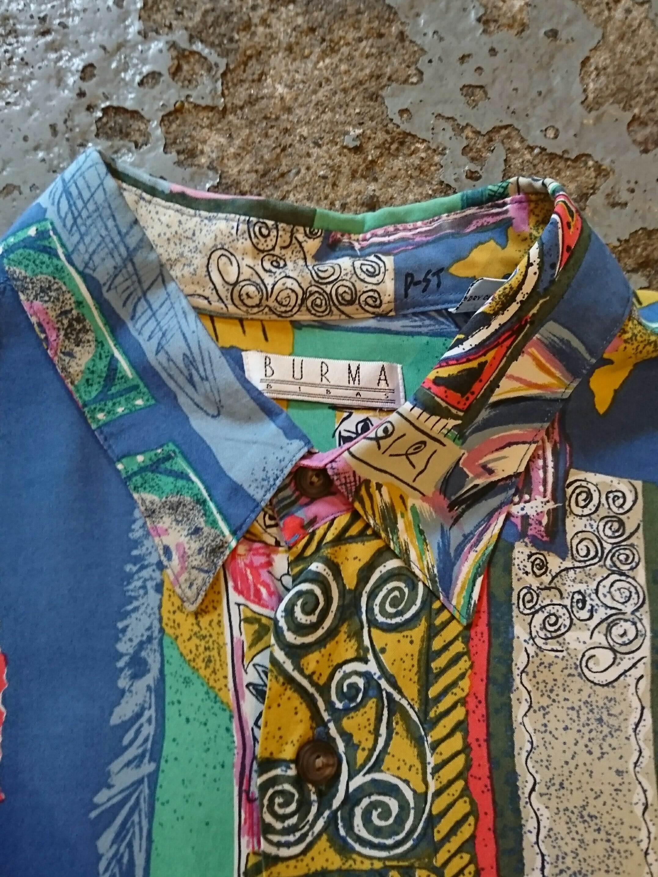90年代 デザイン プリントの半袖シャツになります。配色、柄共に良い1着。素材はレーヨン。