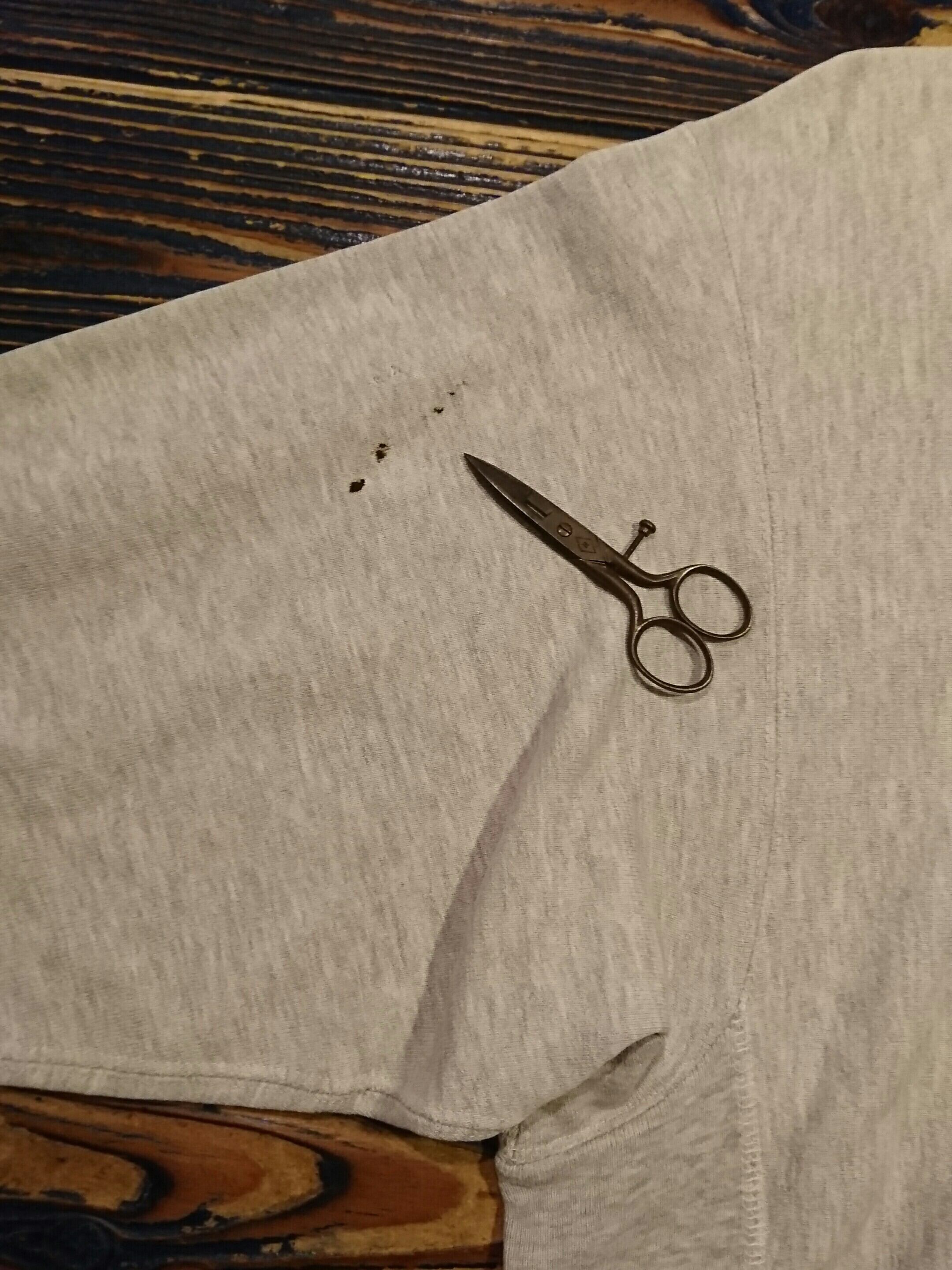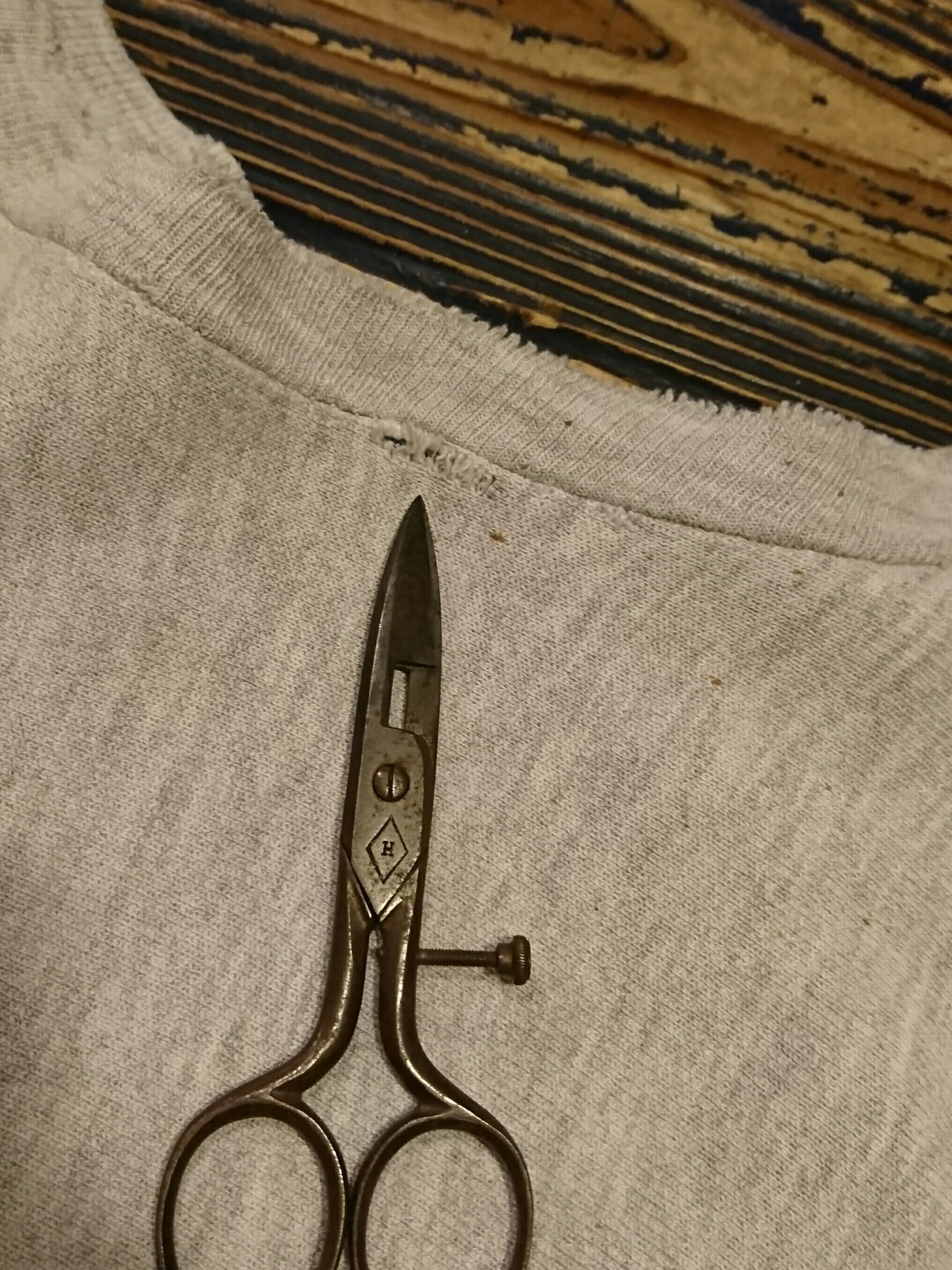 CONDITION : 着用感あり。ネックリブ、背中、右腕等所々にキズ、汚れあり(写真参照)。