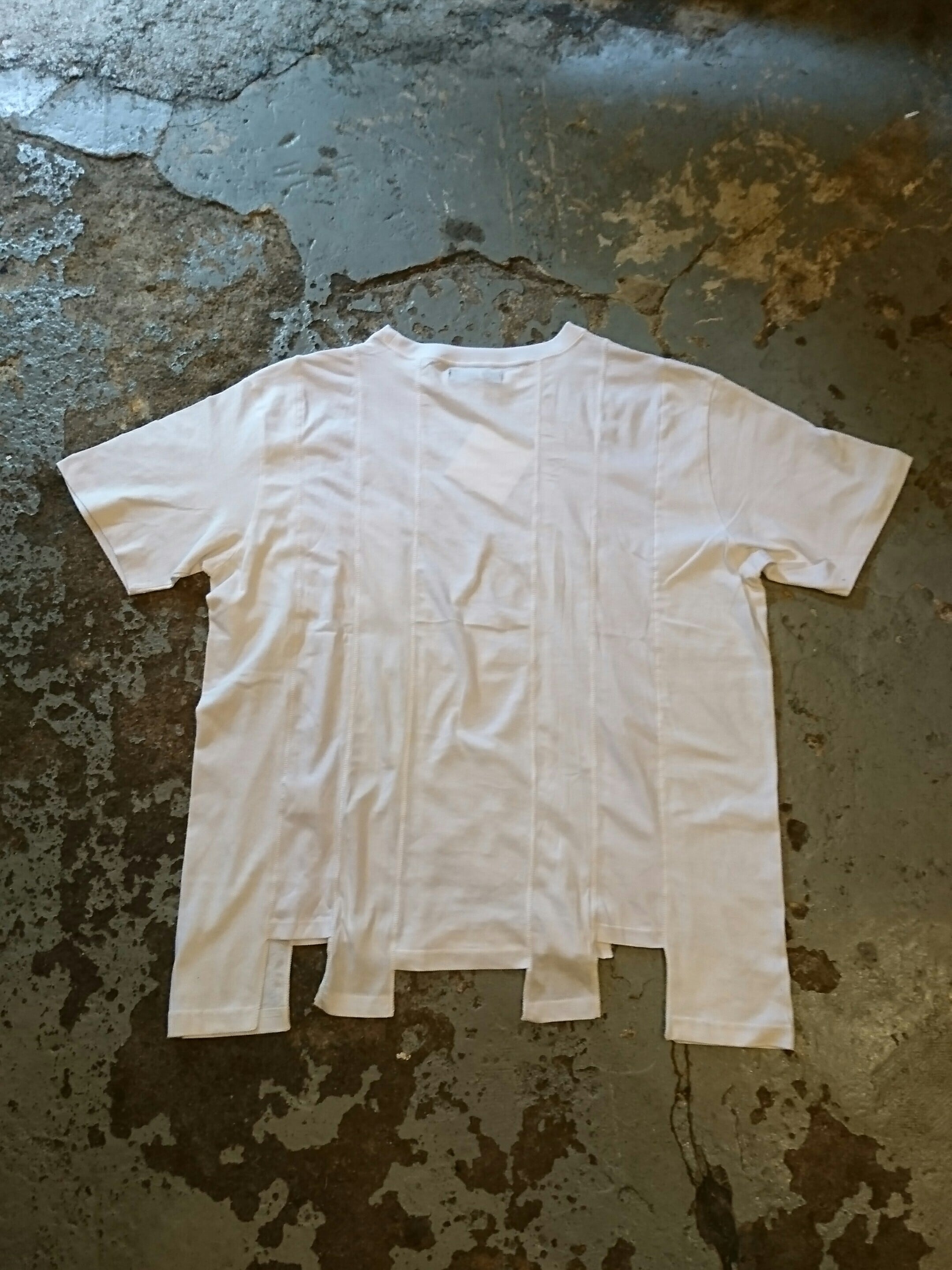 もたせたTシャツです。アシンメトリーなデザインも目を惹きます。