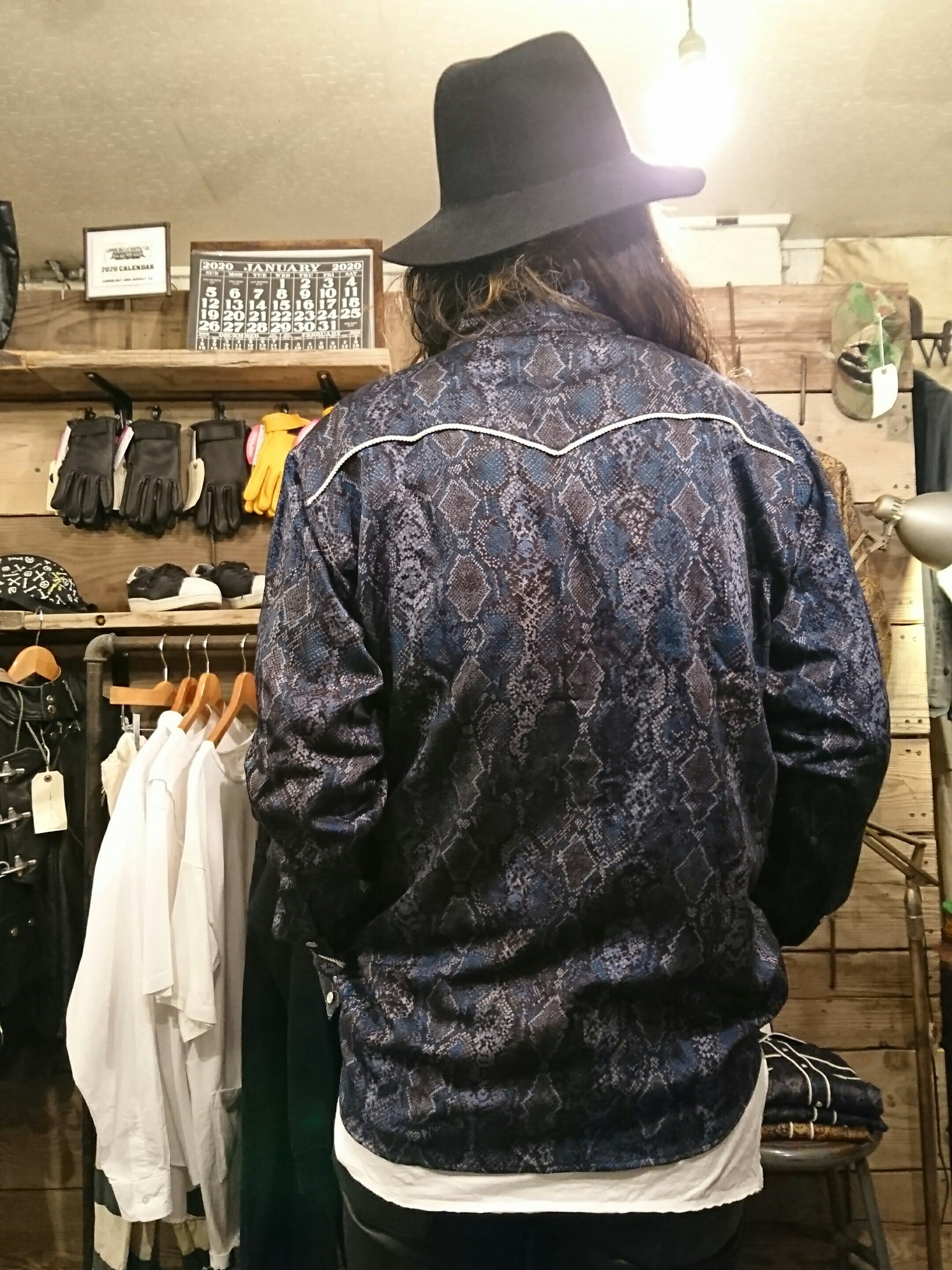 50年代のウエスタンシャツをサンプルにインパクトある蛇柄とラメ糸を合わせたウエスタンシャツになります。生地はエアータンブラー加工を施したウェイトの軽い薄手のコットン。加工により