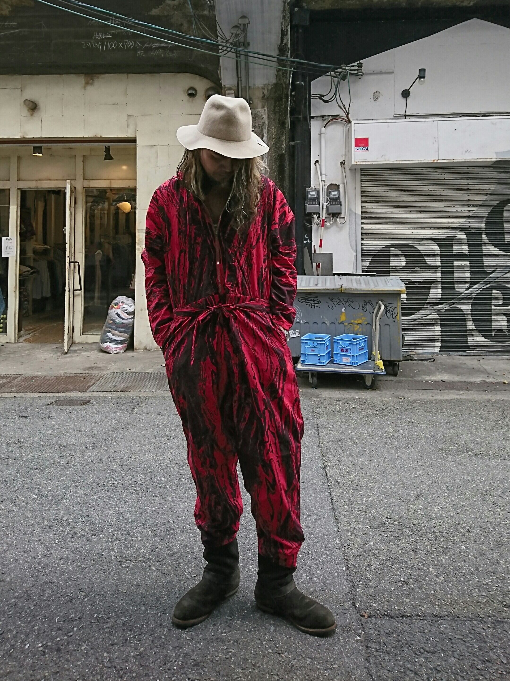 マーブル模様をプリントしたシャツ生地を使用したオールインワンをリリース。デザイナーが常に 愛するオールインワンをブランド設立後、初のリリース。ウエスト部分はゴム、共生地のベルトも