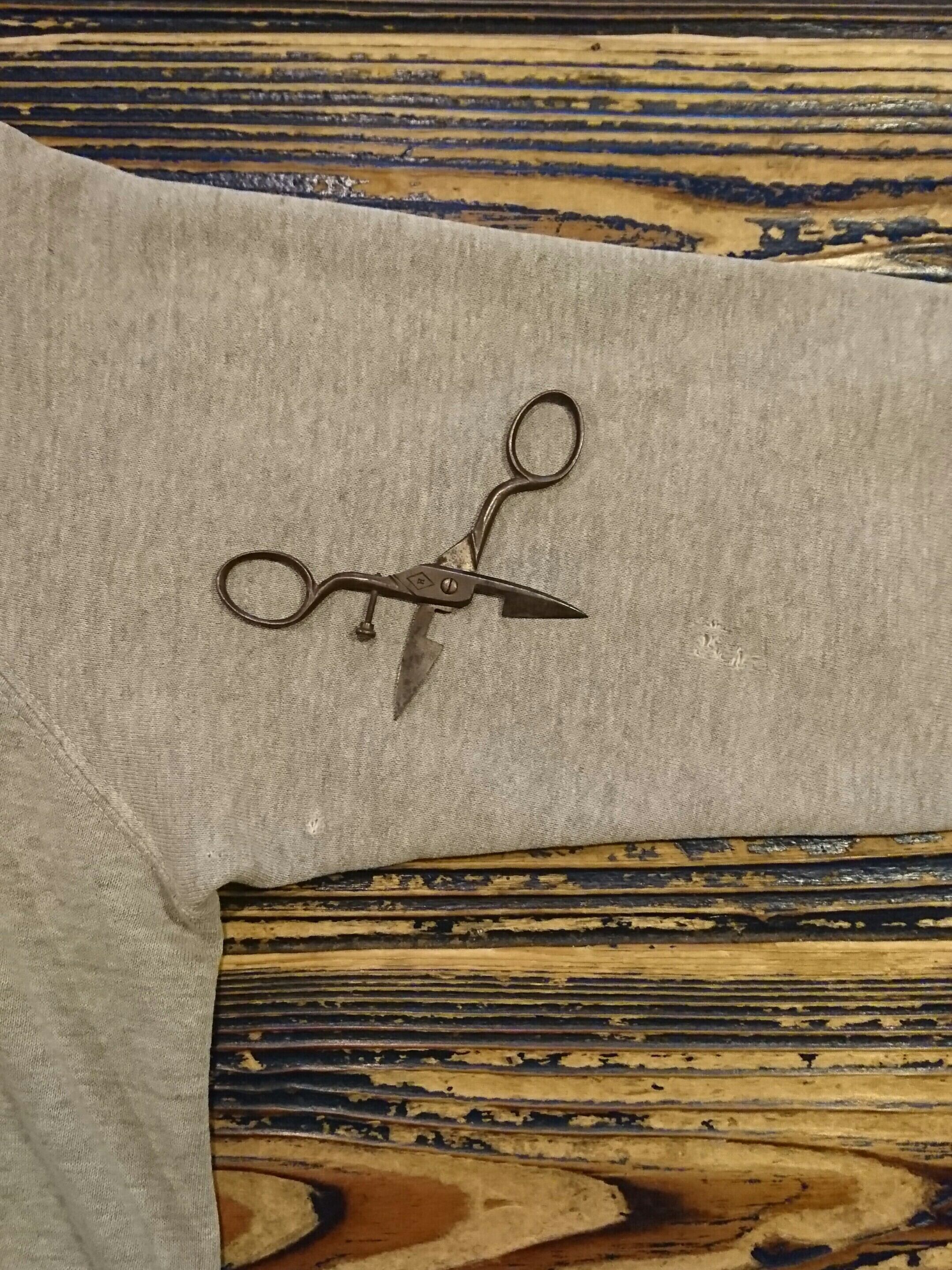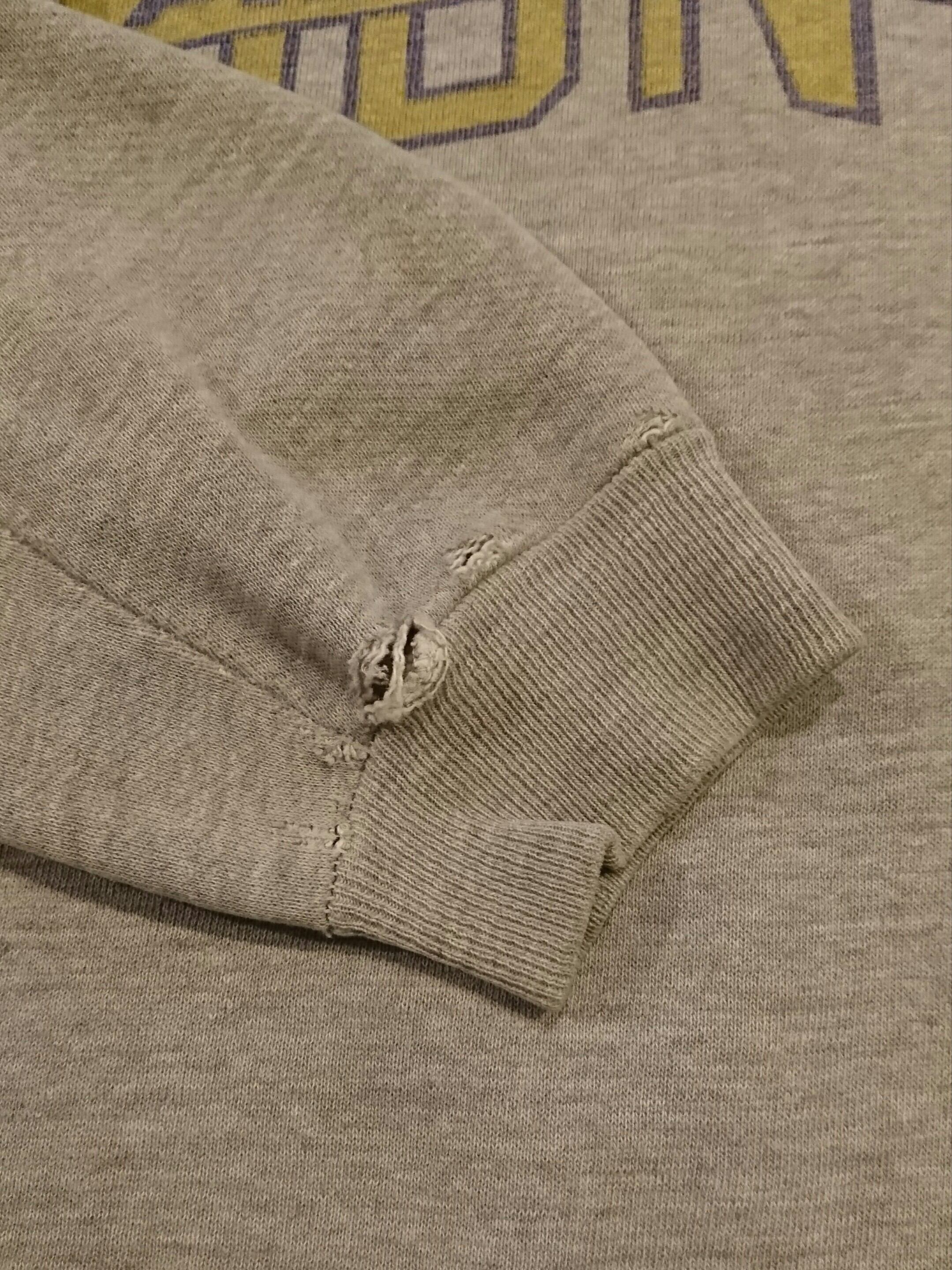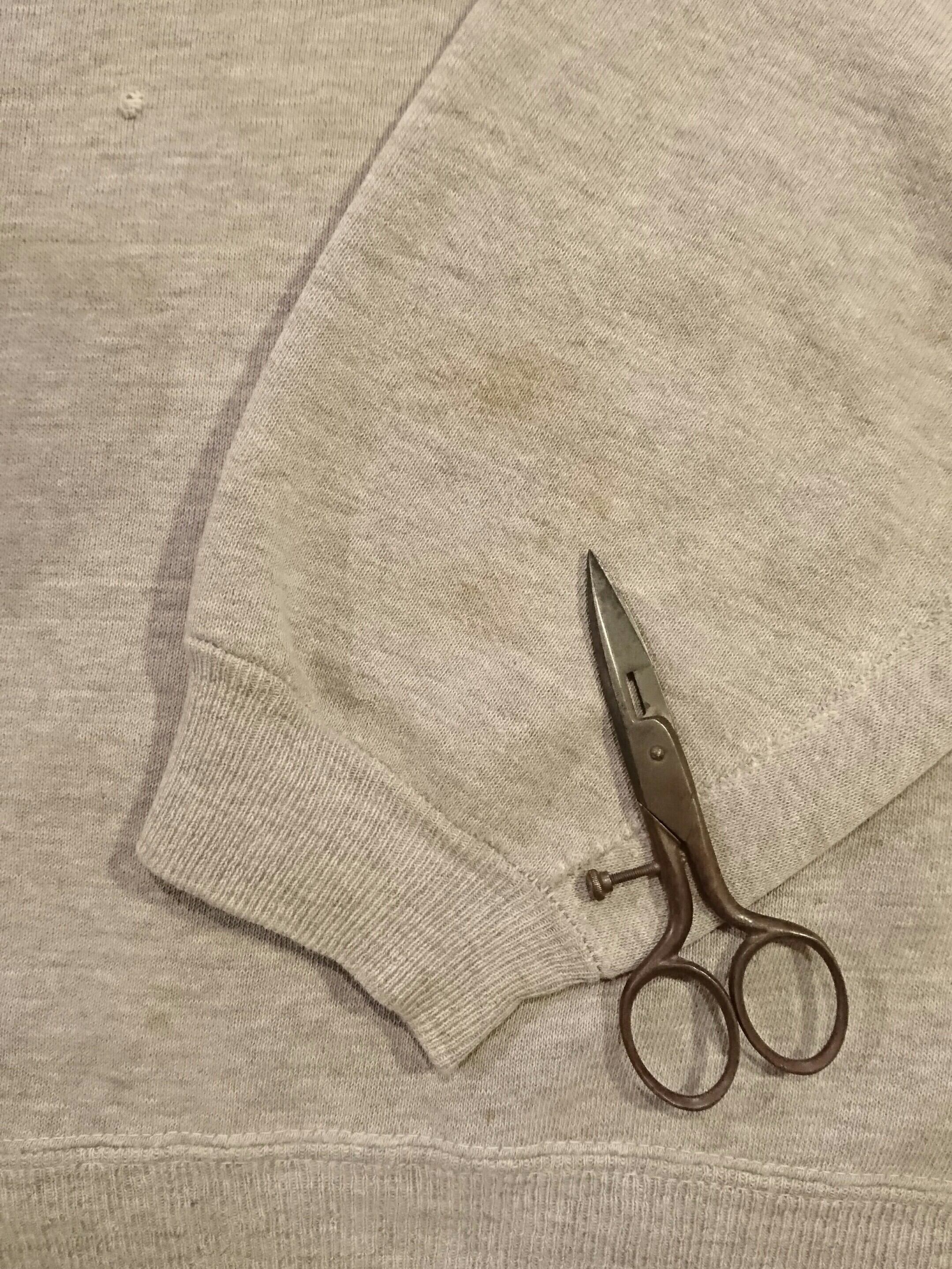 カレッジスウェット。フロントの染み込みプリントがどことなくUS NAVYのプリント物に似てる感じがしませんか?調べたところUS NAVYには全く関係なかったです。でもそんな風にも一見感じほど格好良いんです。所々小さな傷(写真参照)がありますがそこも男前な雰囲気。サイズが合う方いかがでしょうか。