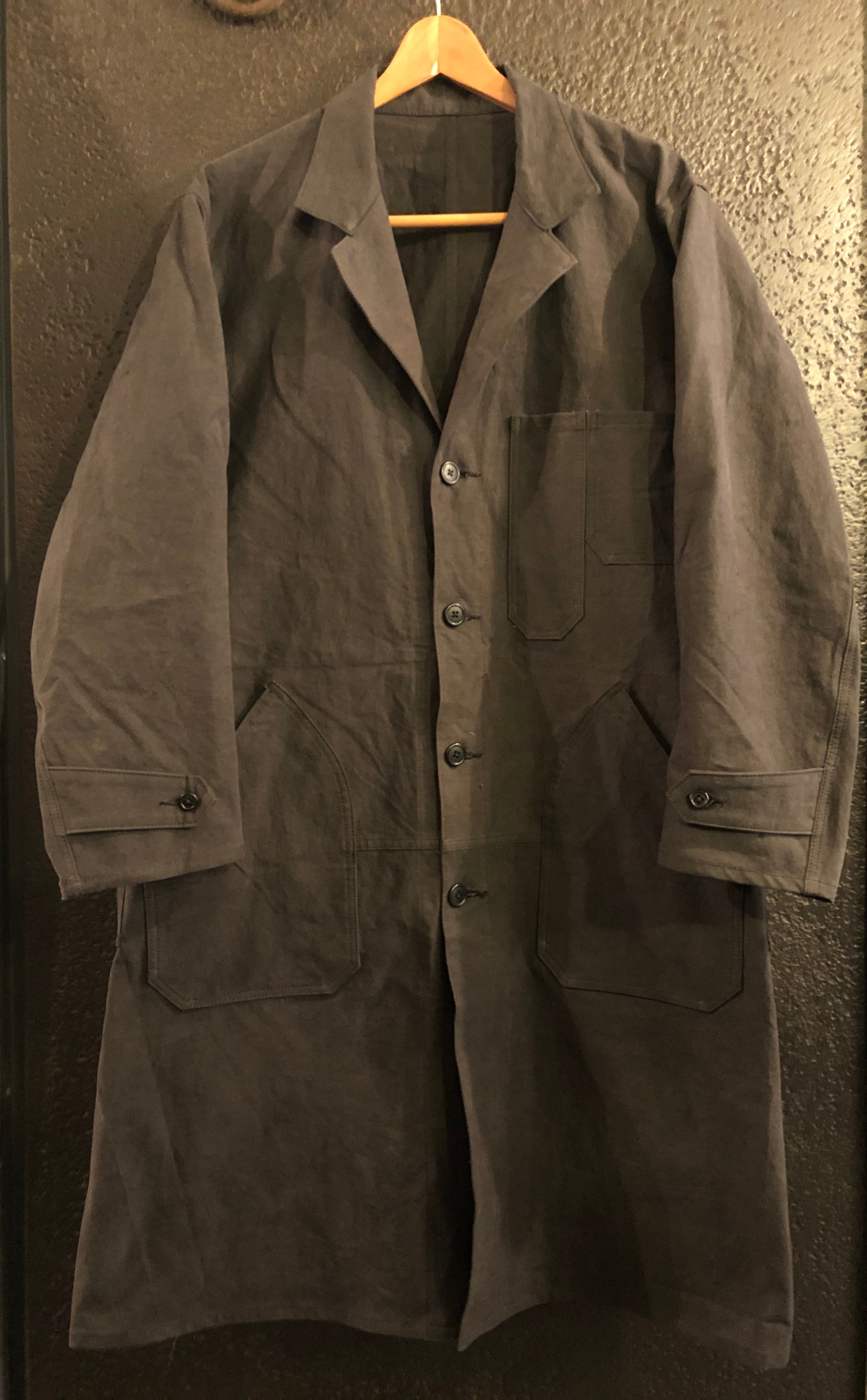 FRENCH VINTAGEの代表的なワークコートのマキニョンコート。馬商(馬や家畜の仲買人)がハサミを入れる為の縦長のポケットが最大の特徴で、胸ポケットに並び配置されたその様はまさにガチャポケと言う表現がぴったり。ヴィンテージフリークが躍起になって探す理由が解ります。BAAにより1930年代のマキニョンコートの実物をサンプリングし1940年代の高密度で織られたテント生地を使用して忠実に蘇らせたこちらは、ハンドポケットや襟裏の補強なども完全に再現。旧いテント生地を使用しておりますのでリペア跡や、傷、ピンホールなどもございますが、強度には全く問題ございません。