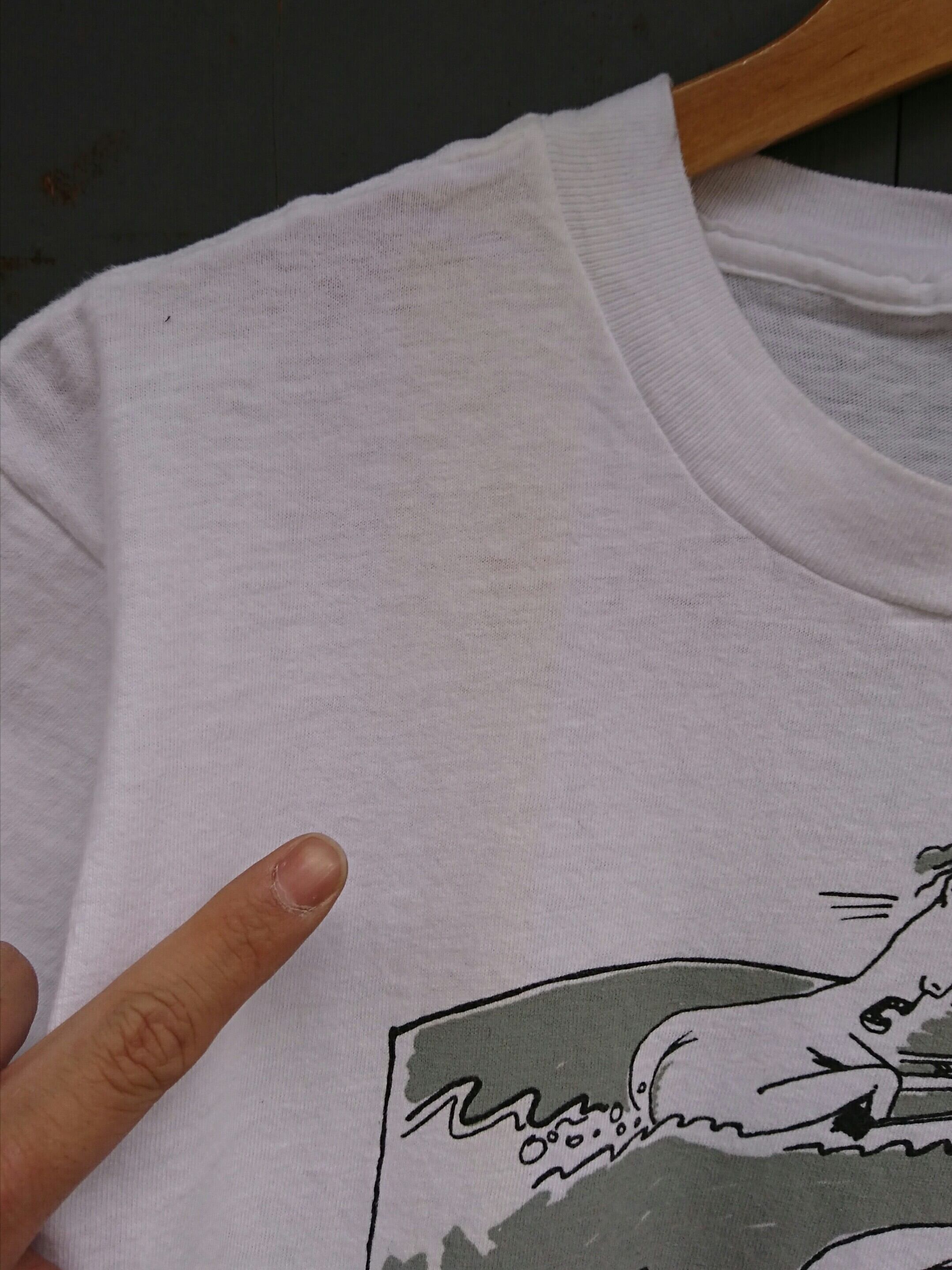ボートのエンジンを裸の人がオナラで動かし競争してるかのようなプリントデザイン。洒落てますよね(笑)。デッドストックですが汚れがあった為洗いかけてます。若干やけ染み(写真参照)がありますが着用に問題はありません。