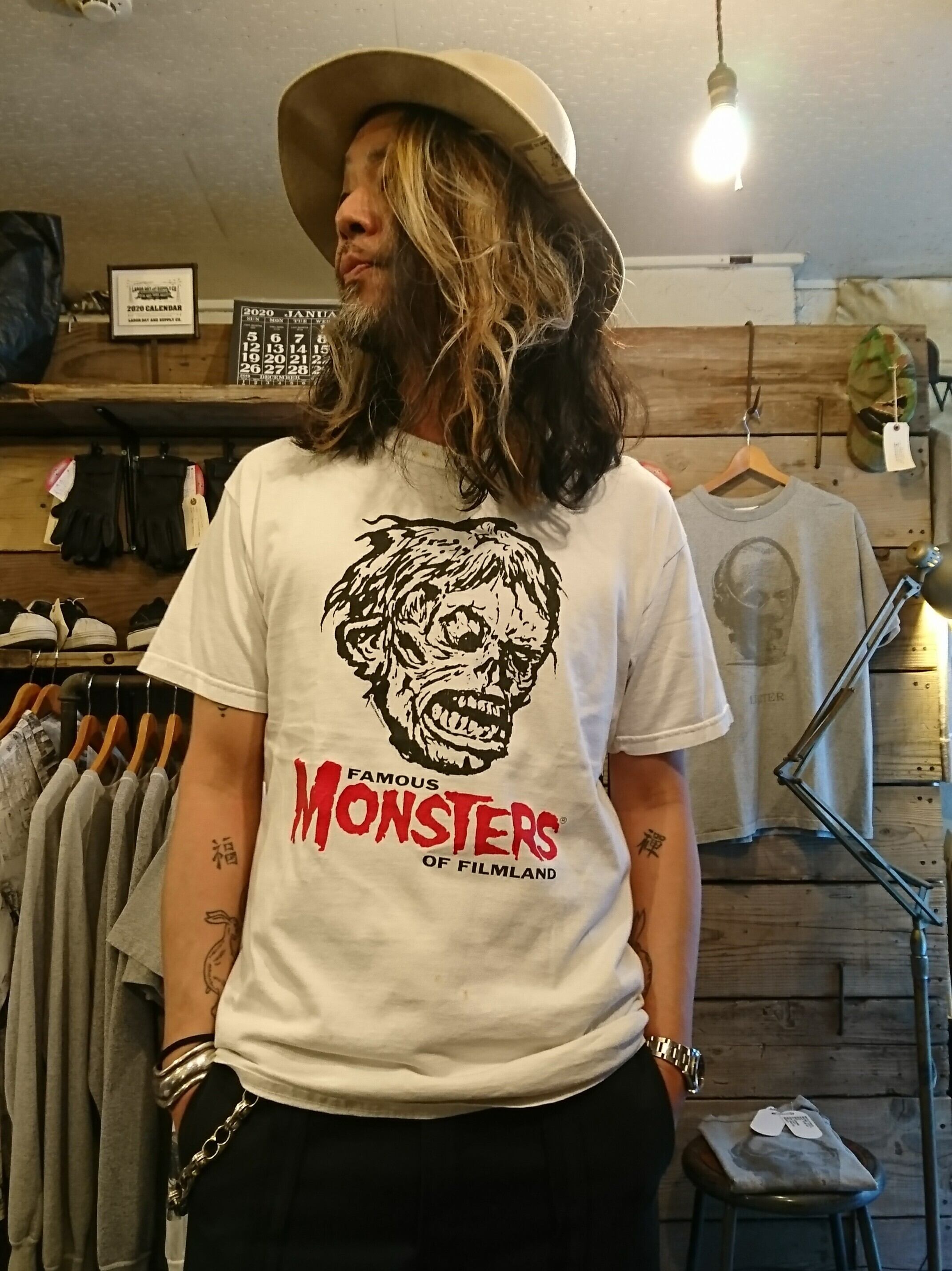 Filmland of Famous Monsterは、1958年に出版社のJames Warrenと編集者のForrest J Ackermanによって開始されたアメリカのホラー映画専門雑誌で、そのプリントTシャツになります。数ヶ所錆び汚れ(写真参照)みたいなのがありますが、このプリントにあってるのか良い雰囲気になってます。お好きな方いかがでしょうか。
