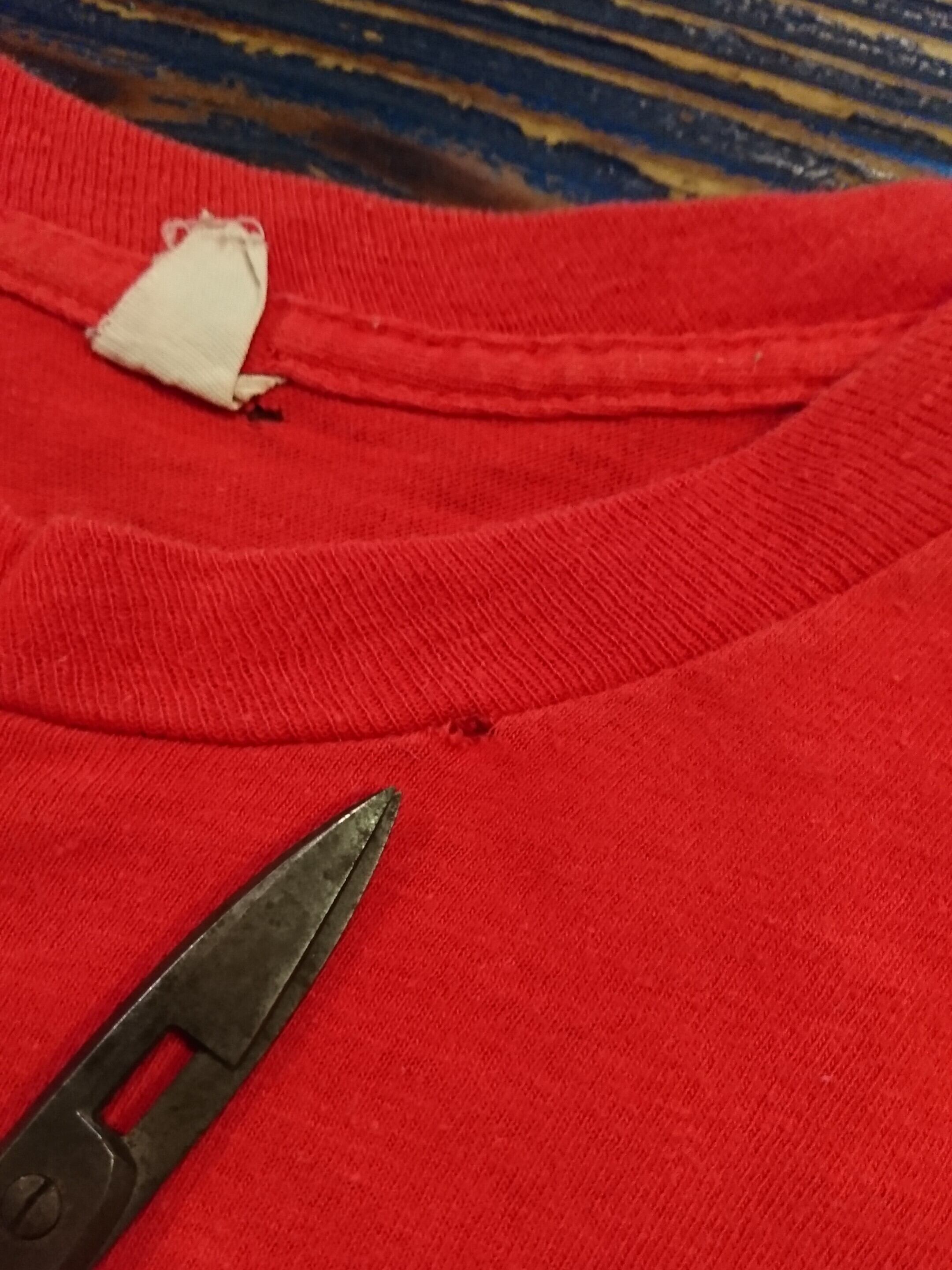 ボトムも選らばないので意外と色んなスタイルに使える赤のTシャツ。多少の色褪せ、小さな傷