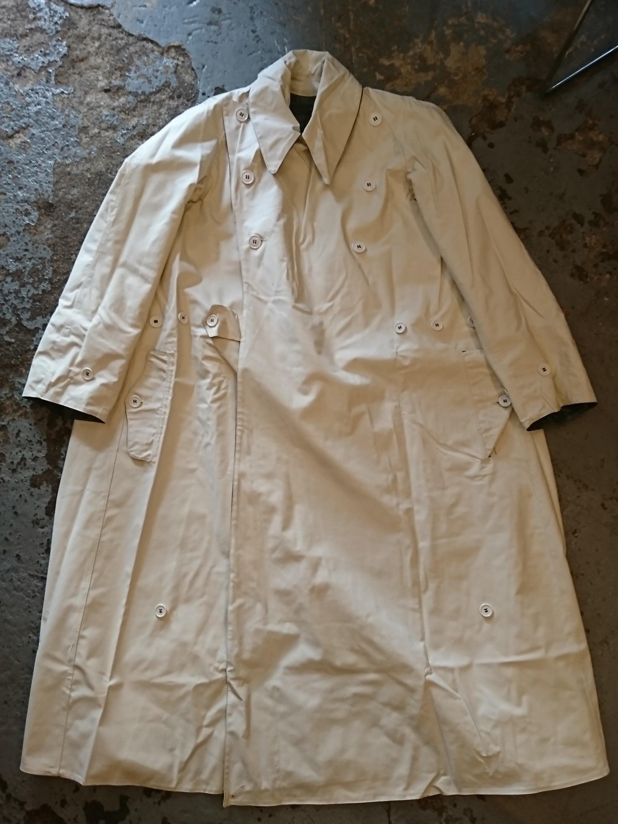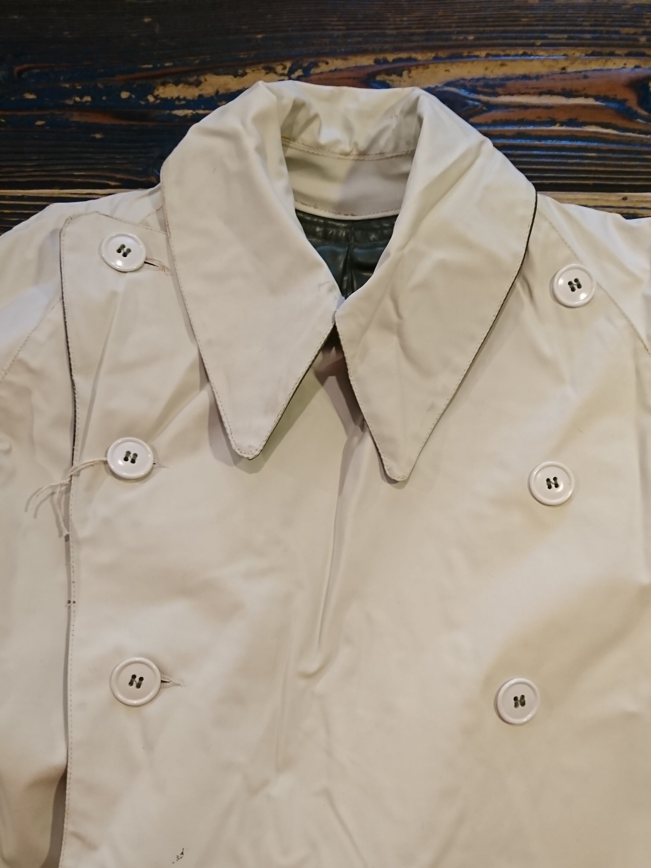 60年代 フランス軍リバーシブル仕様のラバーコートのデッドストックになります。ズッシリと重い厚手のラバーコートでホワイトとオリーブのリバーシブル仕様となっております。 ポケットは貫通ポケットにワキ下は通気性良くする為、ベンチレーション仕様。どこかモードな匂いすら感じれる