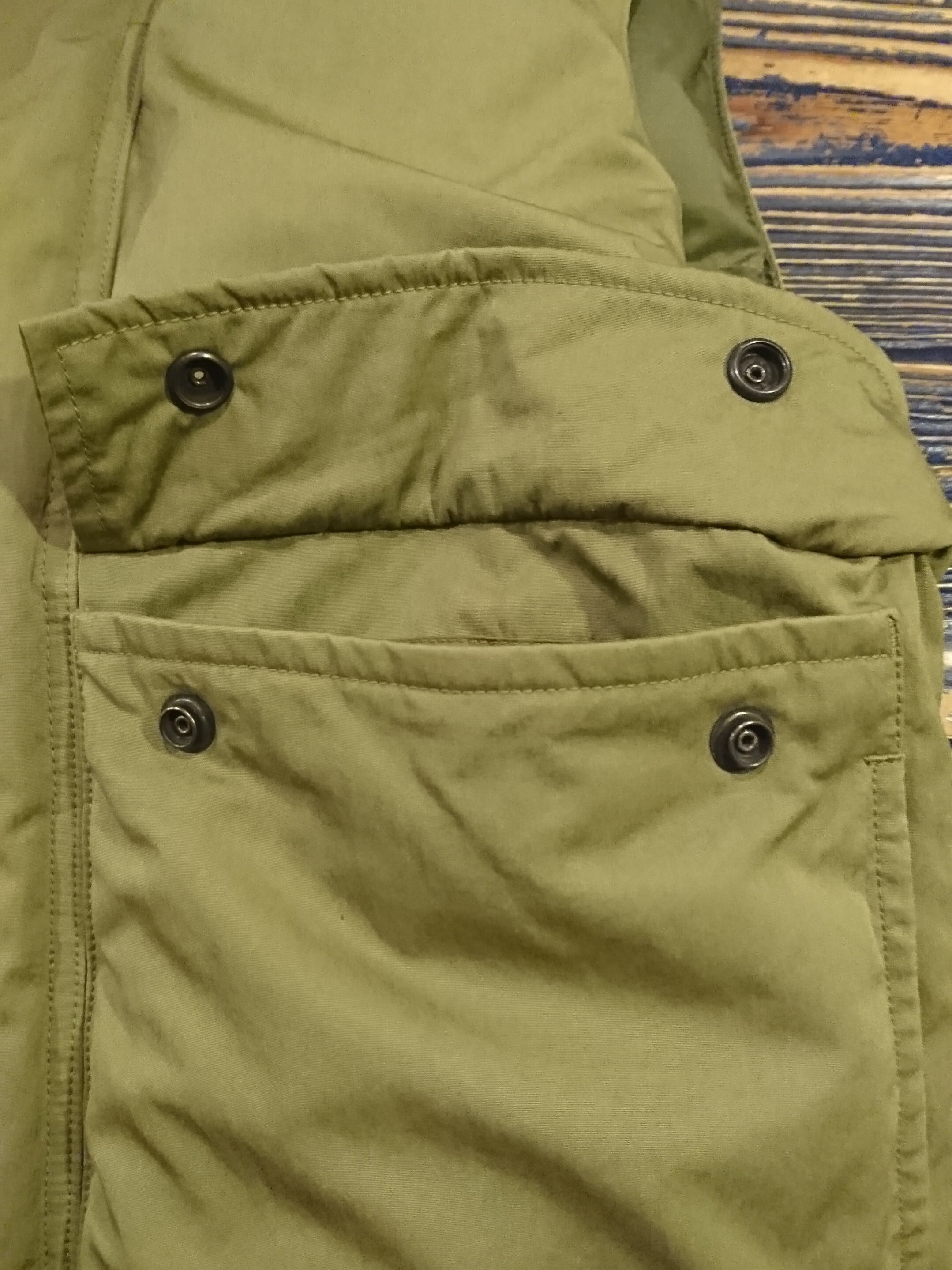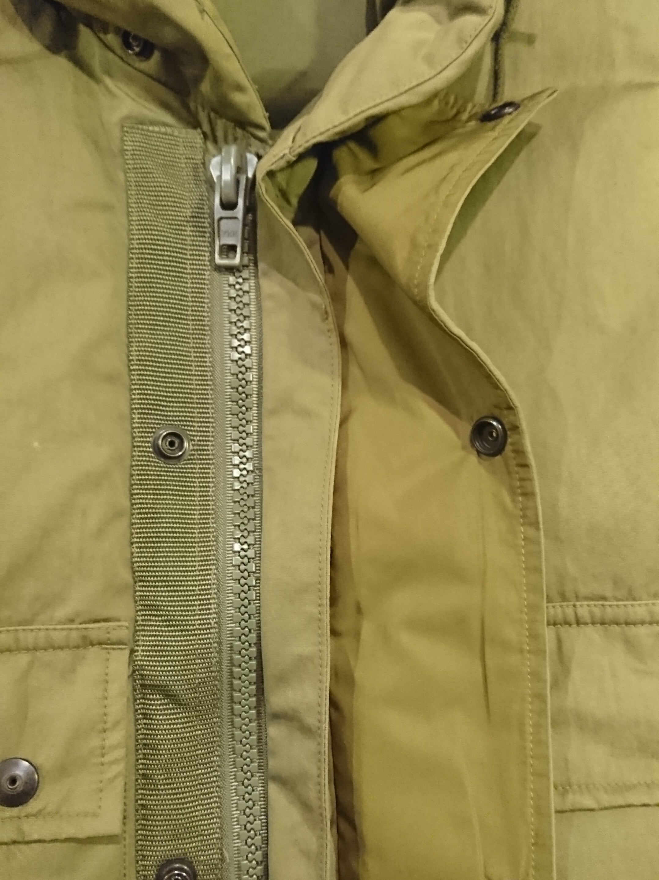 ミリタリーのライフベストを連想させるデザイン。首もとにジッパーがついており、フードは