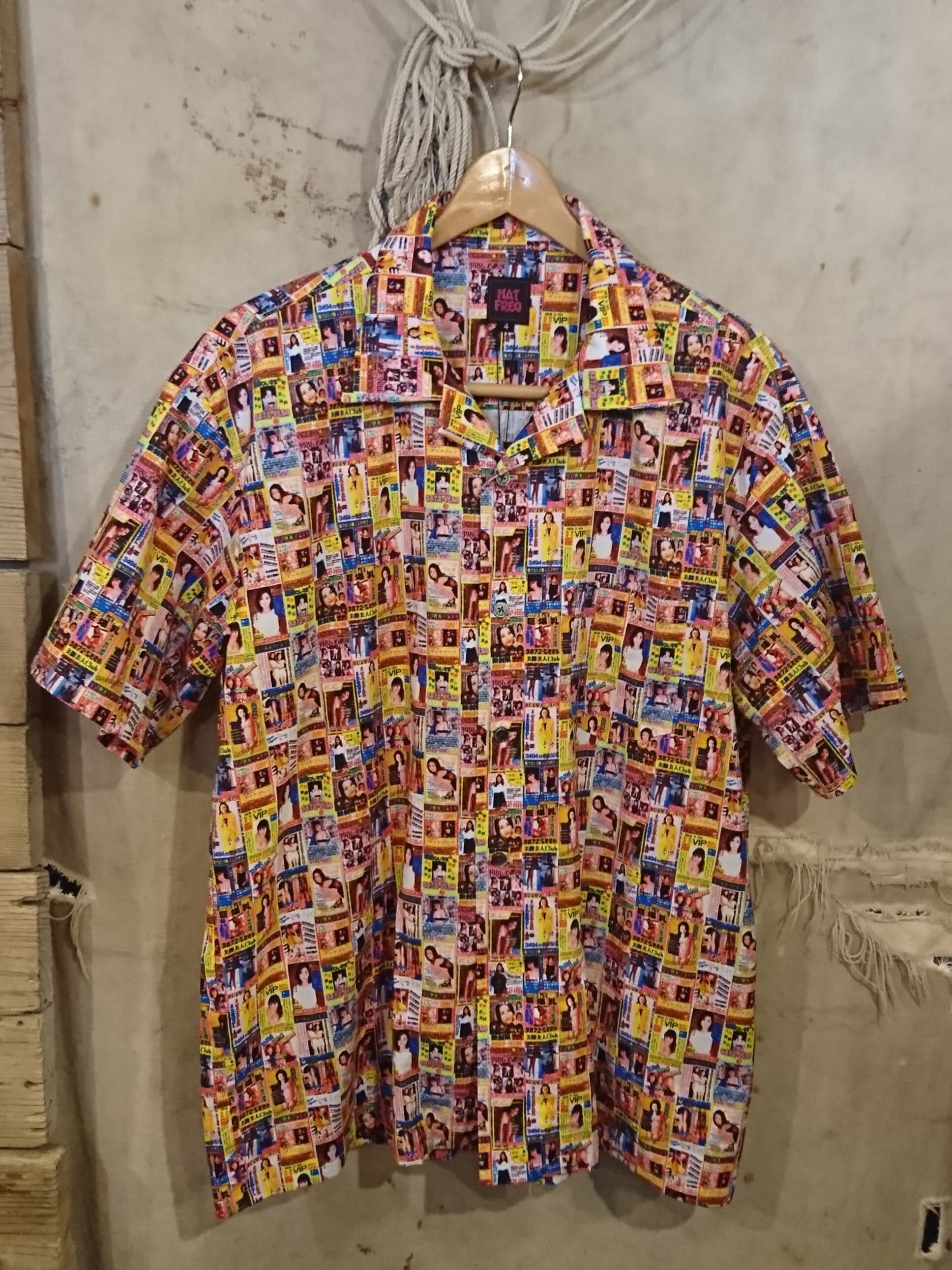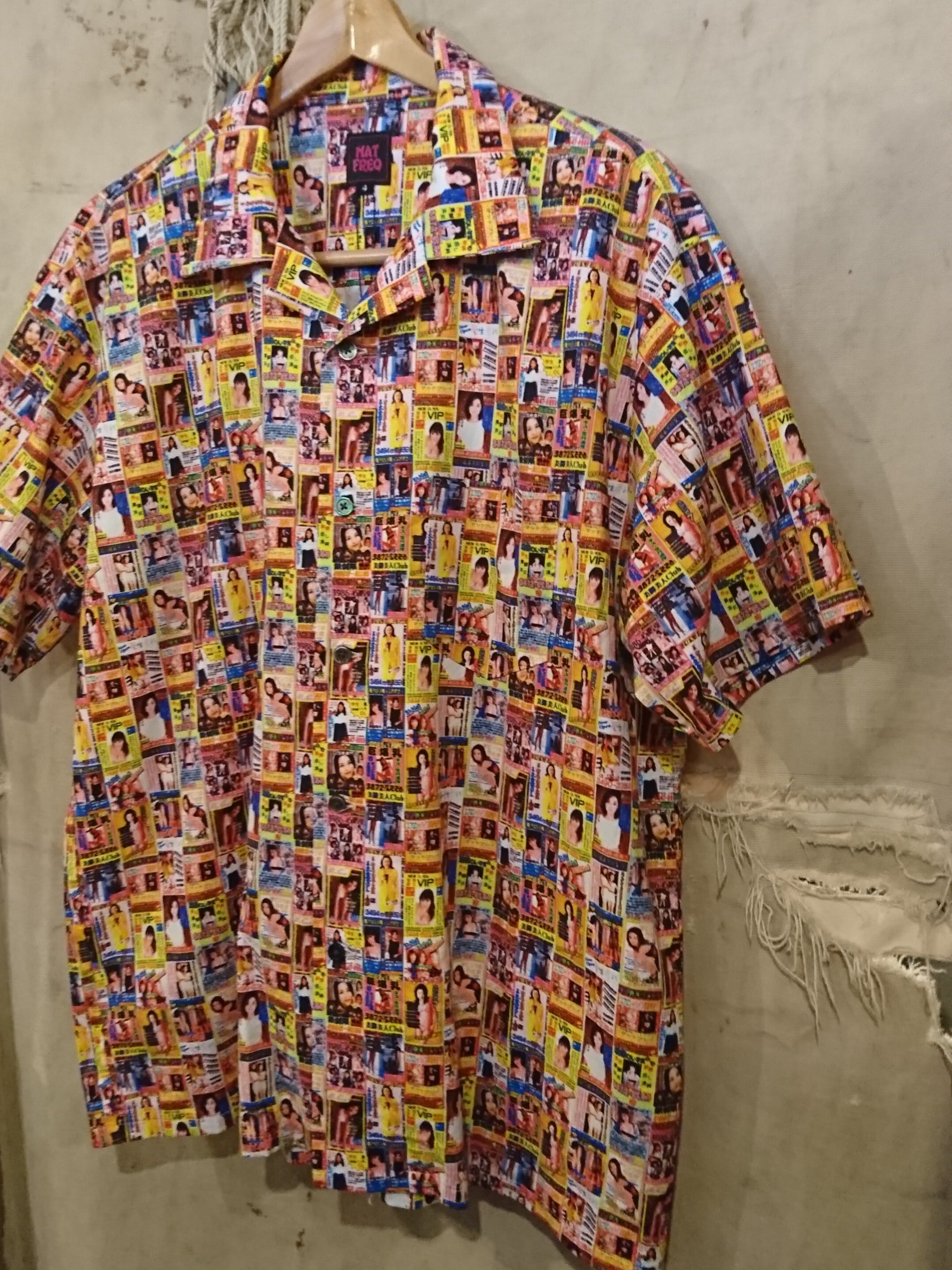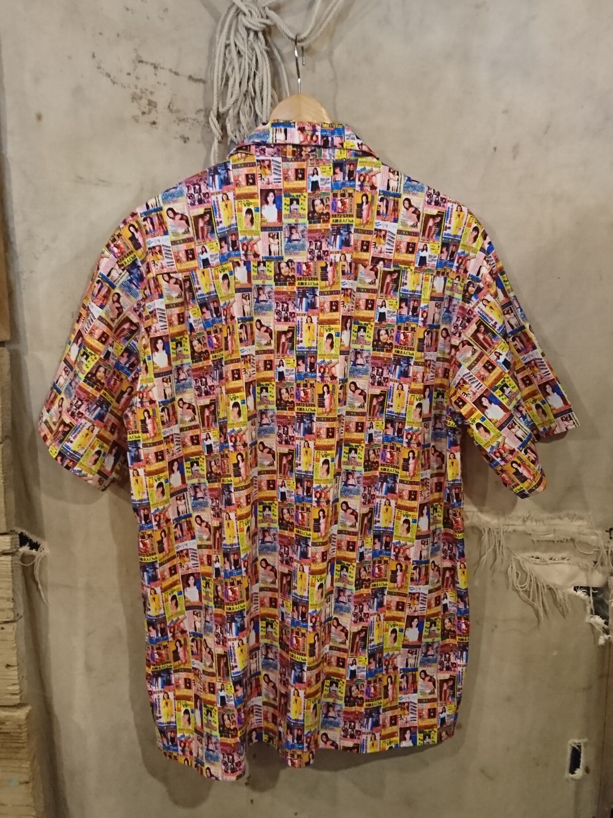 作成したオリジナルファブリックによるオーブンカラーシャツ。古着のPLAYBOYの総柄シャツを